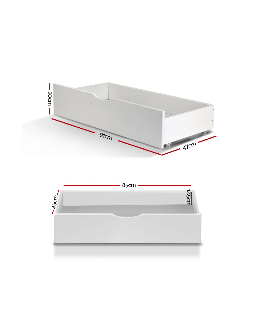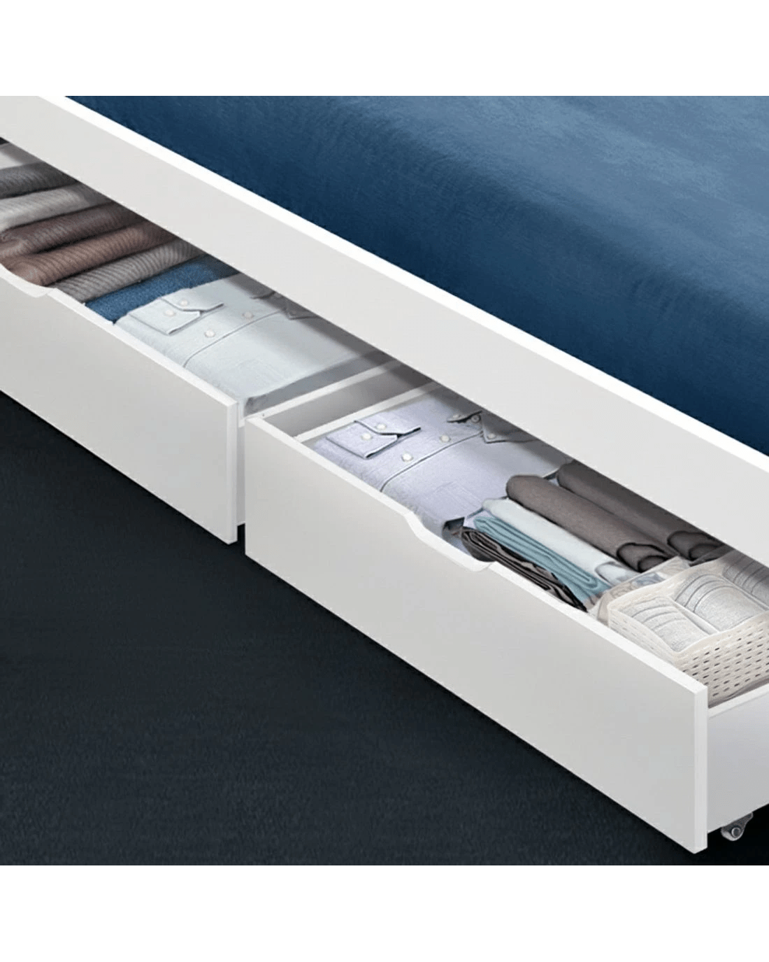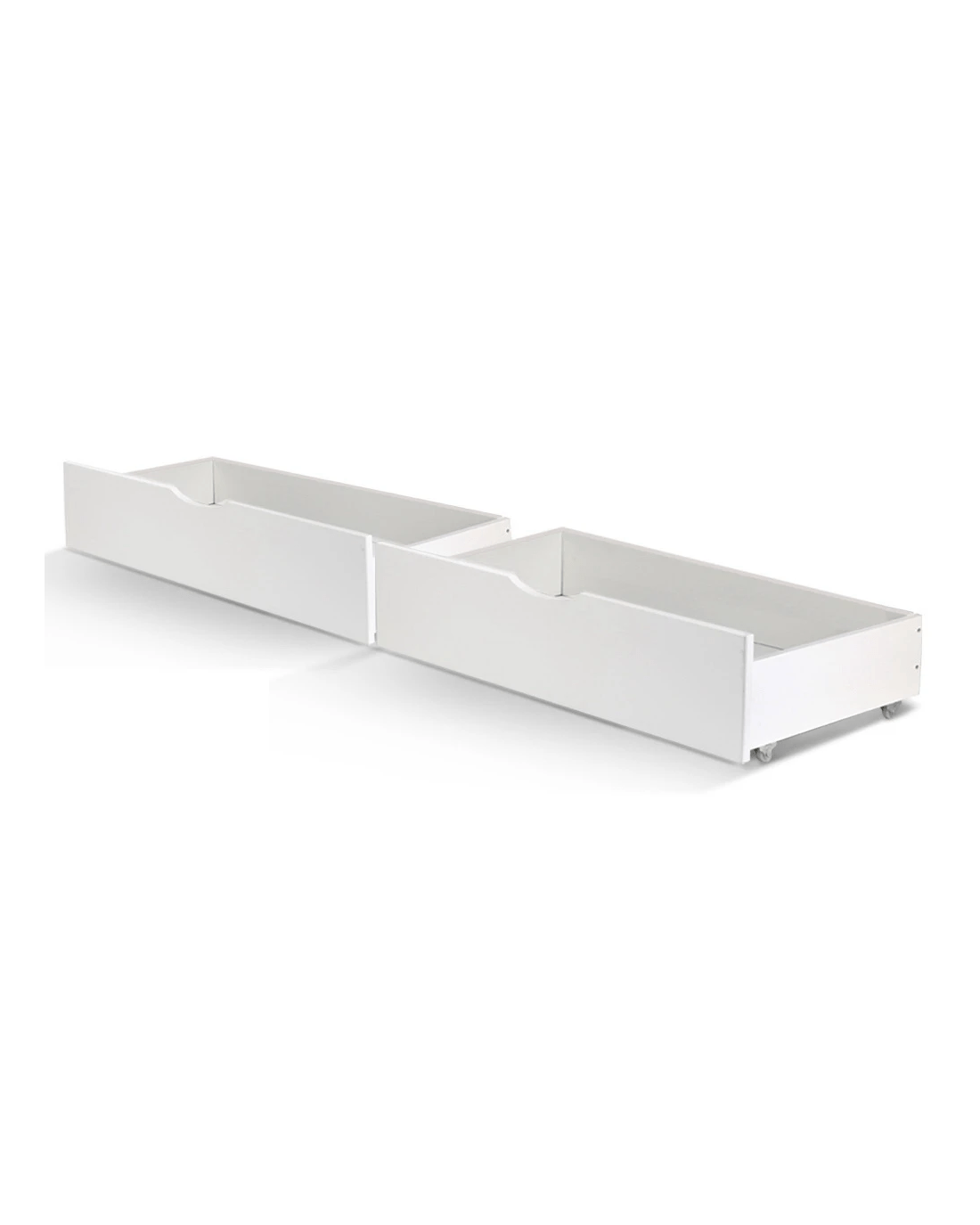 Designed to work with the Artiss Sofie Single Bed, the Trundle Drawers are also compatible with a large range of beds. Just check the relevant dimensions to ensure a good fit. Made of eco-friendly solid pine wood, the Trundle Drawers are strong and sturdy, with non-toxic finishes, safe edges and flush air gap handles, and fitted with smooth castors for hassle-free use. Use them to store anything under the sun, right under your bed. And thanks to its white contemporary design, the Trundle Drawers are an easy match for any bed décor. Go extra neat and tidy. Go under with the Artiss Trundle Drawers. Get yours today.
