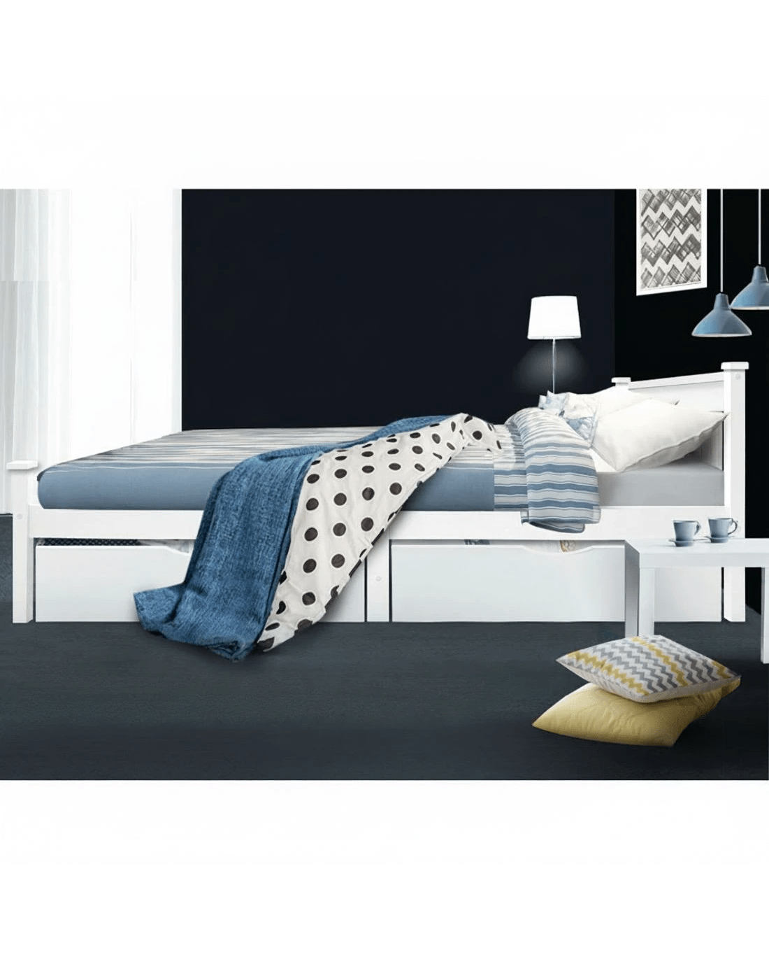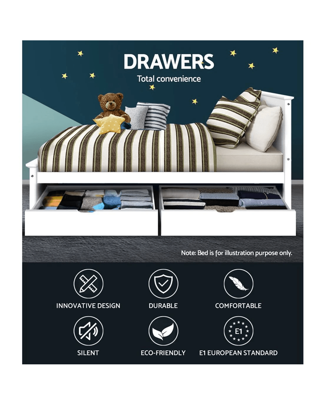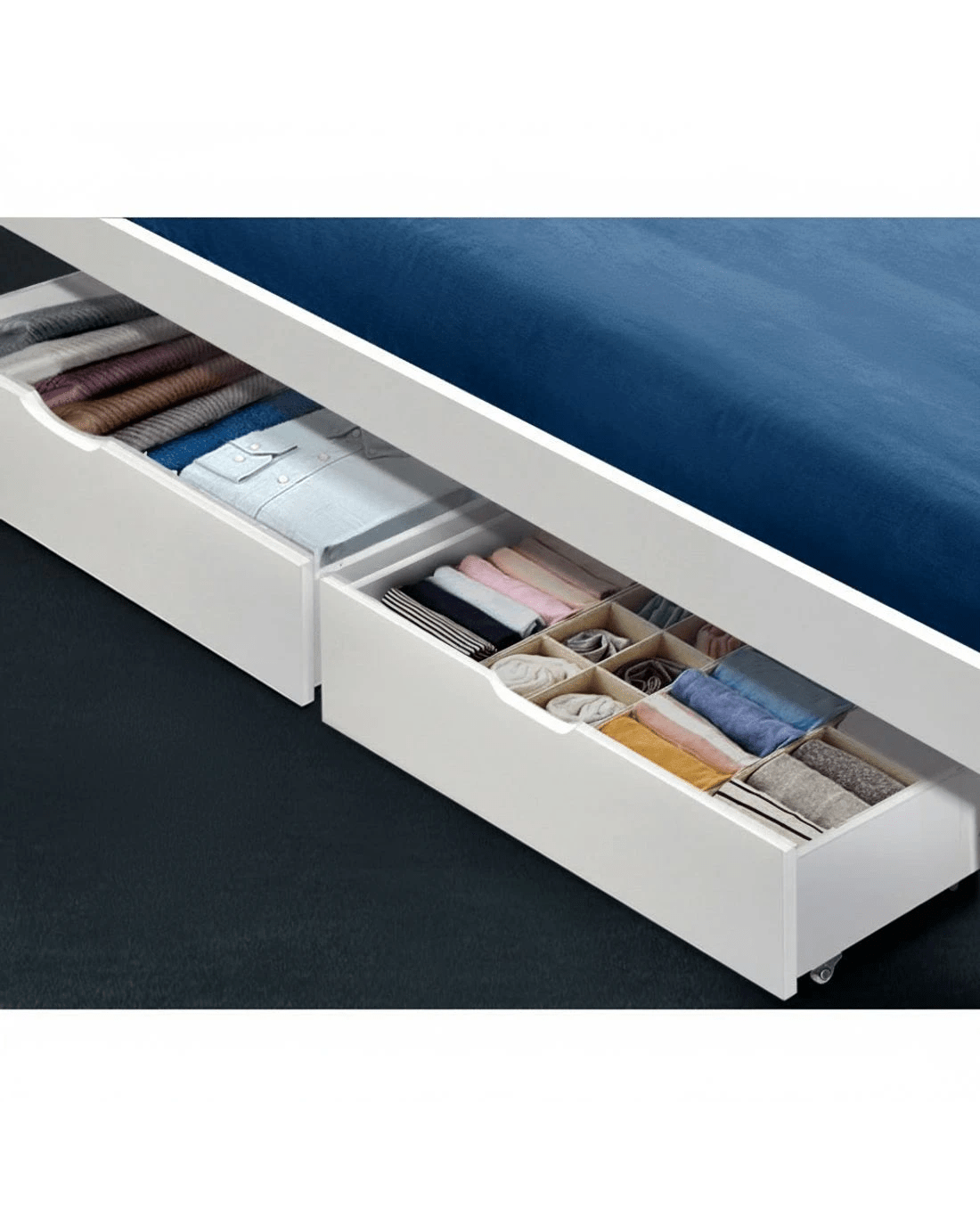 Designed to work with the Artiss Sofie Single Bed, the Trundle Drawers are also compatible with a large range of beds. Just check the relevant dimensions to ensure a good fit. Made of eco-friendly solid pine wood, the Trundle Drawers are strong and sturdy, with non-toxic finishes, safe edges and flush air gap handles, and fitted with smooth castors for hassle-free use. Use them to store anything under the sun, right under your bed. And thanks to its white contemporary design, the Trundle Drawers are an easy match for any bed décor. Go extra neat and tidy. Go under with the Artiss Trundle Drawers. Get yours today.