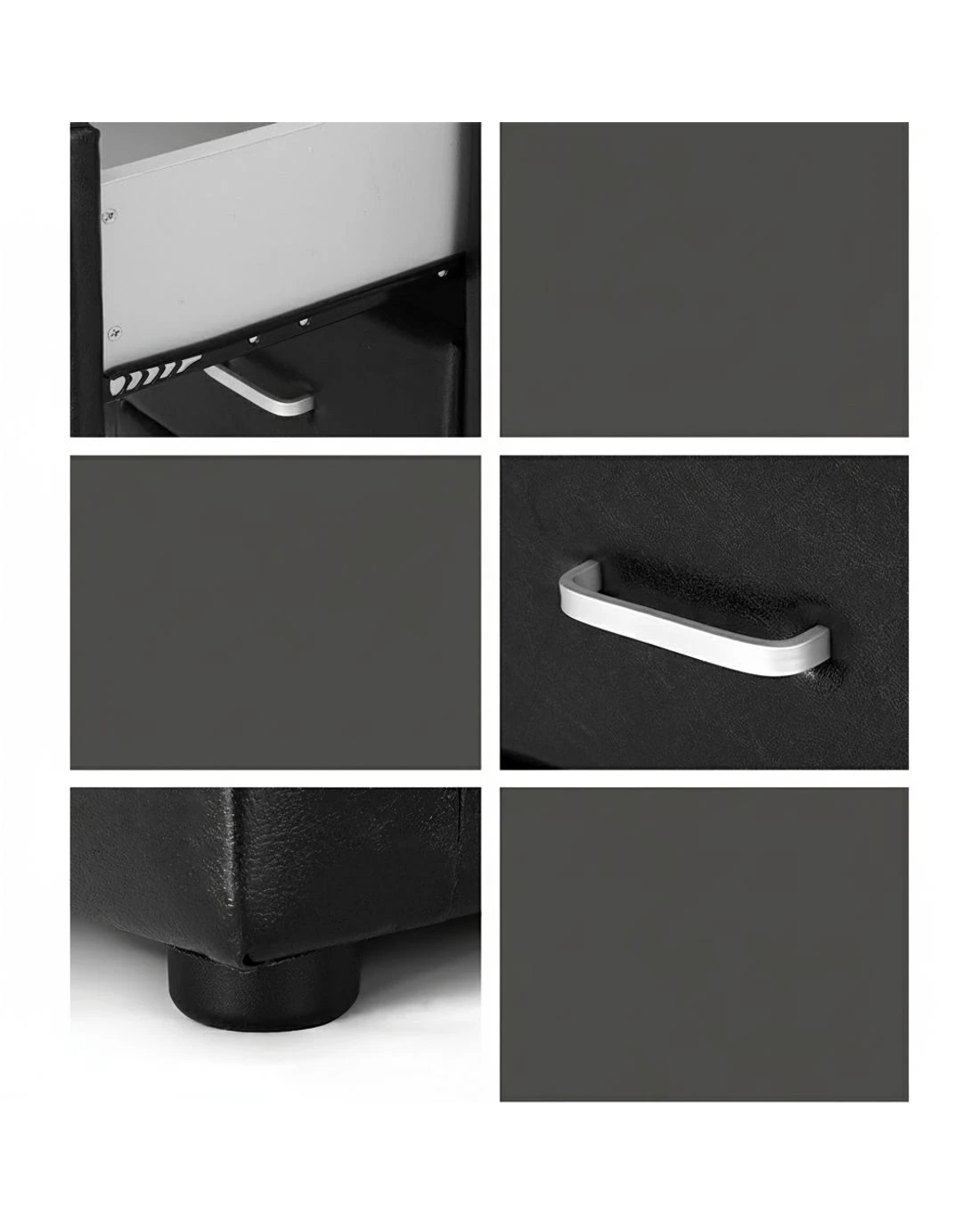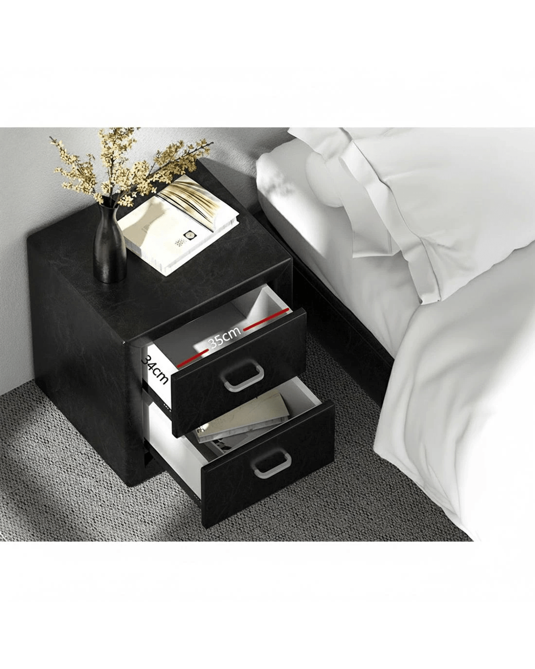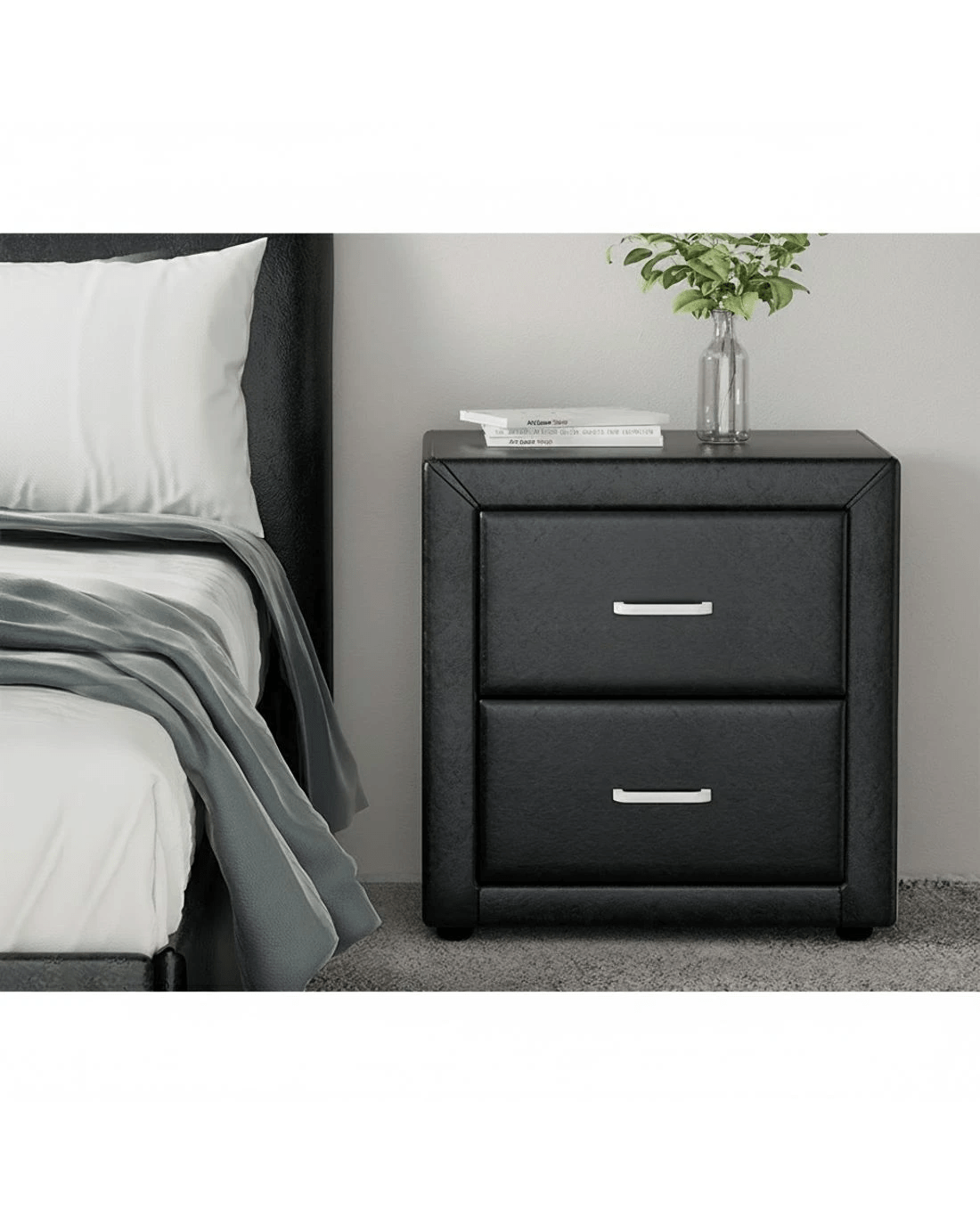 Simply designed with a PVC leather exterior, this bedside table is the perfect furniture to bring a modern style to your bedroom. The practical design consists of two large drawers, plenty of space to store your personal accessories and knick knacks. It features MDF panels with anti-rust coated metal draw runners and contemporary aluminium handles. An elite in quality and design, and a perfect addition to any home interior.