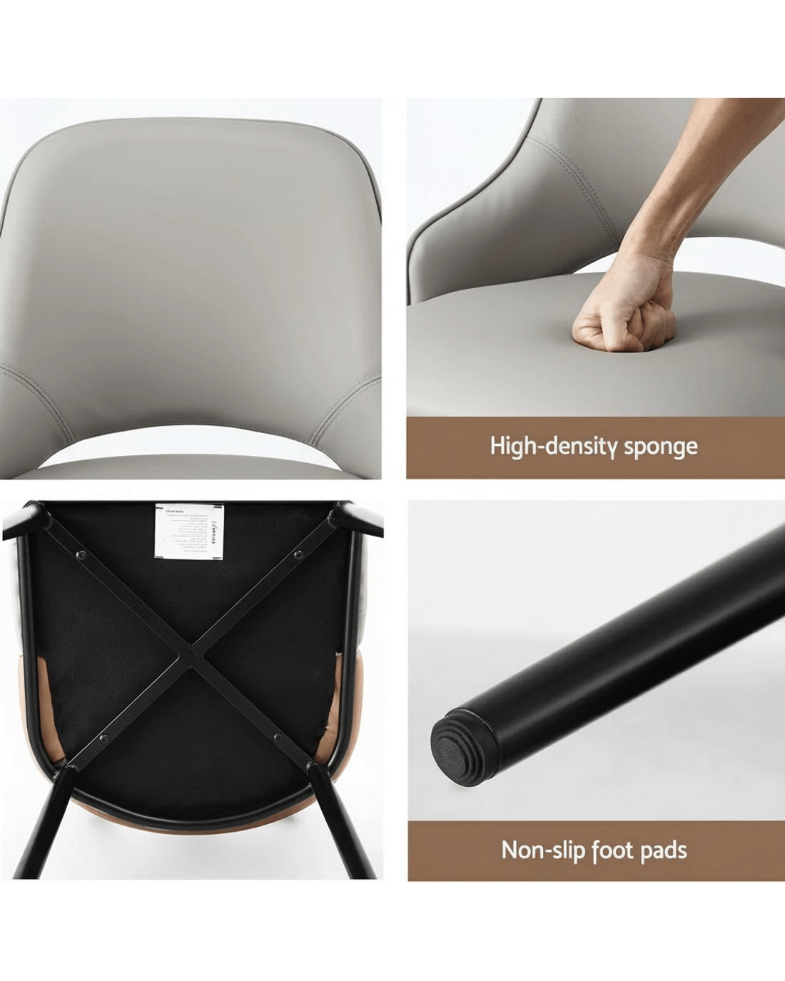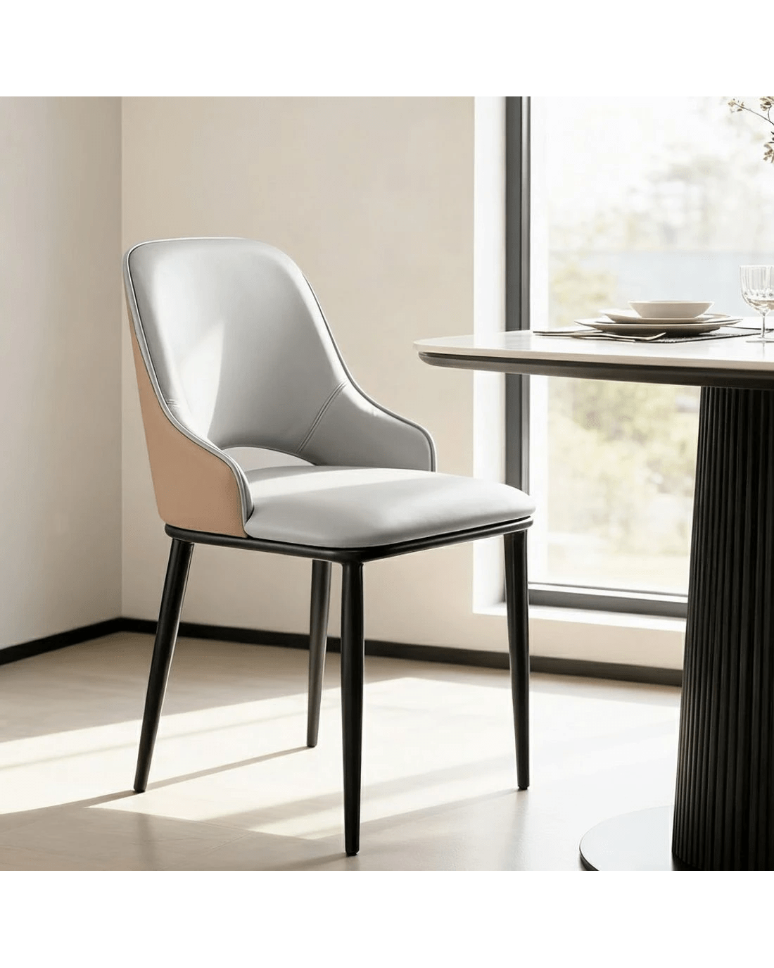 The seat is upholstered in durable PU leather, which is both chic and incredibly easy to maintain. Comfort is key, with an ergonomic curved backrest and a generously padded seat providing great support for relaxed dining or lounging.