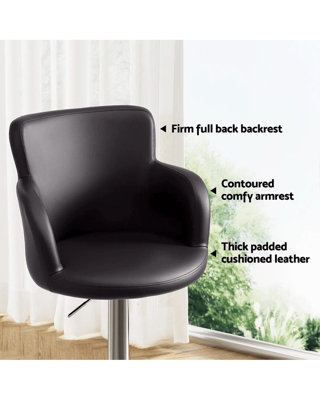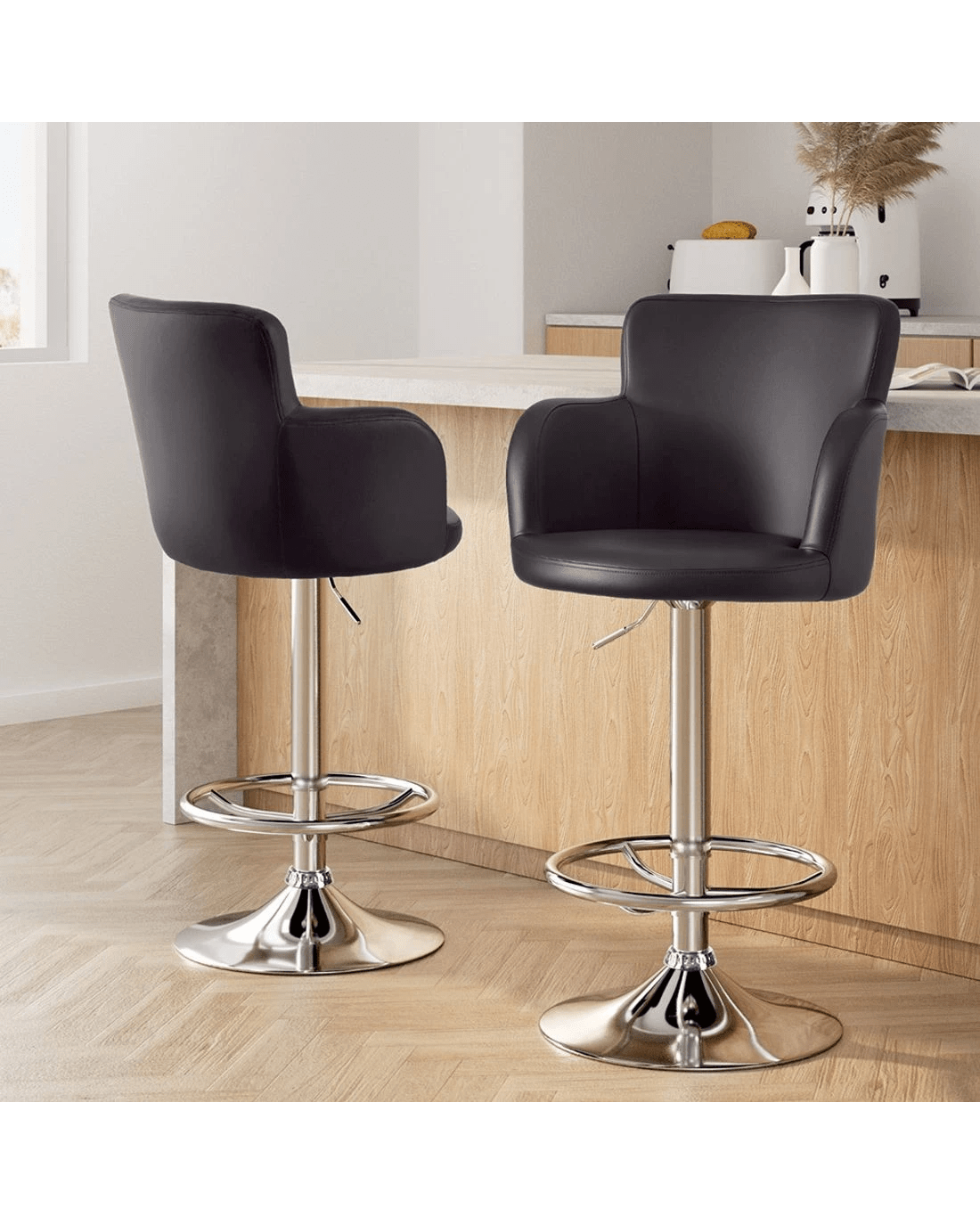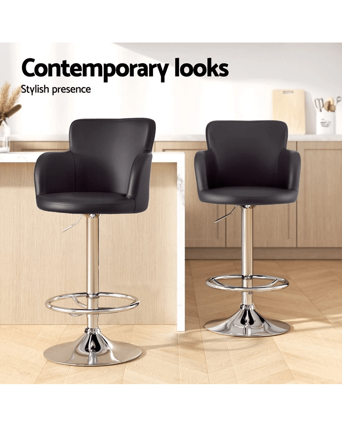 The Artiss 2x Leather Bar Stools combine modern functionality with enduring comfort for kitchen islands, breakfast bars, or entertainment spaces. Featuring luxe PU leather upholstery over plush foam padding, these swivel bar stools with full backrests provide all-day seating comfort. The SGS-certified gas lift lever allows effortless height adjustment, while the 360-degree rotation ensures easy mobility. Built with a corrosion-resistant chrome steel frame and stabilising base, these counter-height stools safely support up to 150kg. Complete with protective floor pads and tool-free assembly, they seamlessly blend durability with contemporary style in sleek black.