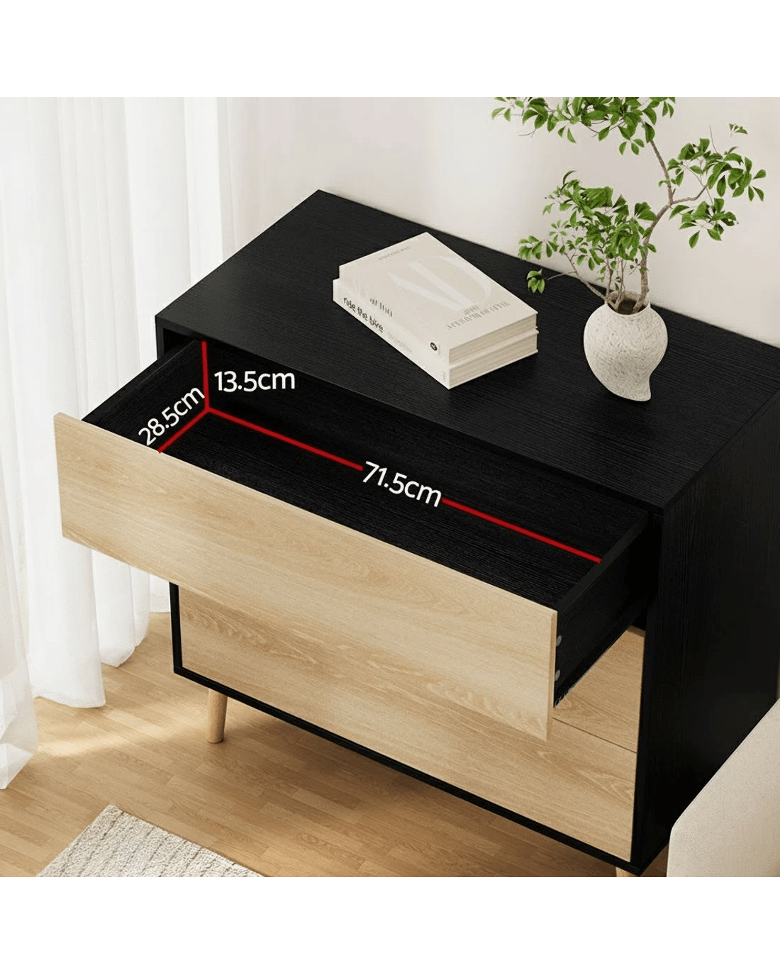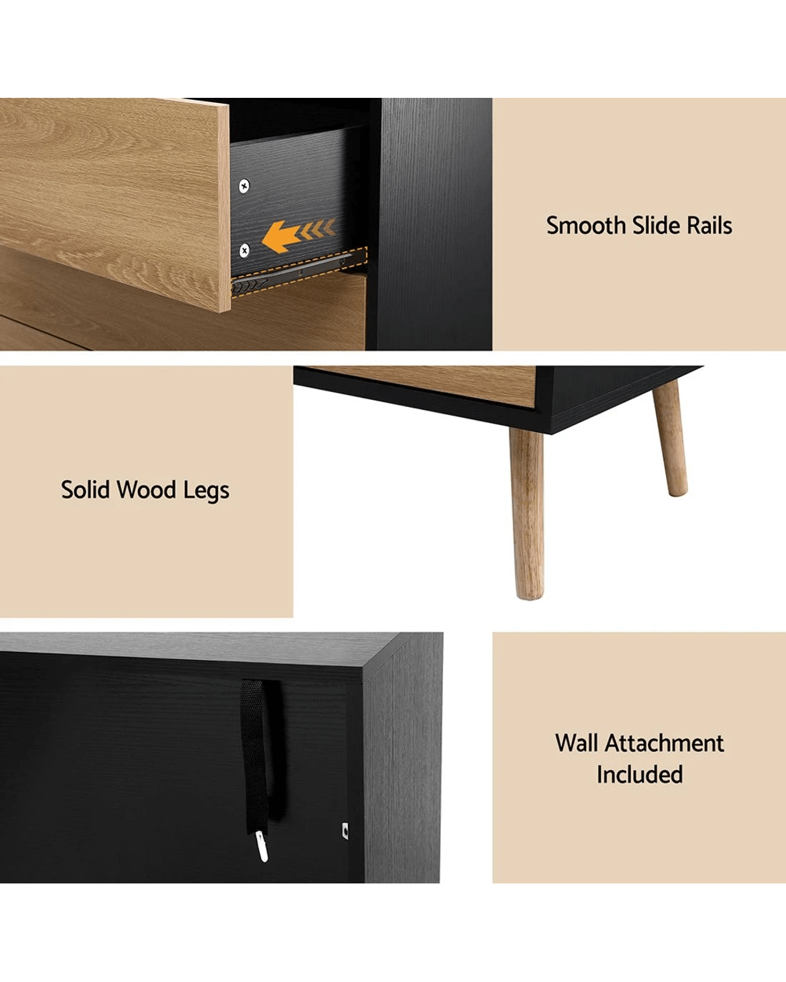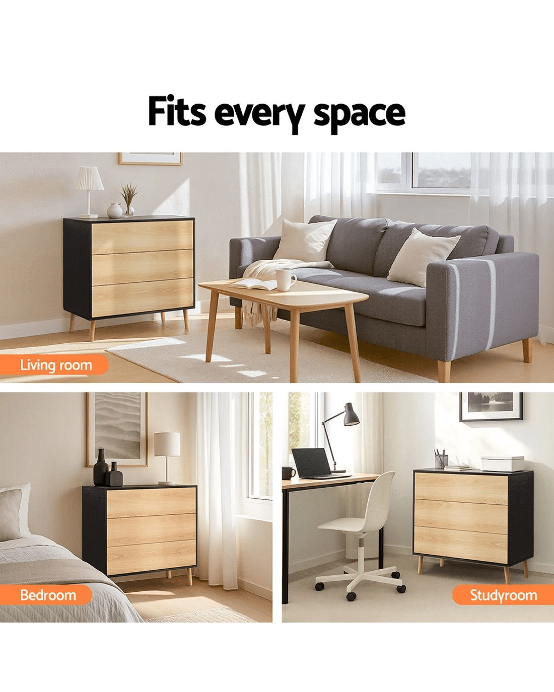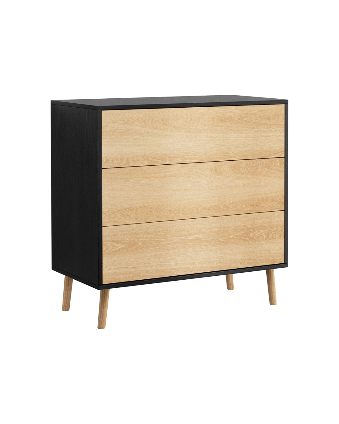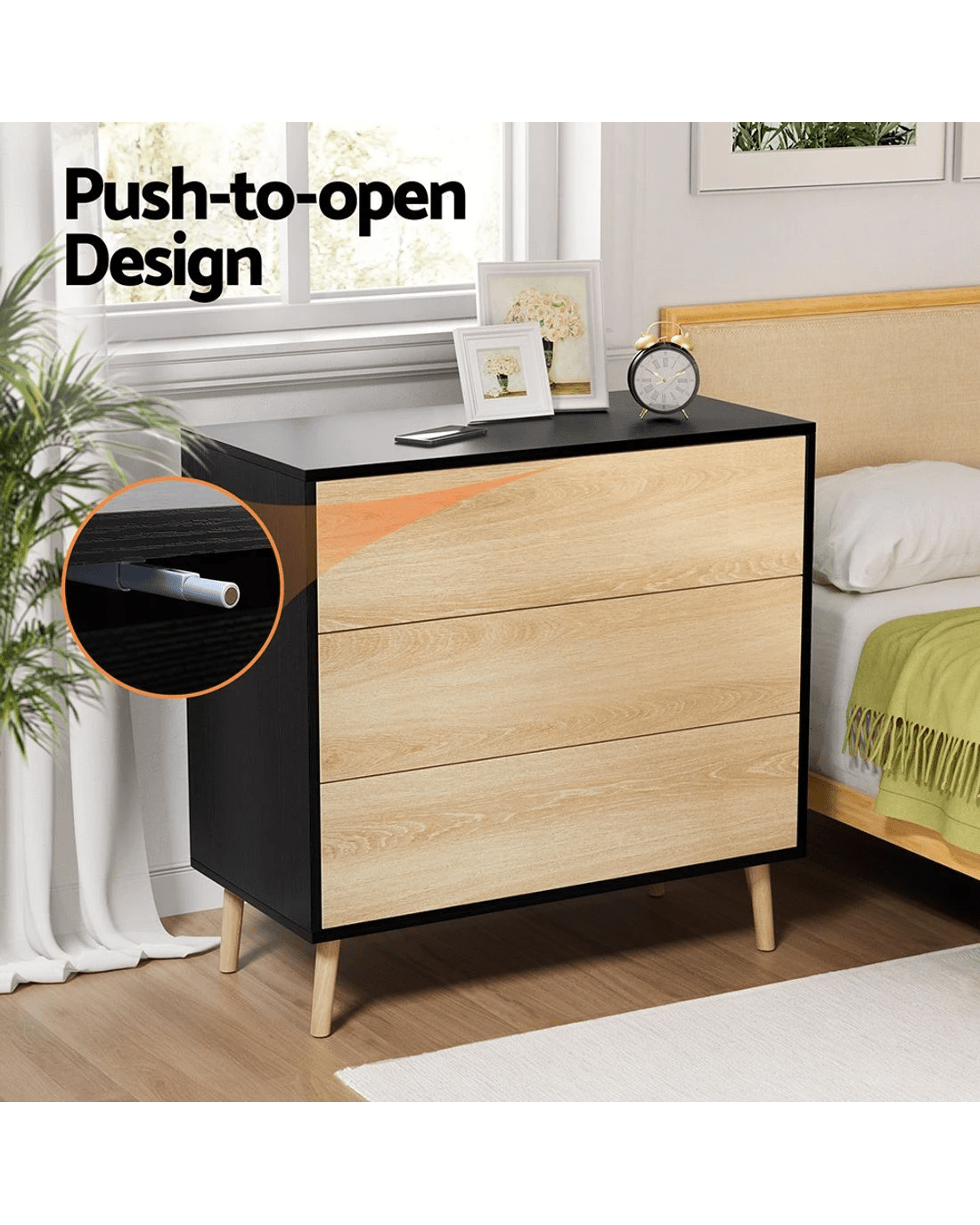 Artiss premium 3-drawer cabinet combines high weight capacity with push-to-open convenience, featuring smooth sliding runners and solid wooden legs. Crafted from E1 15mm PB with scratch-resistant melamine veneer finish, this versatile unit (80Lx 40Dx 80Hcm/cm) includes anti-tip kits for secure placement. Effortless assembly and wipe-clean surfaces make it ideal for bedroom, living room or office storage. Three full-extension drawers maintain easy access while complementing modern interiors.