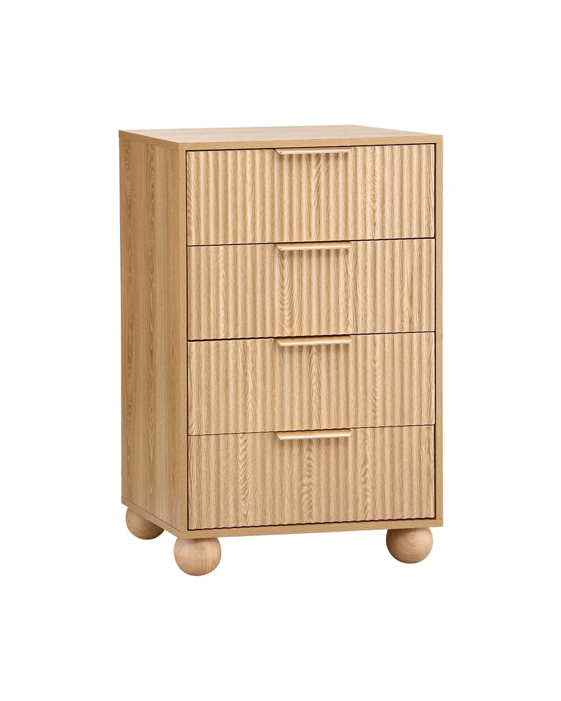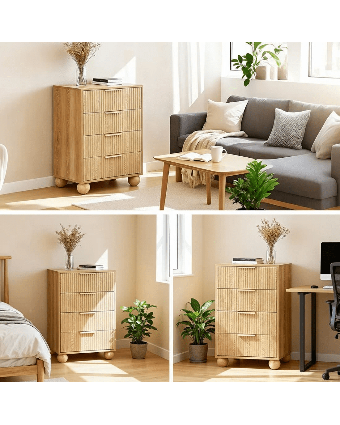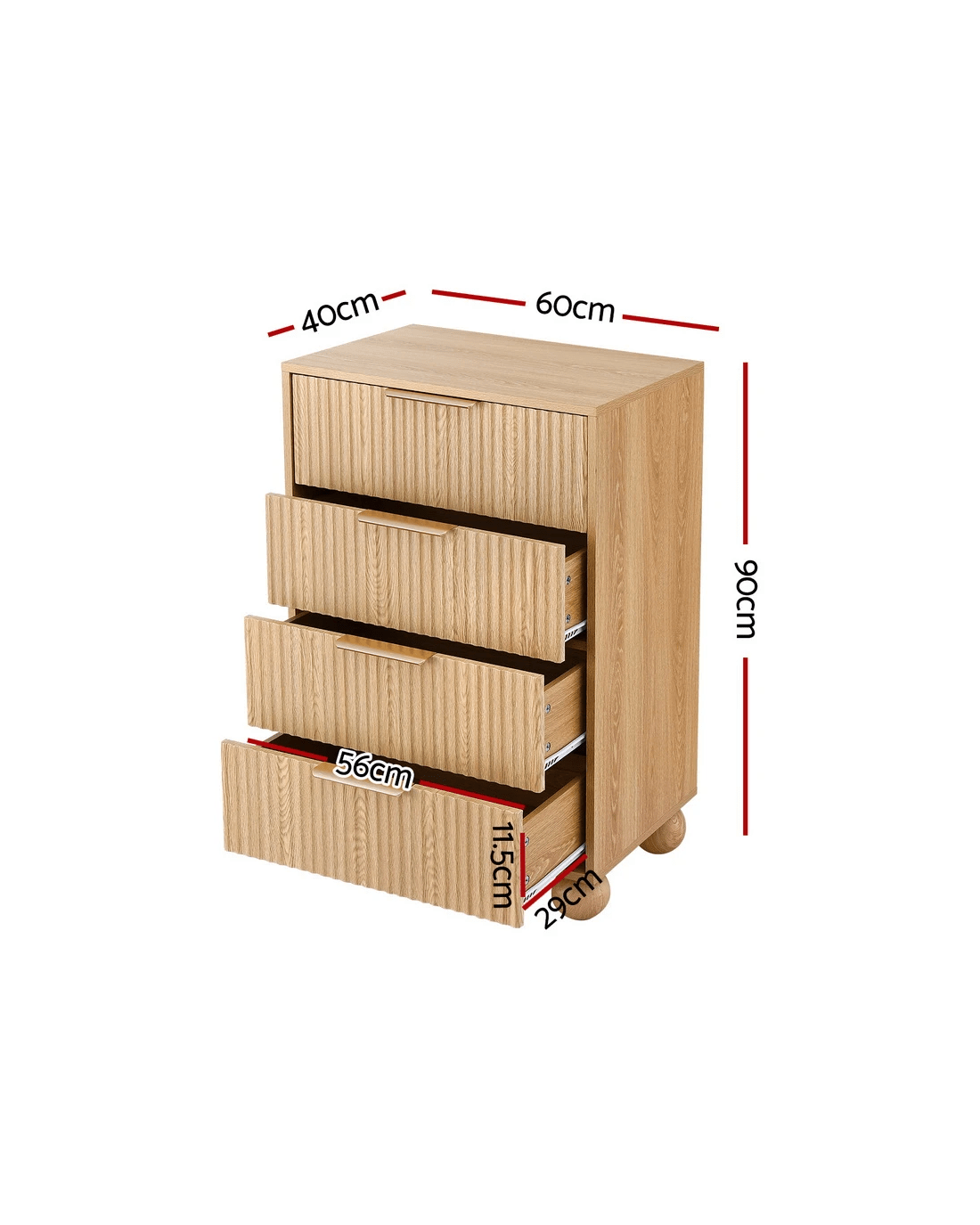 Elevate your Aussie home with the Artiss storage cabinet, a versatile solution featuring four smooth-sliding drawers fitted with sleek metal handles and framed by a elegant fluted-style front. Crafted from E1 grade 12/15mm particle board with a durable scratch and wear-resistant melamine finish, it stands sturdily on stylish ball-shaped legs suited for both timber and tiled floors.