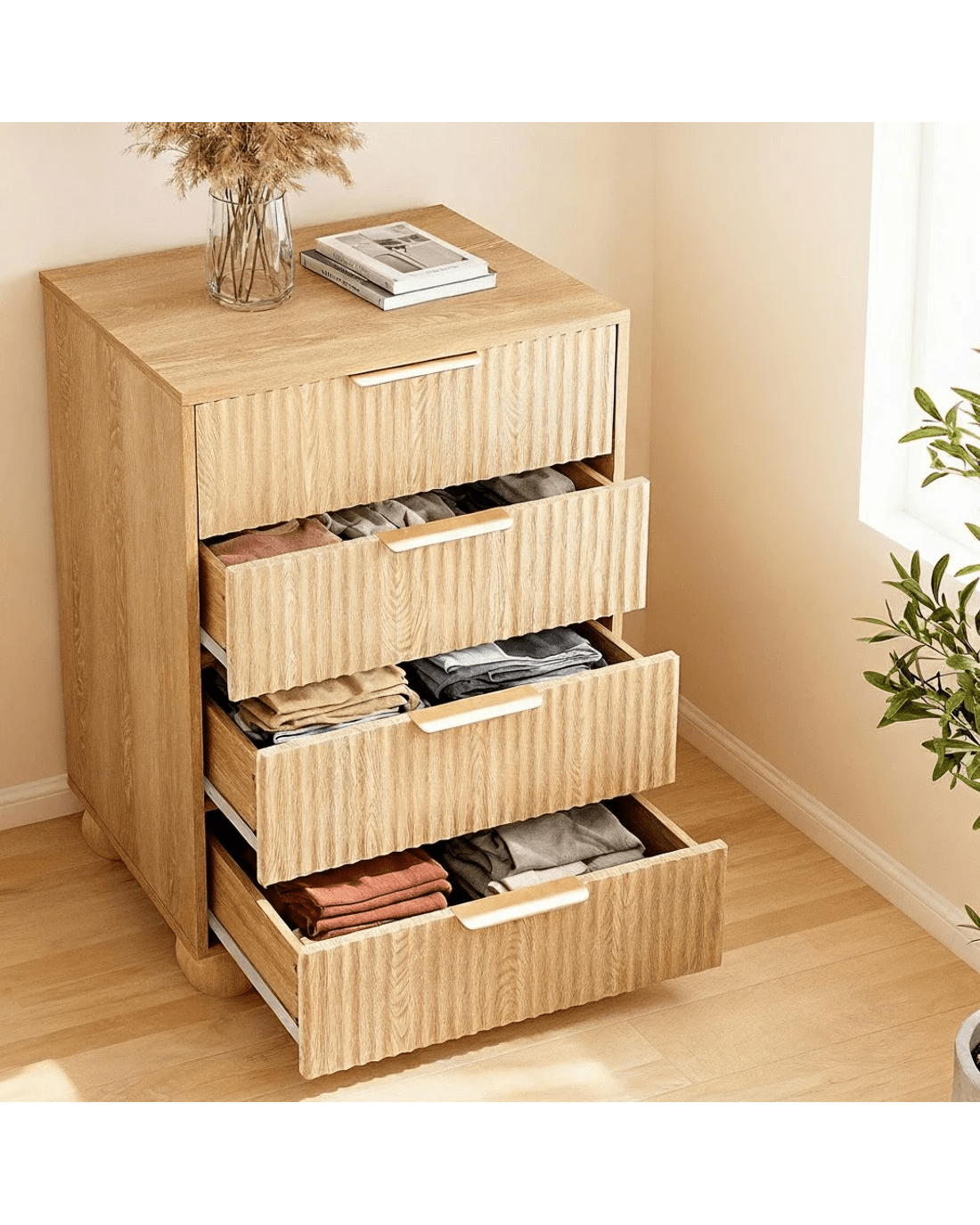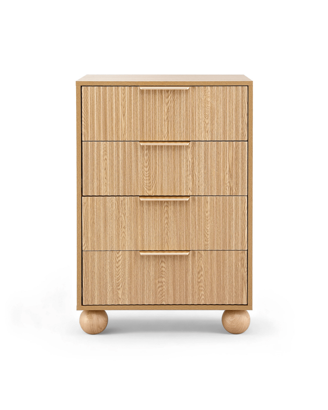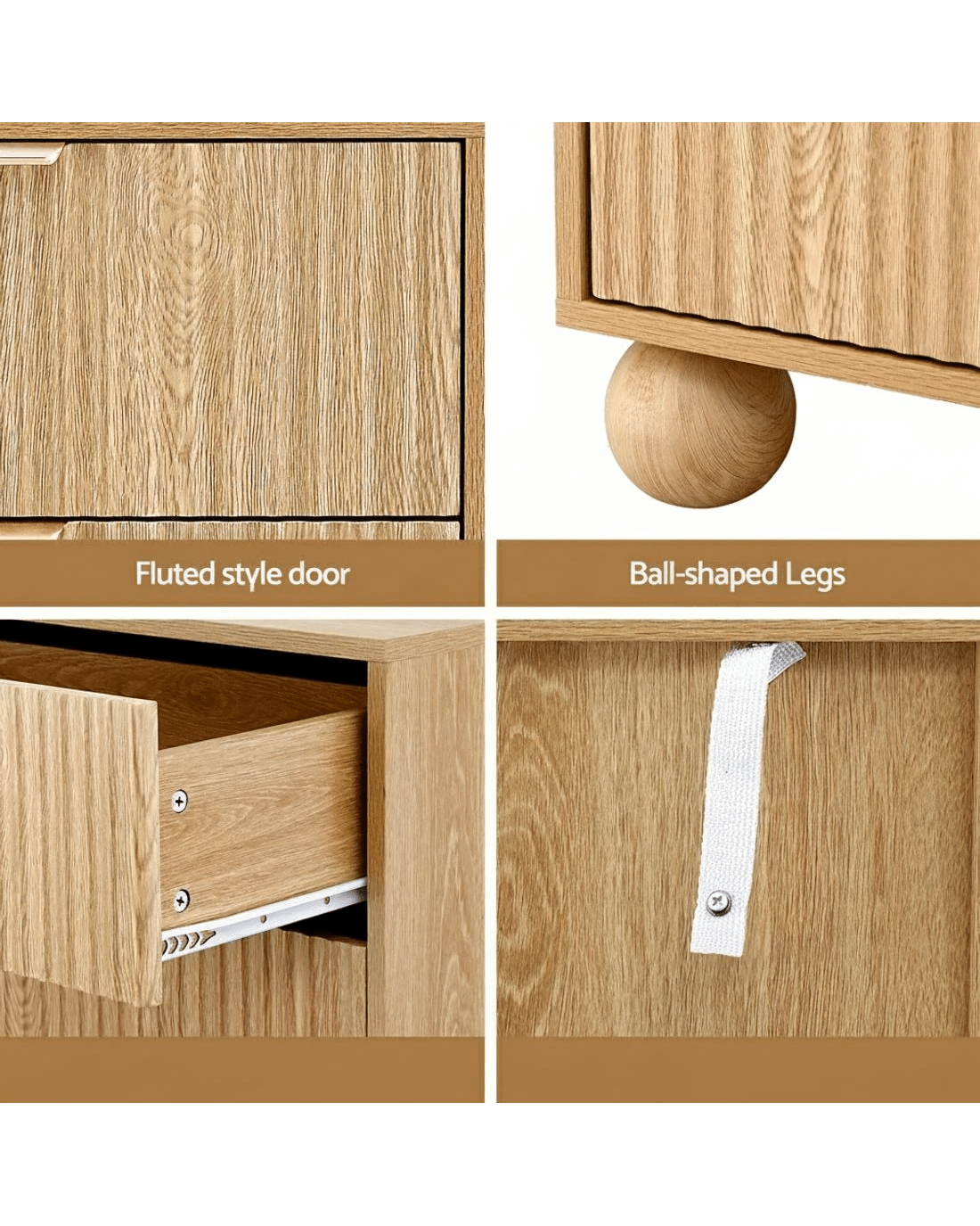 Elevate your Aussie home with the Artiss storage cabinet, a versatile solution featuring four smooth-sliding drawers fitted with sleek metal handles and framed by a elegant fluted-style front. Crafted from E1 grade 12/15mm particle board with a durable scratch and wear-resistant melamine finish, it stands sturdily on stylish ball-shaped legs suited for both timber and tiled floors.