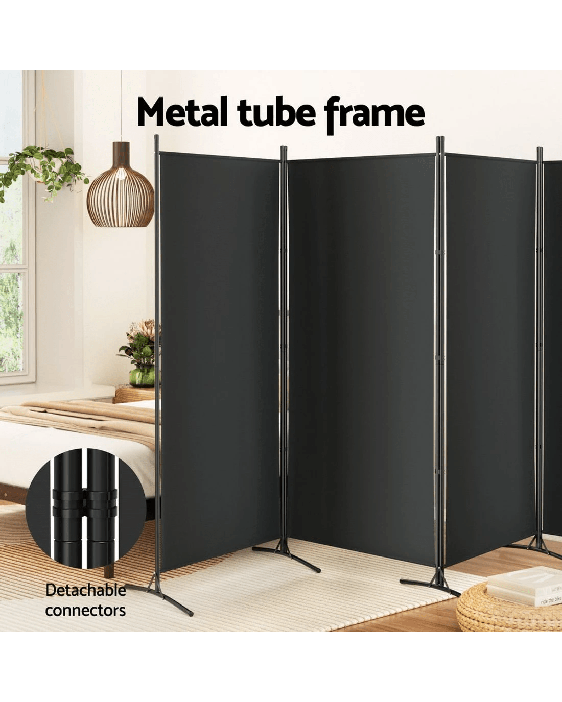 Experience refined versatility with our Artiss 4-panel Room Divider. The divider features a sturdy frame crafted from powder-coated metal tubes, and each panel is made from polyester for a stylish blackout look. The dual-sided design will compliment any home, office or commercial building. With durable and detachable connectors, it promises flexibility and space efficiency. The panels are washable in case of stains or dirt. Whether seeking privacy, decoration, or a subtle partition, the Artiss 4-panel Room Divider is the epitome of elegance tailored to your needs.