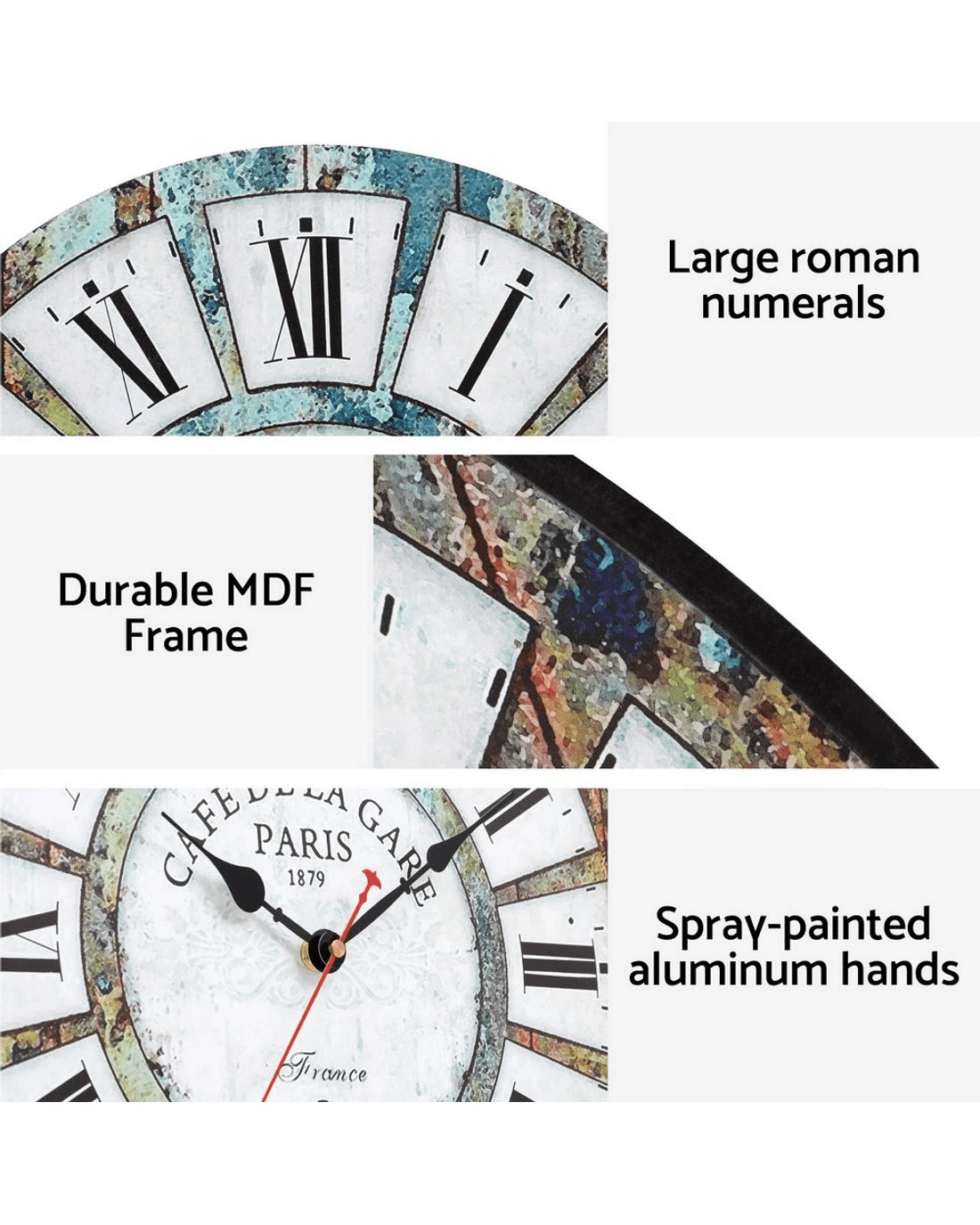 Elevate your home decor with our charming Artist Wall Clock, a perfect blend of style and functionality. This large MDF timepiece boasts a country retro design that adds a touch of nostalgic elegance to any room. With its clear Roman numerals and spray-painted aluminum hands, this clock not only tells time accurately but also serves as a striking focal point on your wall.