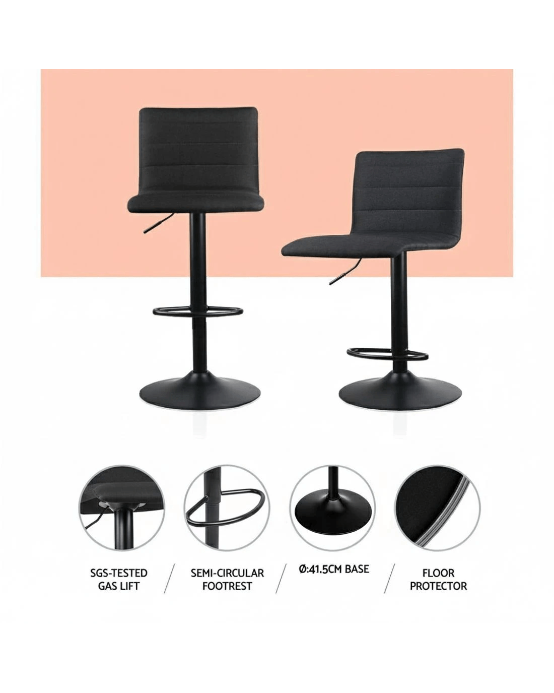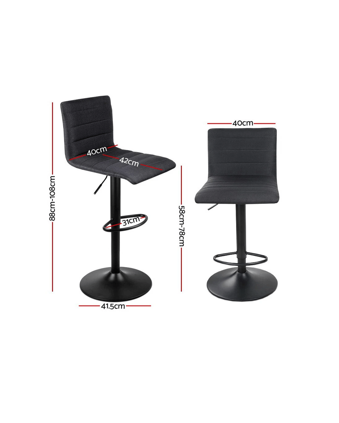 Made with premium linen fabric and filled with high density foam, our Fabric Bar Stools marry plush comfort with sophisticated style to match your décor seamlessly. Whether it's for the home kitchen, bar or café, our Fabric Bar Stools are a perfect fit and designed to last with its powder-coated anti-corrosion metal stand. An adjustable height of between 88 and 108cm with the delicate gas lift lever allows you to sit well and steady with minimum fuss against the low back support. A heavy-duty footrest adds to the comfort factor too. Not least, the Bar Stool swivels 360° and a floor protector at the base ensures that a scratch never ever sees the light of day on your flooring.