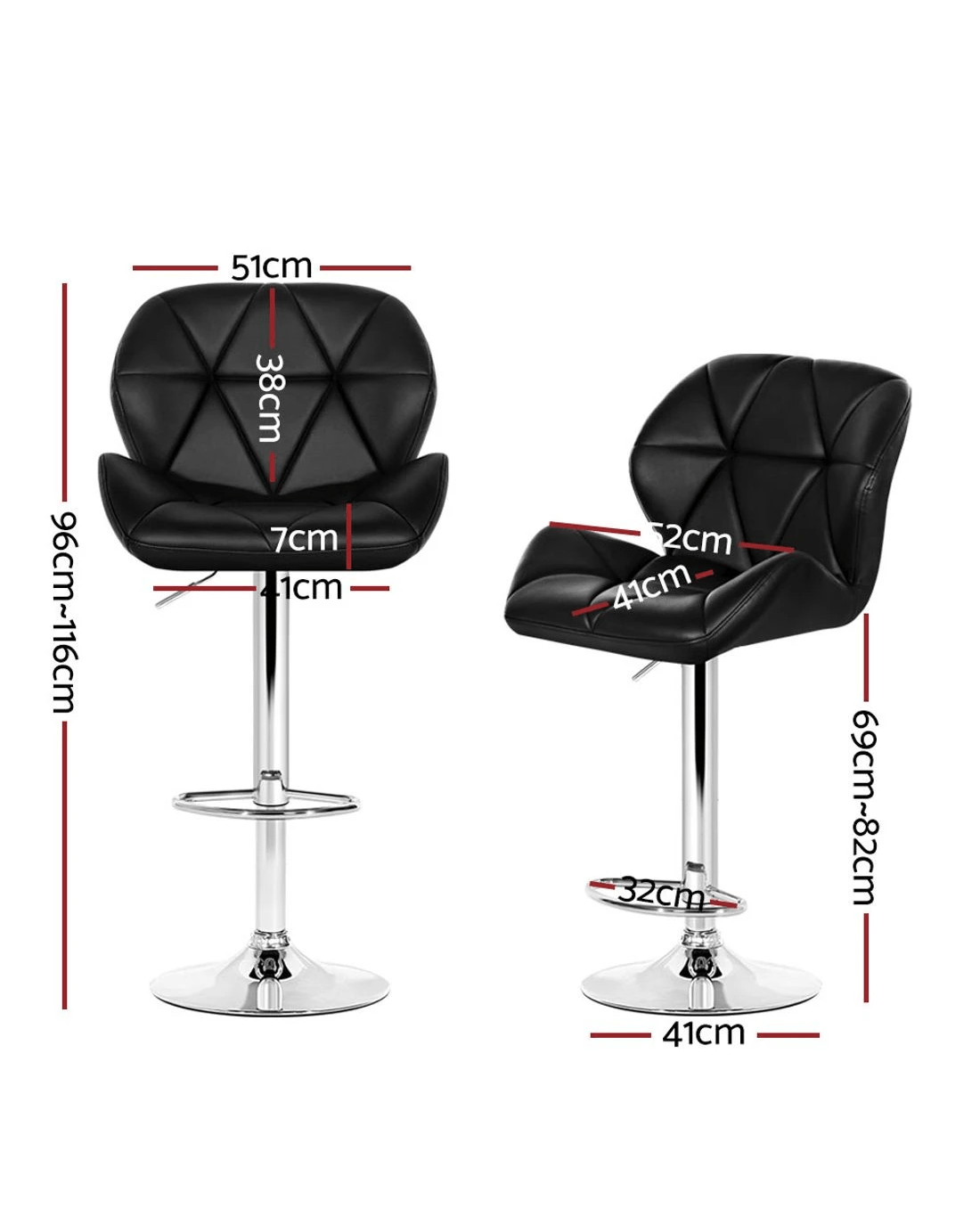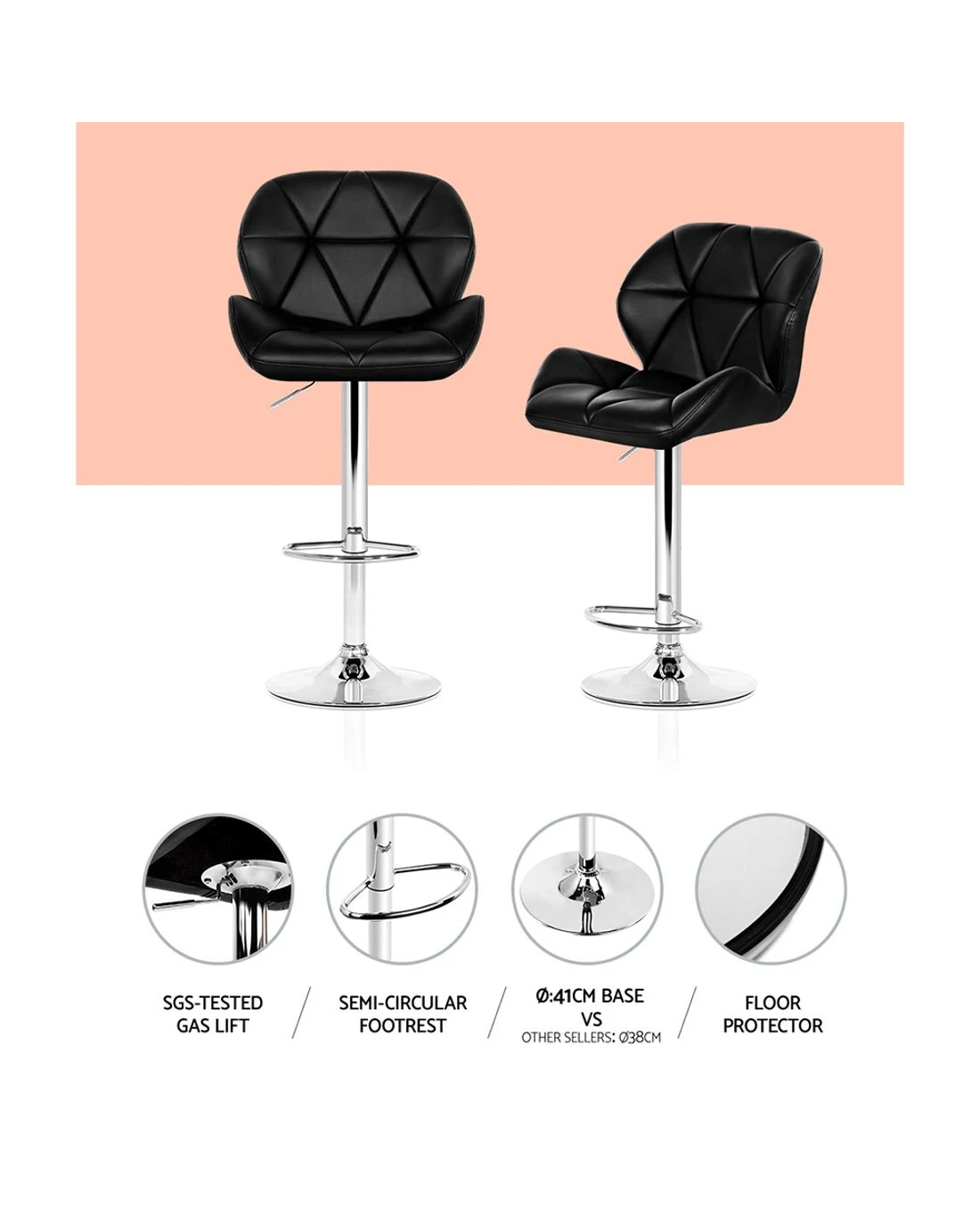 Chill out and relax with our Artiss Jorn Bar Stool. With its classic design and contemporary good looks, the bar stool is must for every discerning home-proud person. Upholstered in faux leather, the bar stool also features an extra thick foam padding for ultimate comfort. The contoured rhombus-motif backrest also adds a touch of class to its inherent charisma. The semi-circular footrest ensures relaxed sitting while the omni-directional seat makes for easy turn to any facing. Better still, the height can be easily adjusted with the SGS-tested gas lift and the large base ensures stability at all times. Not least, a floor protector under the base helps to keep your pristine floor scratch-free at all times.