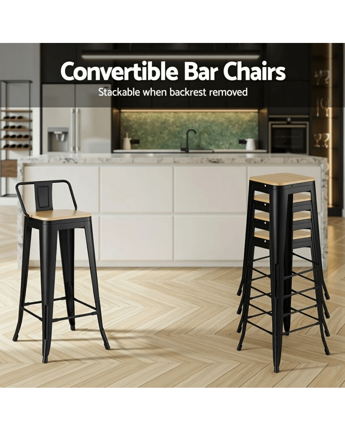 These chic industrial bar stools are designed to complement both modern and rustic interiors. Built with a premium MDF seat and a sturdy metal frame, they ensure durability and a weight capacity of up to 120kg per stool. The stackable design makes them perfect for compact storage, while the powder-coated footrest and splayed retro legs enhance stability and visual appeal. Easy to assemble and equipped with anti-slip floor protectors, these stools are ideal for your kitchen, bar, or dining area.