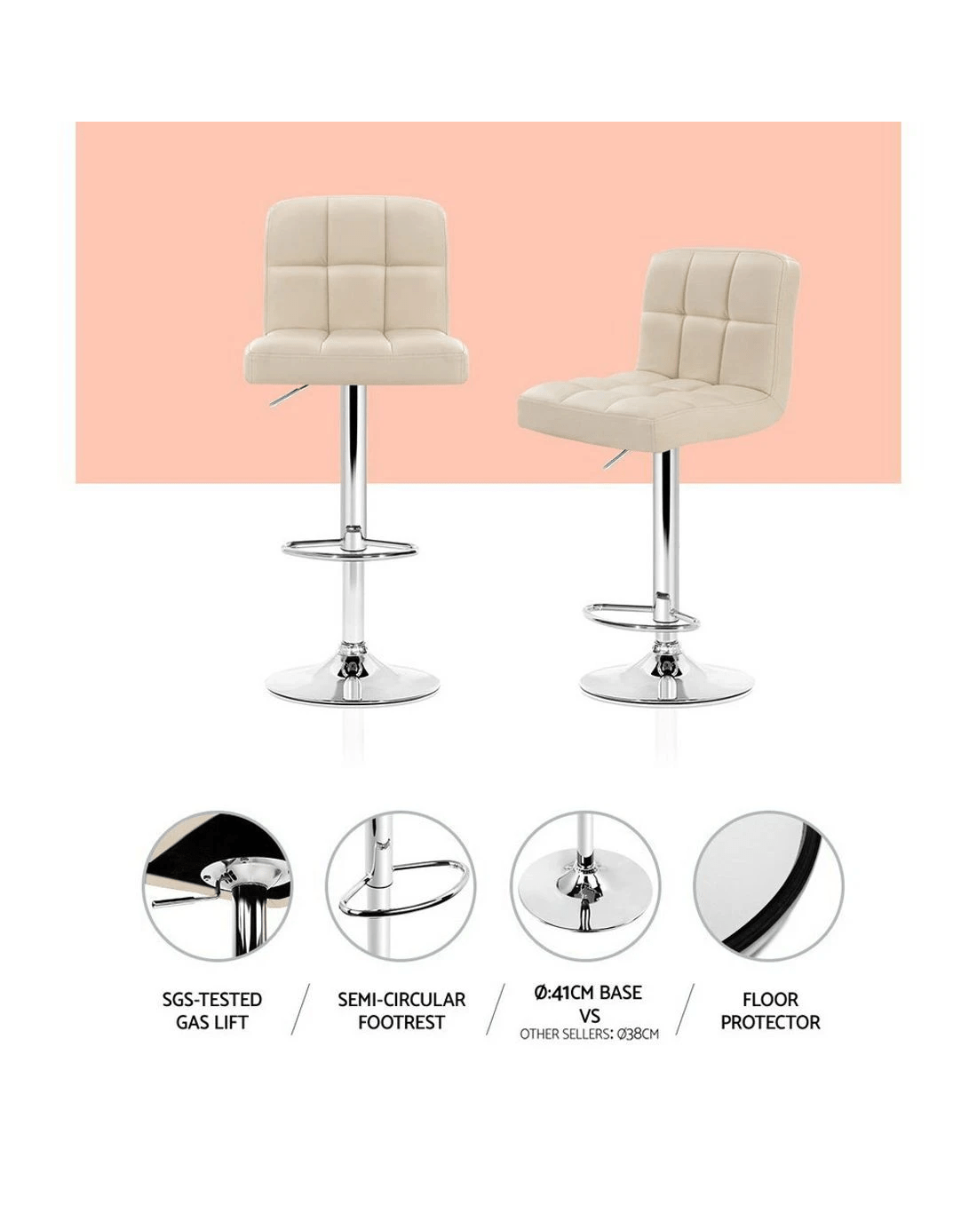 Chill out and relax with our Artiss Noel Bar Stool. With its classic design and contemporary good looks, the bar stool is must for every discerning home-proud person. Upholstered in faux leather, the bar stool also features an extra thick foam padding for ultimate comfort. The Checkered backrest also adds a touch of class to its inherent charisma. The semi-circular footrest ensures relaxed sitting while the omni-directional seat makes for easy turn to any facing. Better still, the height can be easily adjusted with the SGS-tested gas lift and the large base ensures stability at all times. Not least, a floor protector under the base helps to keep your pristine floor scratch-free at all times.