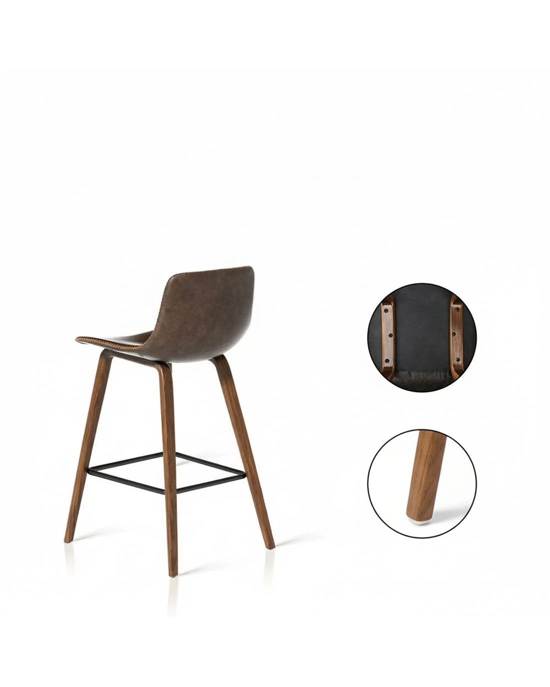 Meticulously crafted with solid wood in a stunning walnut finish for the legs, the Bentwood Bar Stool features a generous puckered faux leather integrated seat and backrest that feel comfortably smooth and look absolutely classy. The mid-height backrest also provides appreciable support while the anti-slip rubber pads at the bottom of the legs remain firm and steady even with robust use. Not least, the powder coated metal footrest rectangle lets you perch in style, feet up.