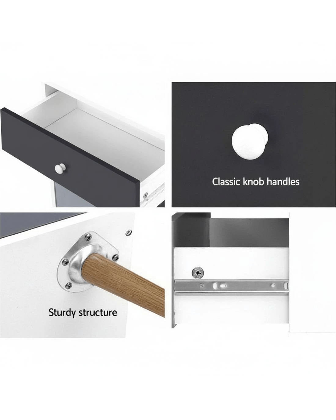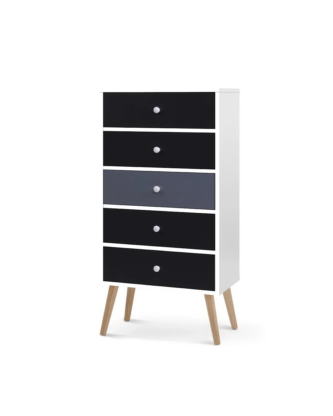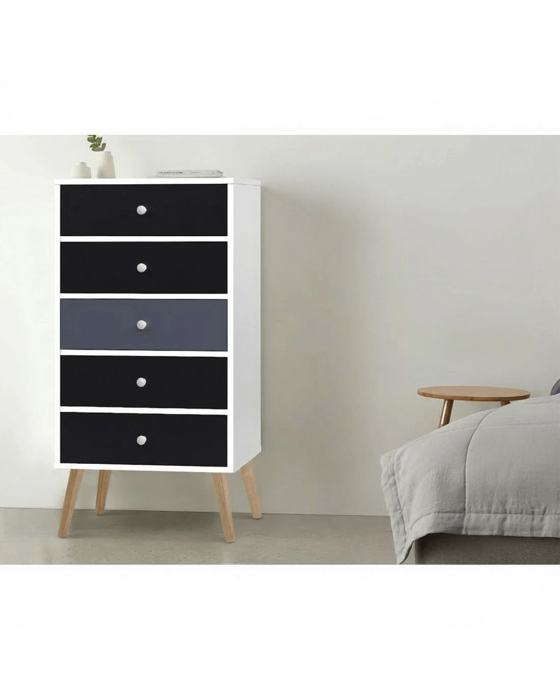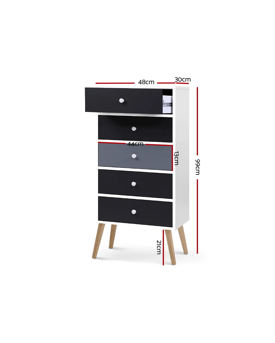 A design that is Scandinavian-inspired and while still reminiscent of decades-old influences, our Artiss 5-drawer Tallboy offers full functionality with subtle style. Made from quality particle board and a smooth paper veneer finish, the two-tone tallboy adds chic appeal to your décor and is the perfect choice to grace a dressing room, bedroom, living room or any other space in your home or establishment. The five generous-sized drawers provide ample space for all your clothing, fashion accessories, personal essentials and more. The splayed legs offer a unique, reliable stance, while the classic knob handles and smooth anti-rust metal drawer slides offer smooth, hassle-free use every time. Not sure this piece will suit your home? Take advantage of the latest 3D augmented reality technology to see it first hand – just scan the QR code on our website and decide for yourself!