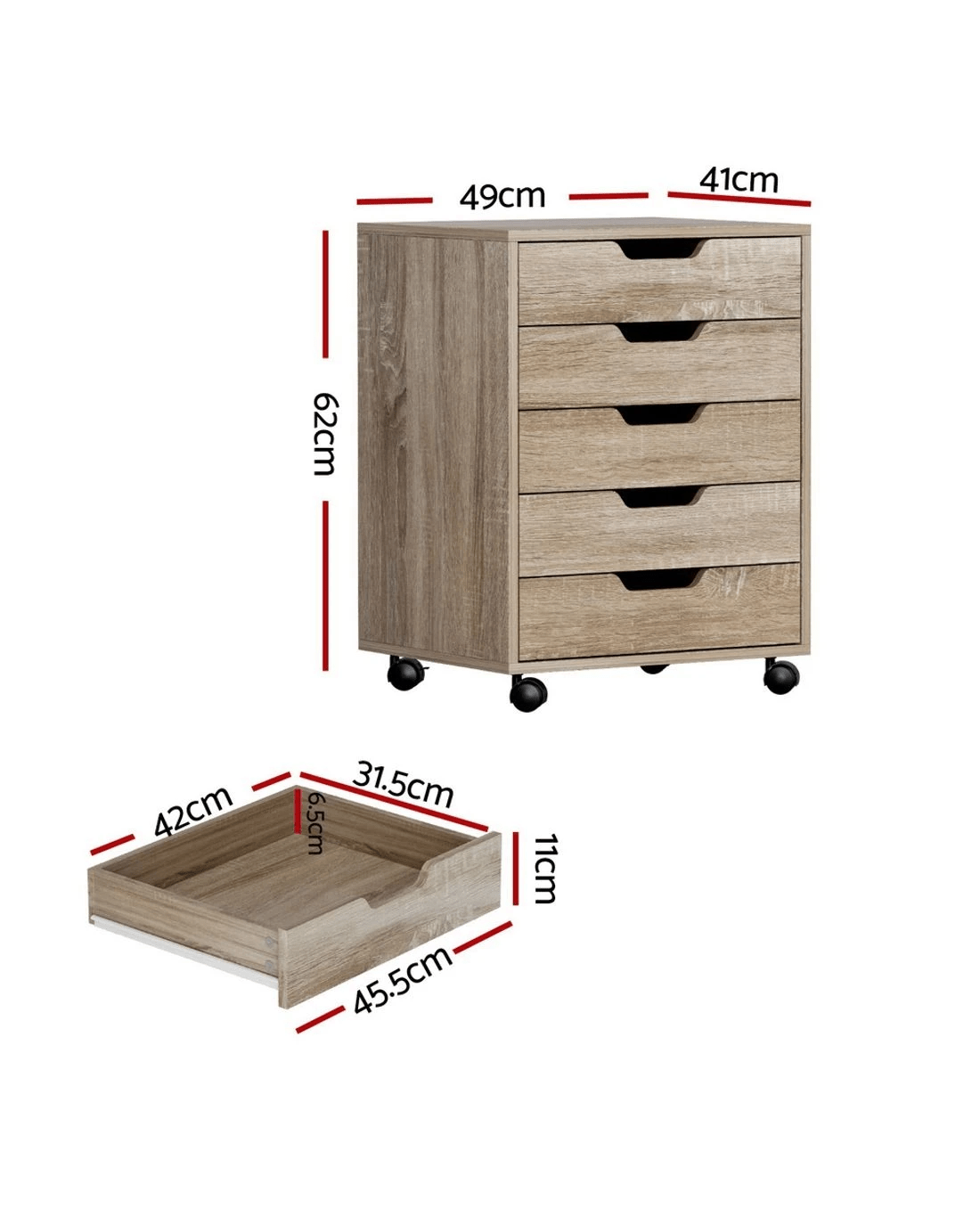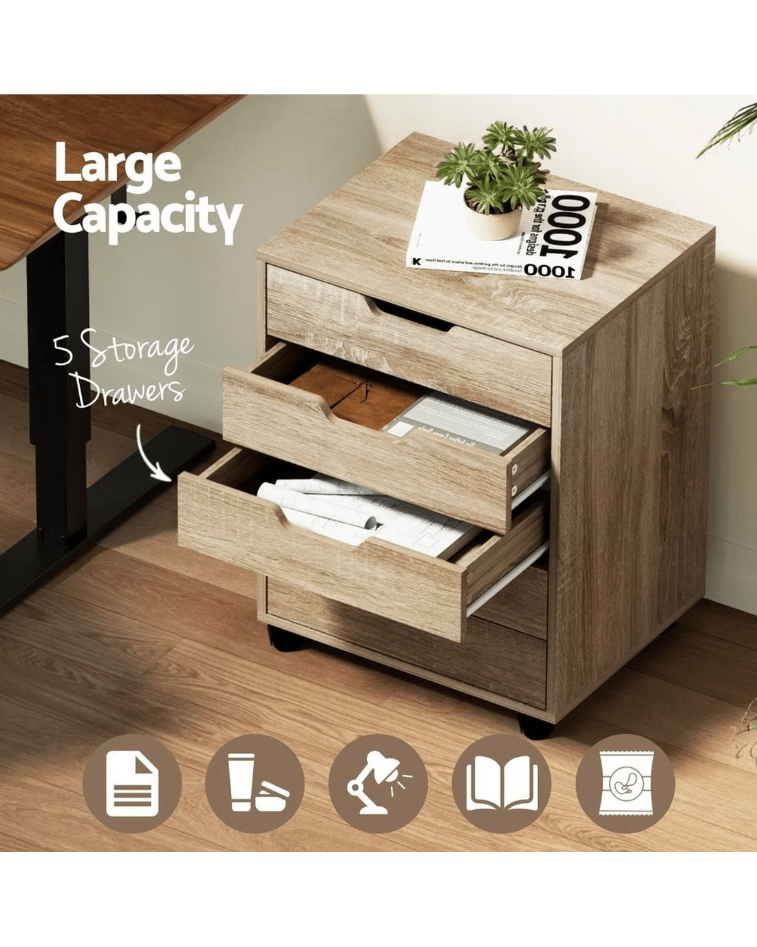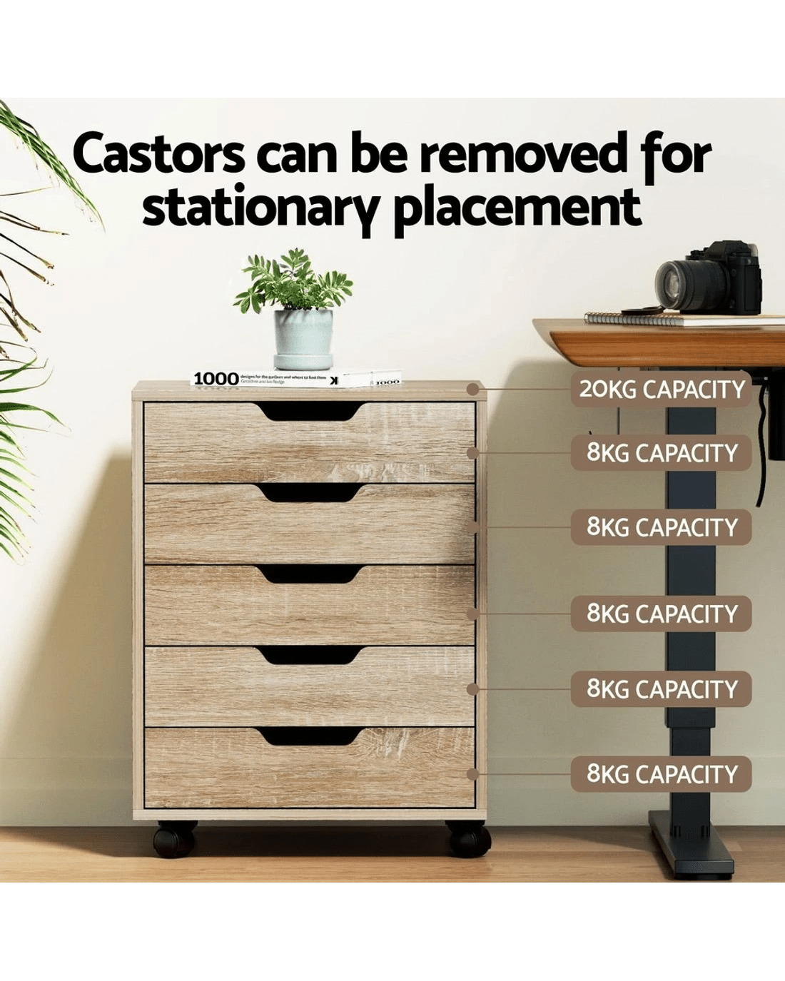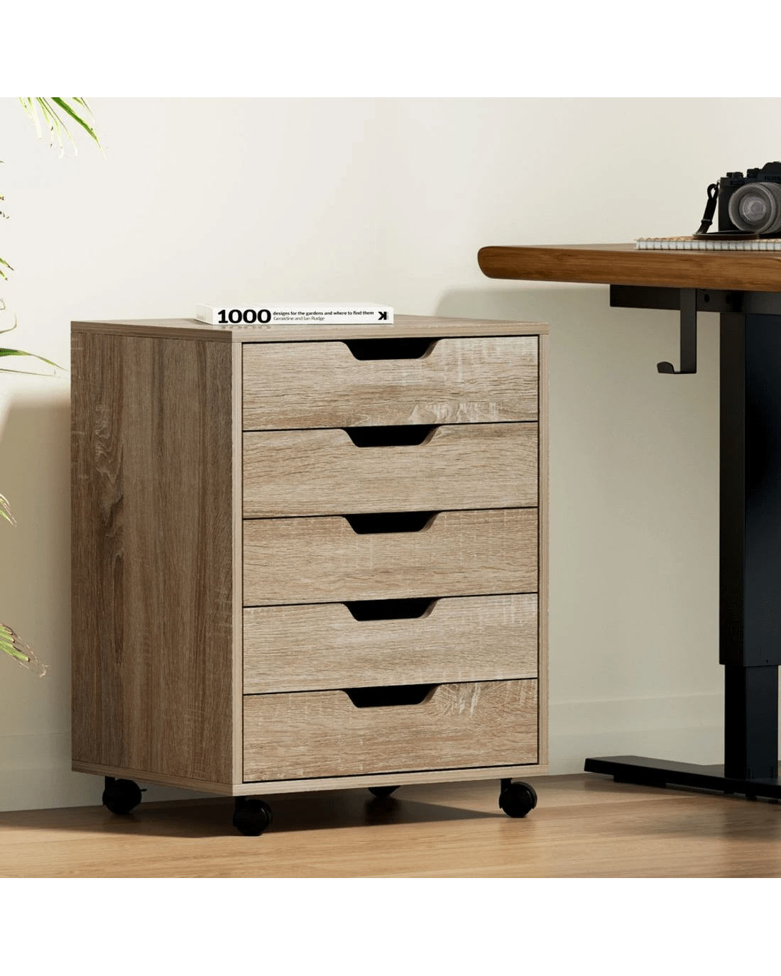 The Artiss Filing Cabinet offers seamless functionality with smooth drawer slides and concave handles for easy access. Equipped with 360-degree rolling casters and two locking wheels for stability, this cabinet features five large drawers to neatly organize your essentials.