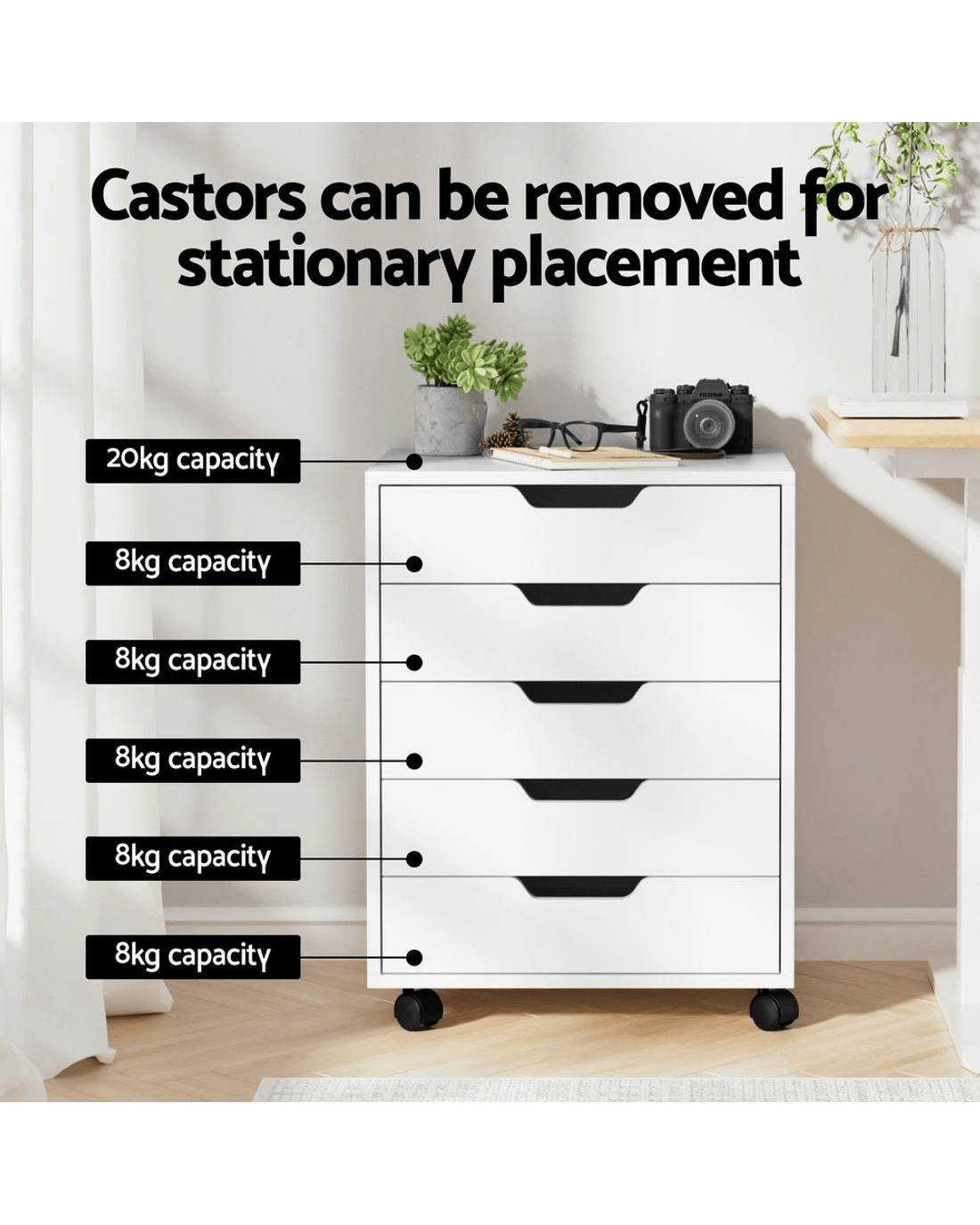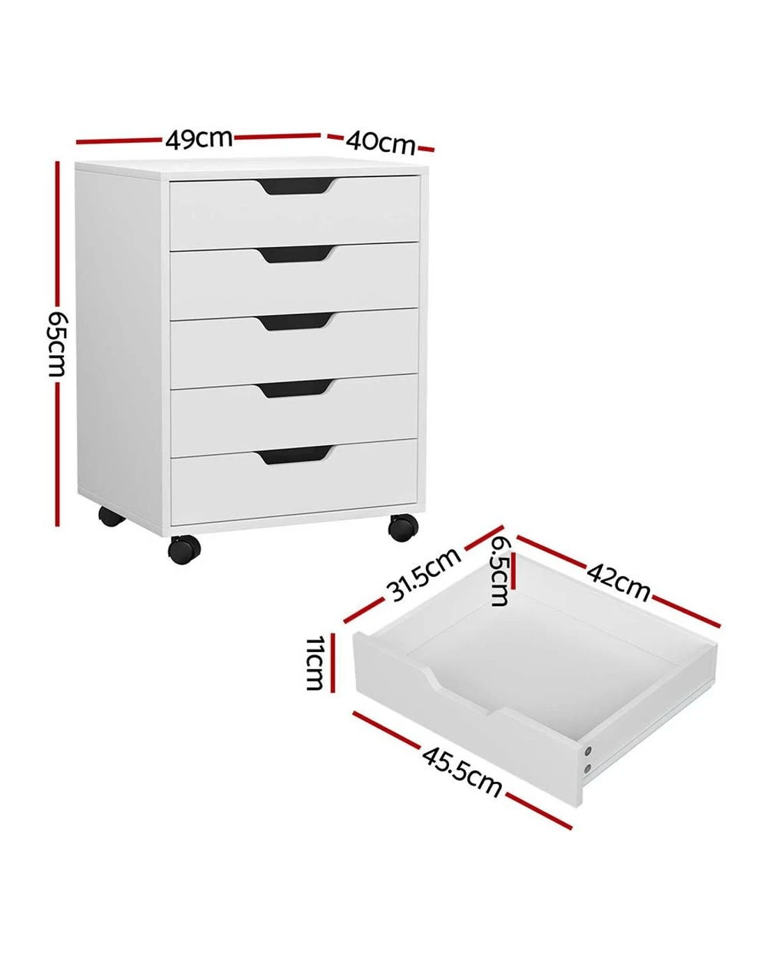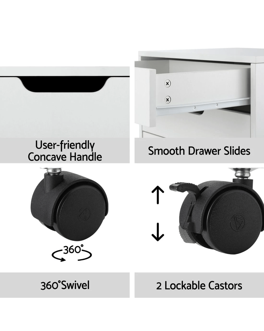 The Artiss Filing Cabinet offers seamless functionality with smooth drawer slides and concave handles for easy access. Equipped with 360-degree rolling casters and two locking wheels for stability, this cabinet features five large drawers to neatly organize your essentials.