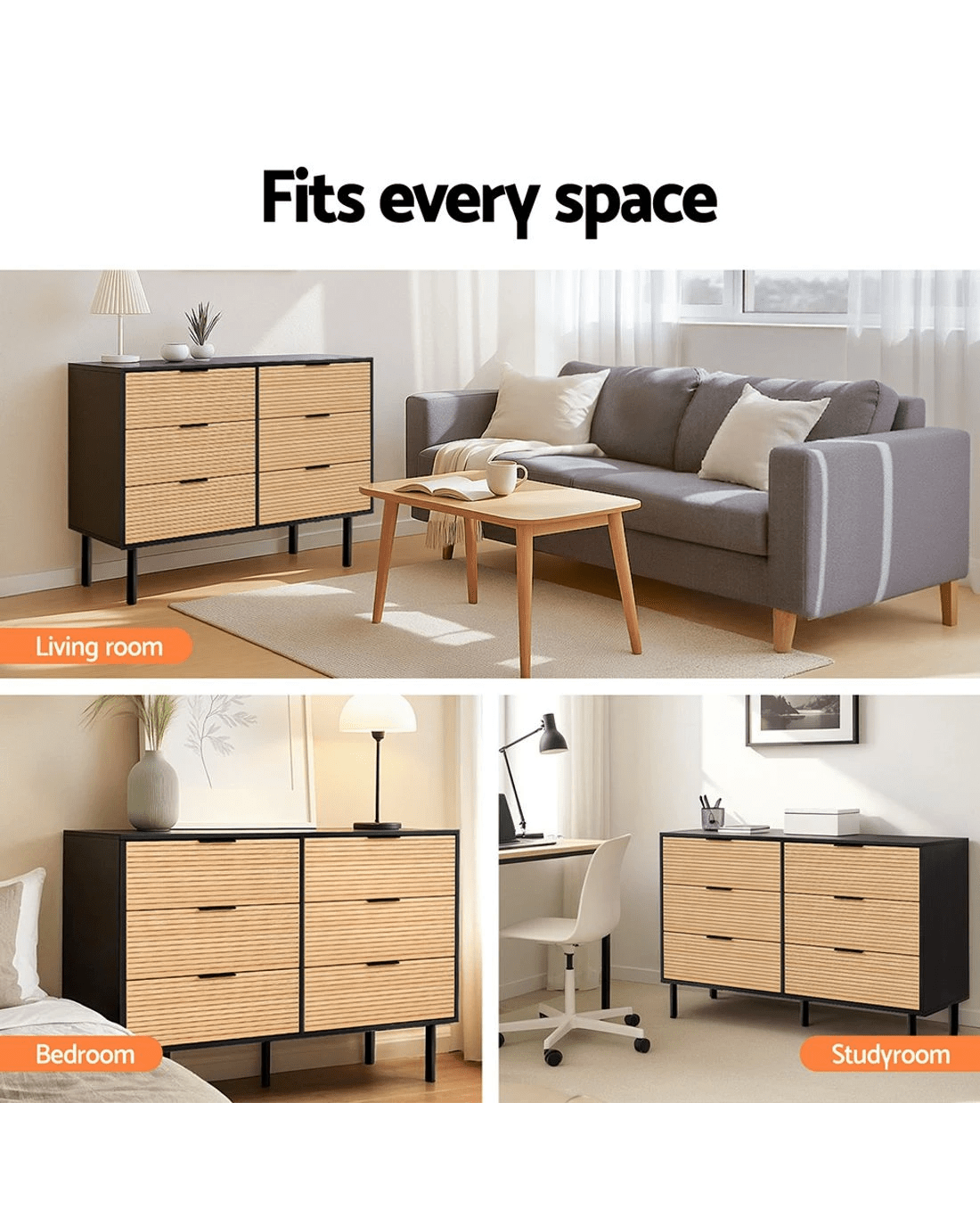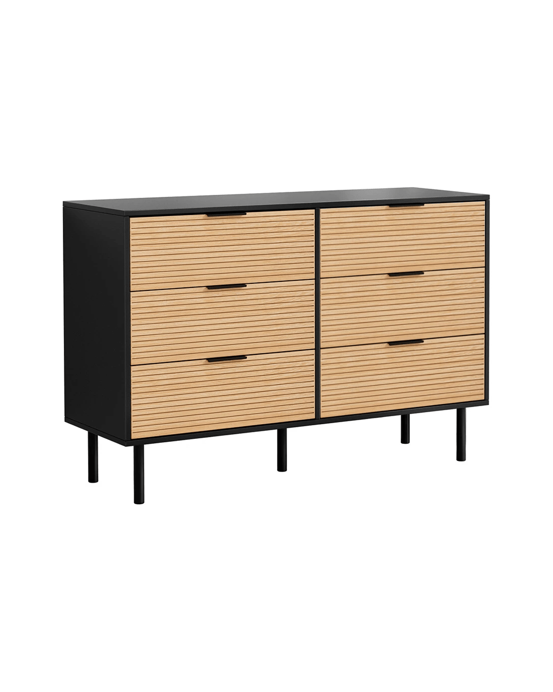 Elevate storage with this stylish lowboy featuring fluted-style doors and sleek metal handles/legs. Six smooth-sliding drawers (10kg capacity each) offer ample organisation, complemented by a scratch-resistant melamine finish (E1 PB) and 60kg tabletop. Includes anti-tip kits for safety and assembles effortlessly (2 packages). Maintain effortlessly with wipe-clean surfaces. Ideal as a bedroom dresser, living room display, entryway storage cabinet, or office solution. Compact 120x40x80cm design.