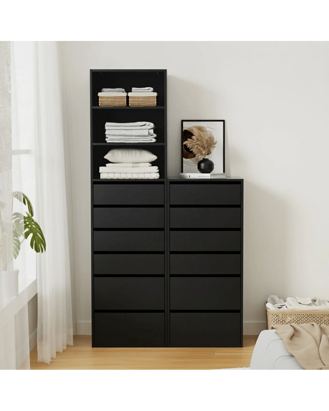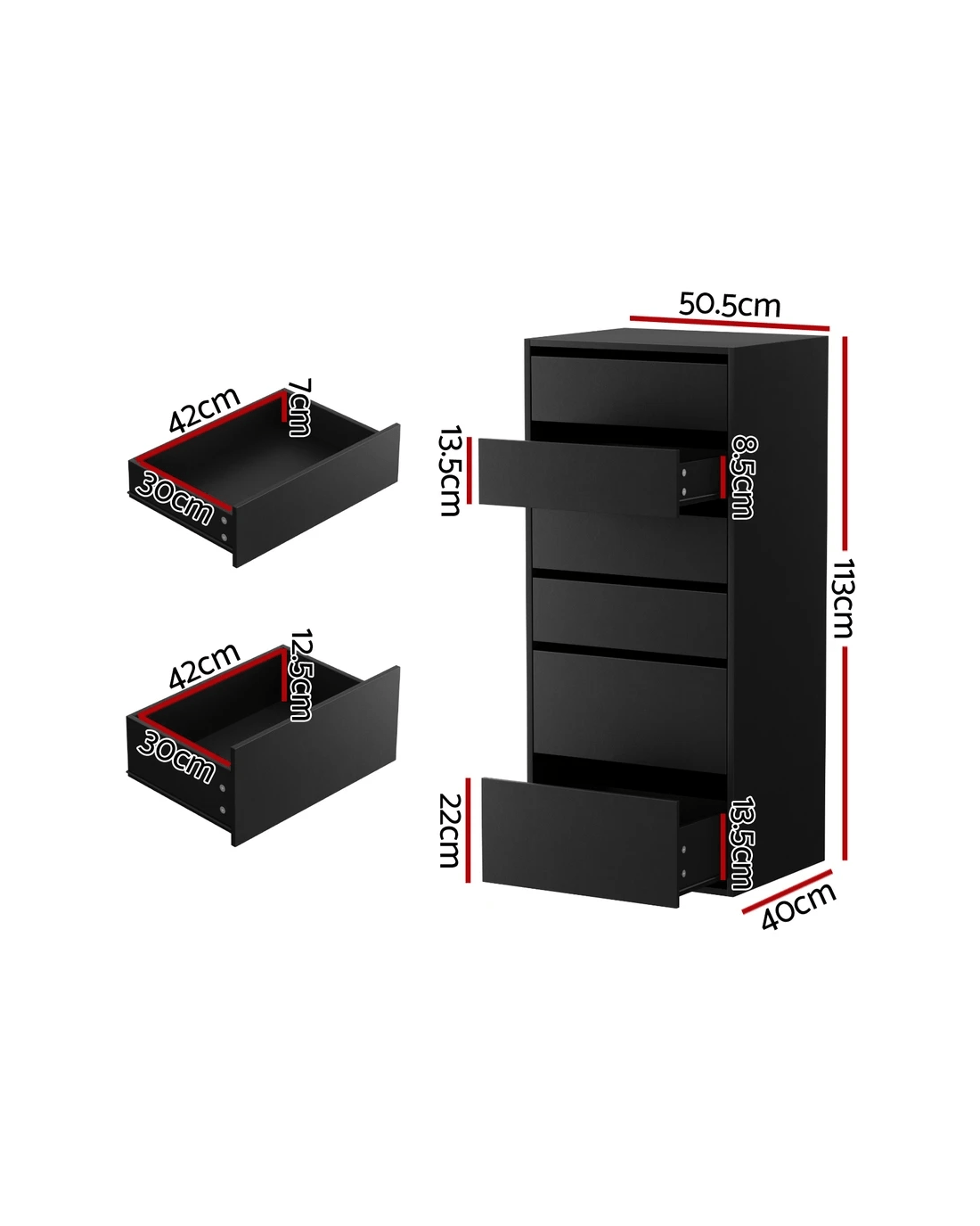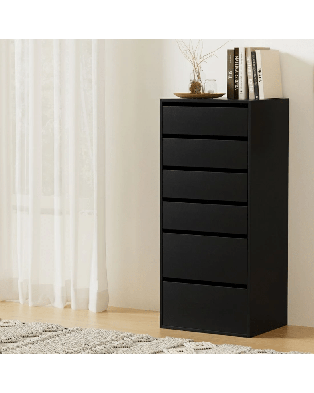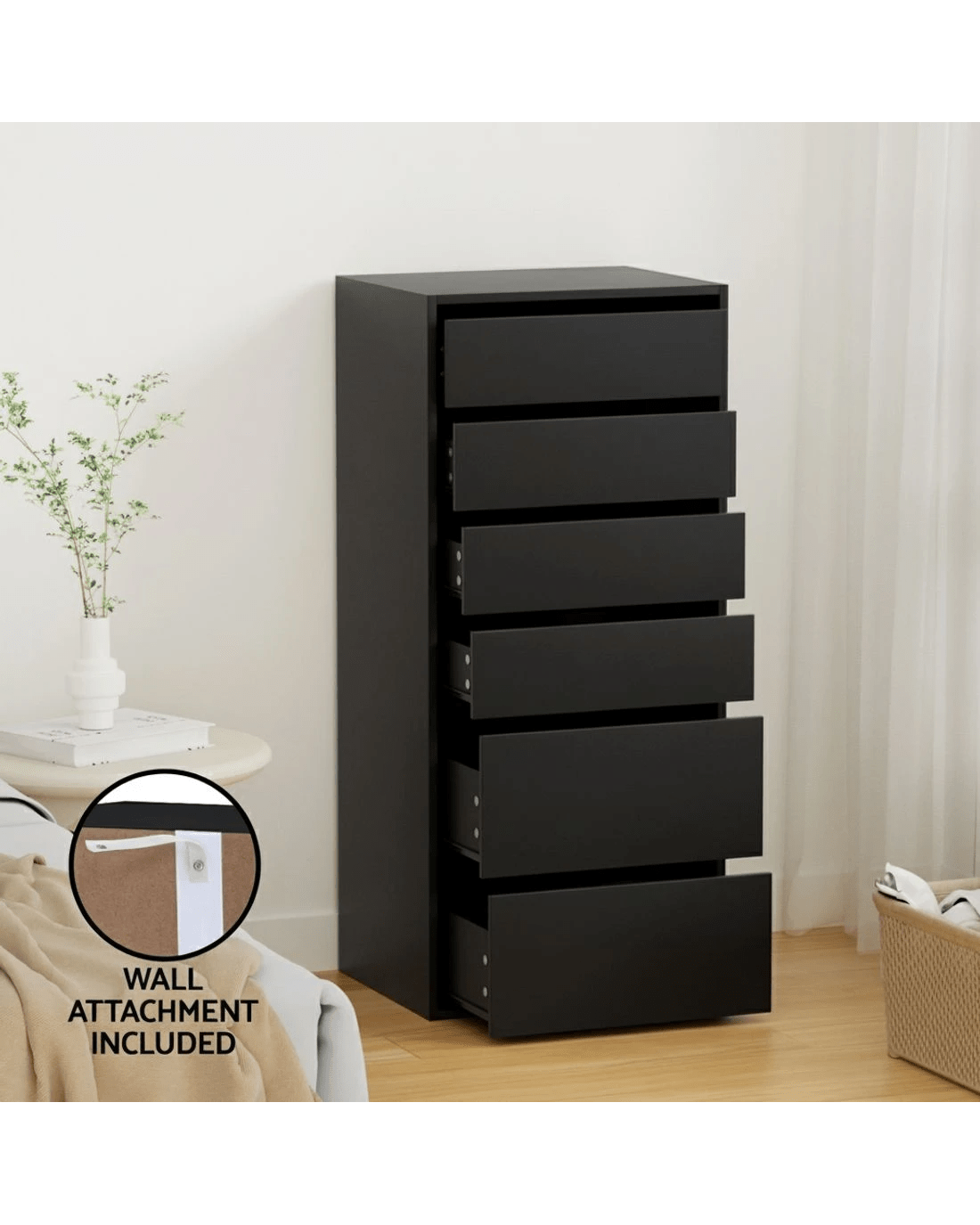 Maximise your storage space with the Artiss Chest of Drawers, standing at 113cm tall for a sleek and practical addition to any room. Featuring six spacious drawers, it provides ample space to organise clothing, accessories, and household essentials. The modern handle-free design complements contemporary interiors, while smooth sliding runners ensure effortless access. Built with a sturdy particle board frame and a durable paper veneer finish, it offers a balanced combination of style and function. A wall attachment is included for added stability, making it a reliable choice for any home.