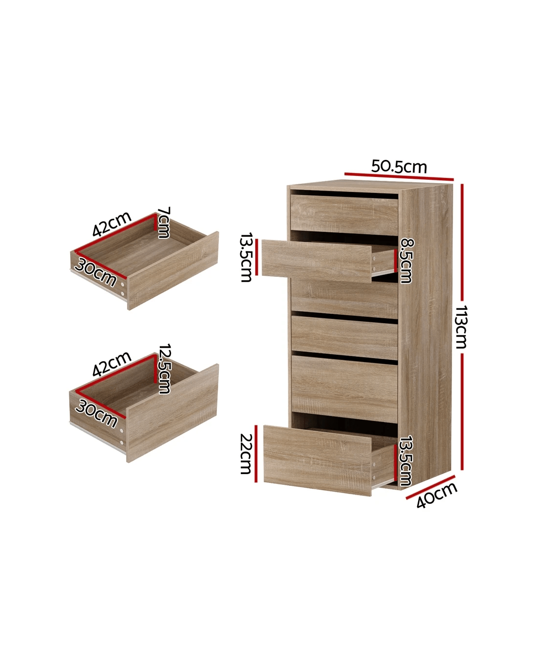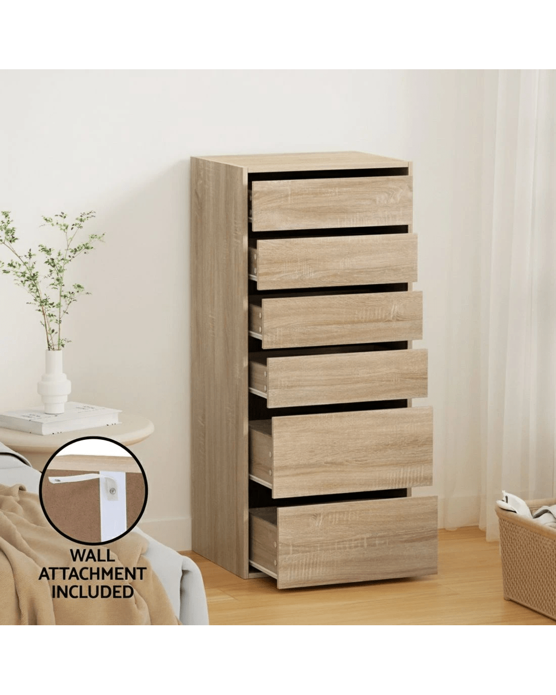 Maximise your storage space with the Artiss Chest of Drawers, standing at 113cm tall for a sleek and practical addition to any room. Featuring six spacious drawers, it provides ample space to organise clothing, accessories, and household essentials. The modern handle-free design complements contemporary interiors, while smooth sliding runners ensure effortless access. Built with a sturdy particle board frame and a durable paper veneer finish, it offers a balanced combination of style and function. A wall attachment is included for added stability, making it a reliable choice for any home.