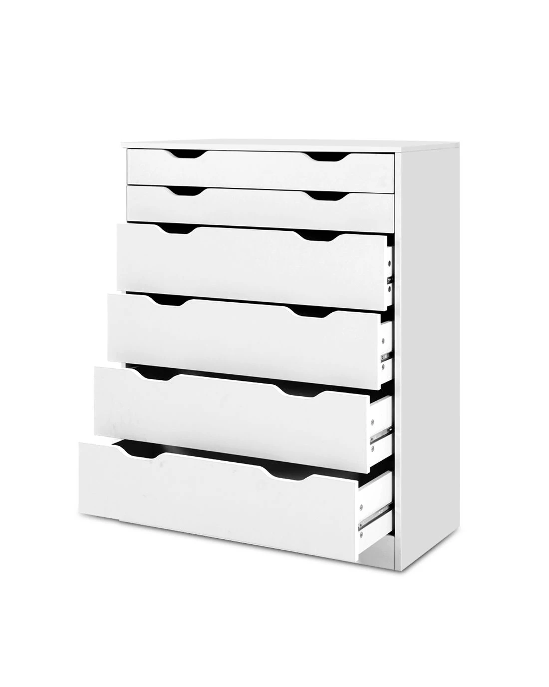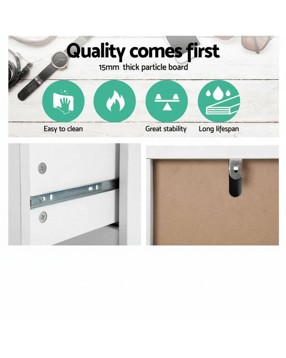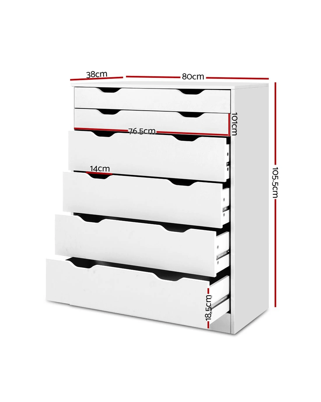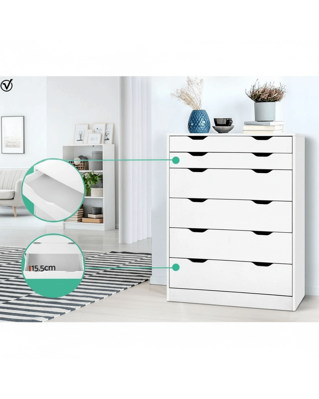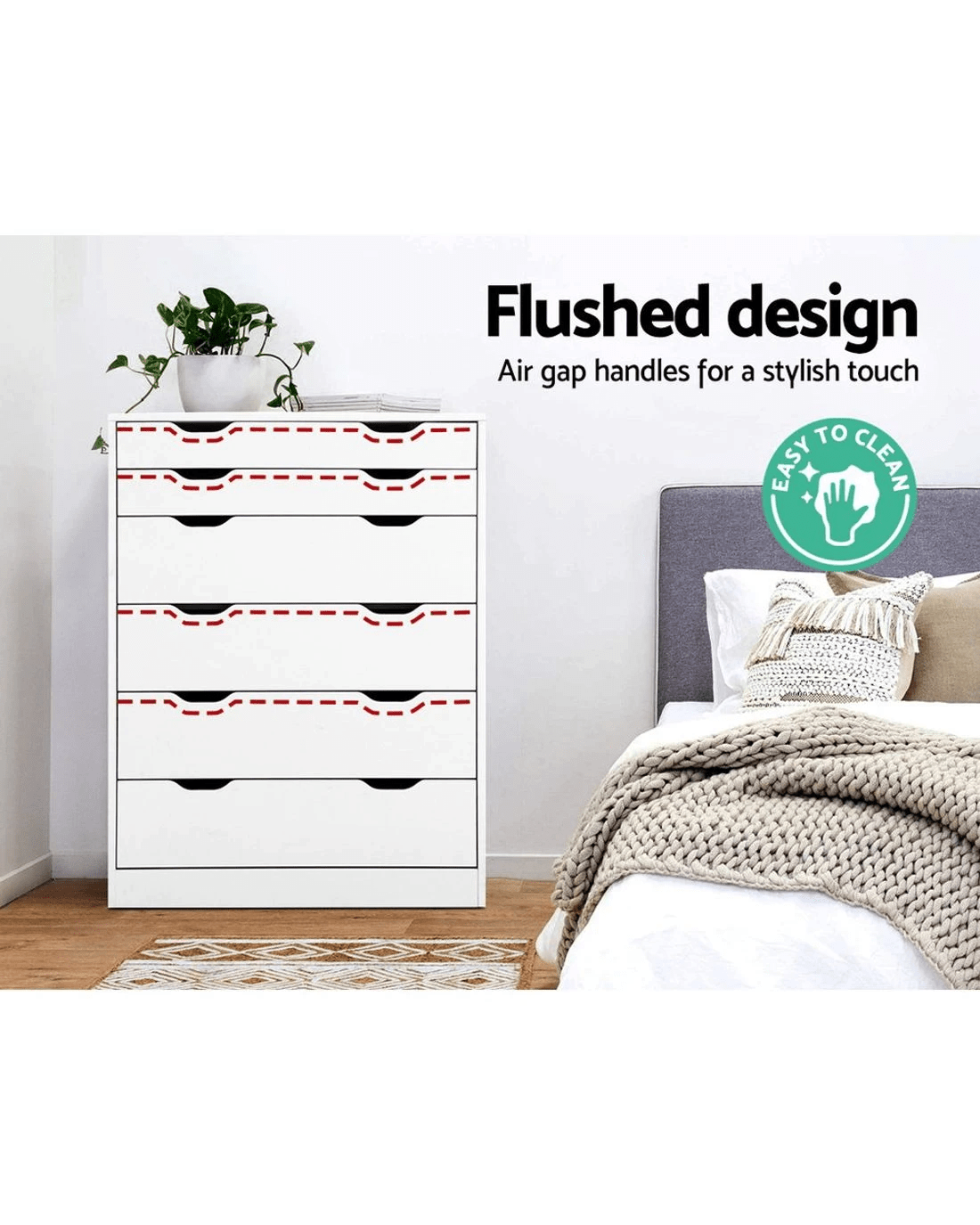 When storage space is a premium, our Artiss 6-drawer Tallboy can really help to ease your storage woes. Featuring six drawers comprising two shallow top drawers and four deep drawers, you can pack a whole bunch of stuff in them: clothes, personal knick knacks or home essentials, to enable your bedroom or any room to stay neat and uncluttered. Made from high density particle board with anti-rust coated metal drawer runners, the melamine-finished tallboy is designed to last and function reliably. And with its cool white hues and stylish air gap handles, our tallboy looks absolutely at home with your discerning taste in décor. Not least, the included wall mount bracket ensures that the tallboy is safe to use with everyone at all times.