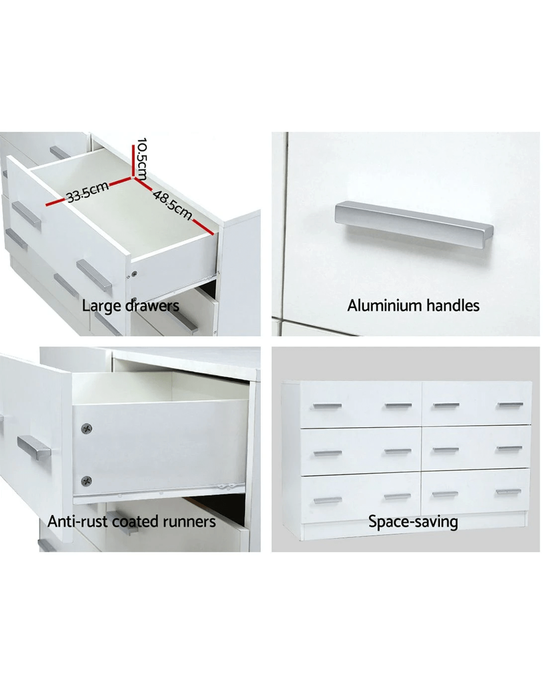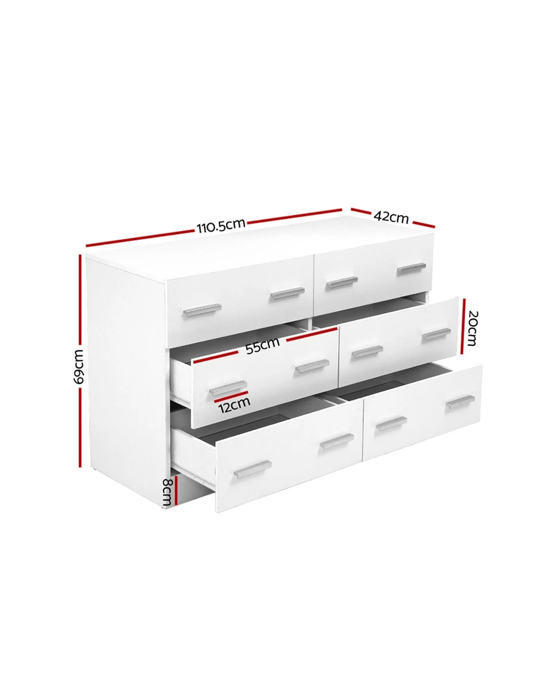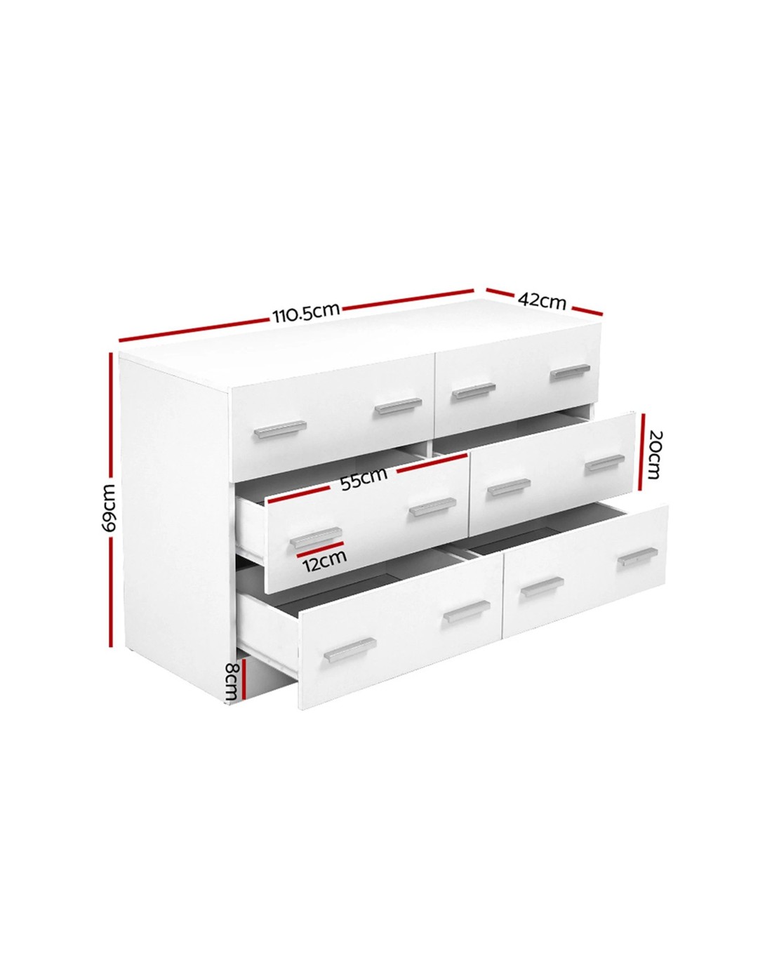 Practical and handsome, our Artiss 6-drawer Lowboy is perfect for those looking for extra storage space for your home. Contemporary and simply designed, this beauty features a flawless melamine finish with elegant handles that will easily match your home décor. Made with premium 15mm thick particle board with anti-rust coated drawer runners, our lowboy works ever so smoothly with minimum hassle. Not least, it provides plenty of storage space with six generous-sized drawers for all your clothing, fashion essentials and more.