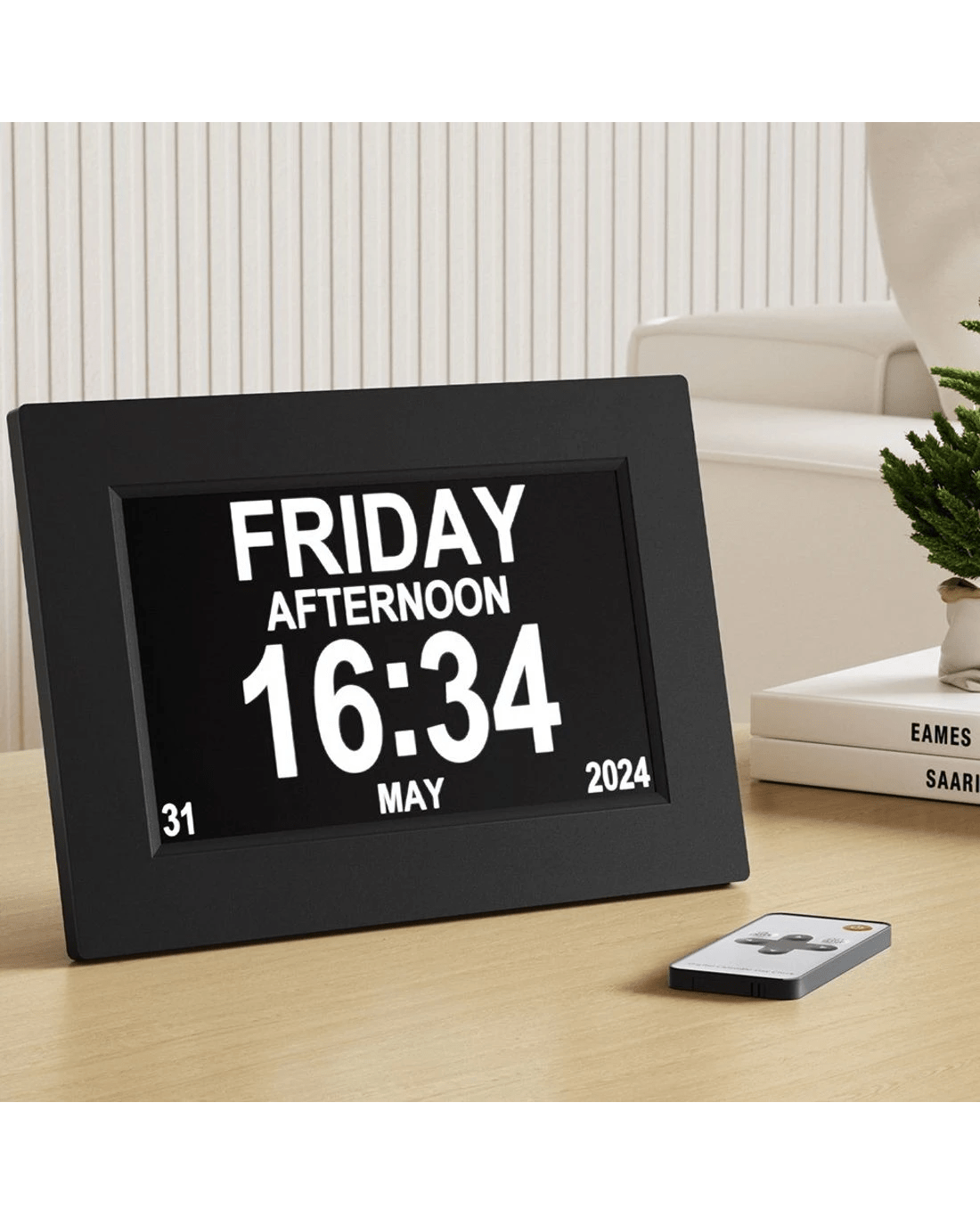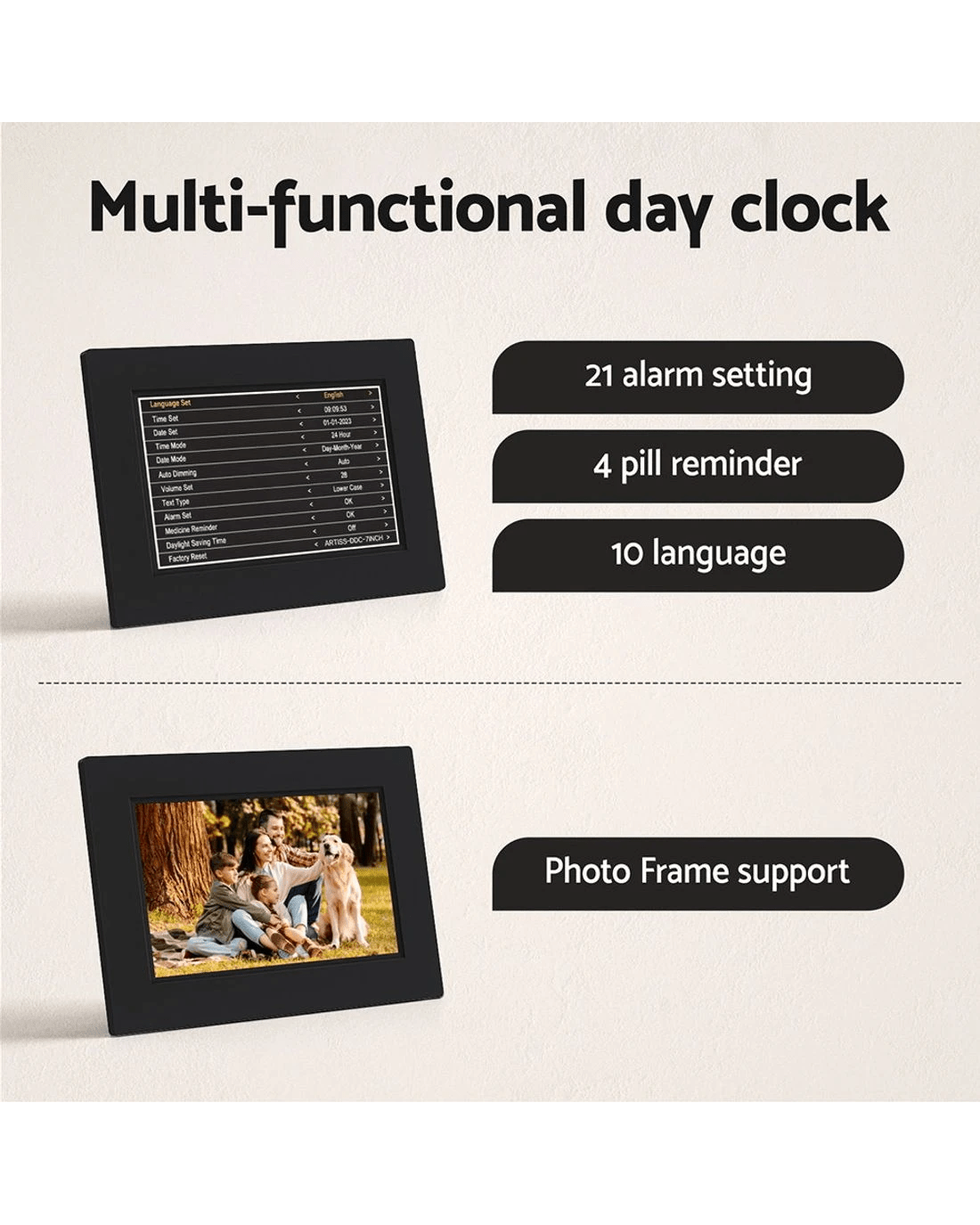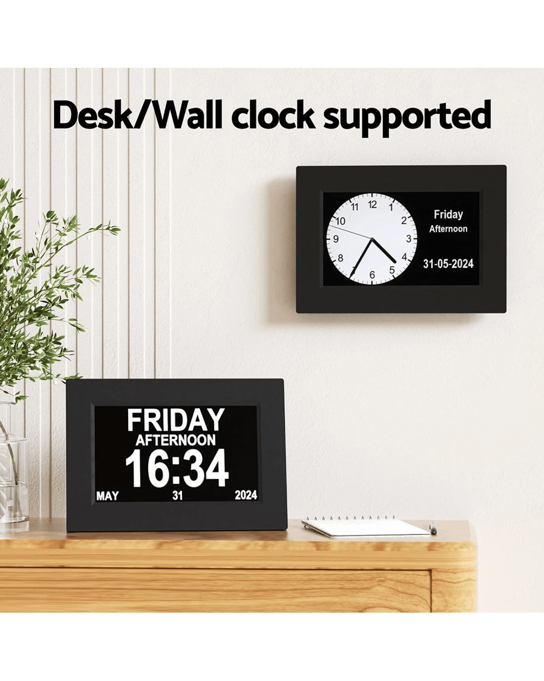 Simplify your mornings and evenings with this versatile Digital Day Clock. Featuring a large, clear, and eye-catching 8-inch LCD display, it can be positioned on your desk or mounted on the wall for optimal visibility. The auto-dimming function adjusts brightness automatically for comfortable viewing throughout the day and night.