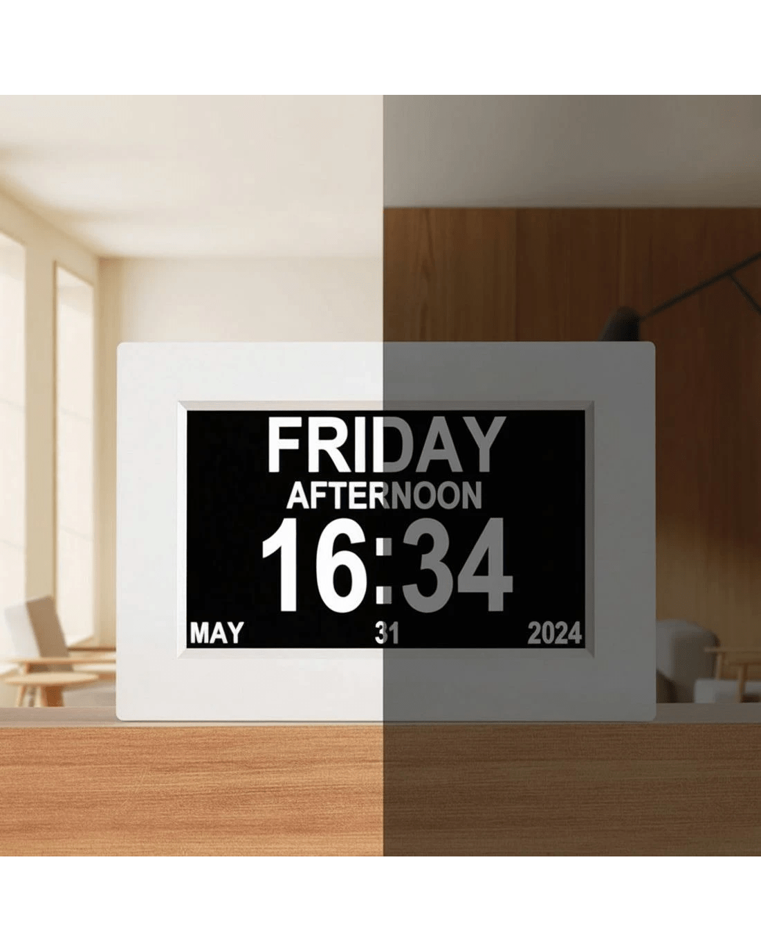Simplify your mornings and evenings with this versatile Digital Day Clock. Featuring a large, clear, and eye-catching 8-inch LCD display, it can be positioned on your desk or mounted on the wall for optimal visibility. The auto-dimming function adjusts brightness automatically for comfortable viewing throughout the day and night.