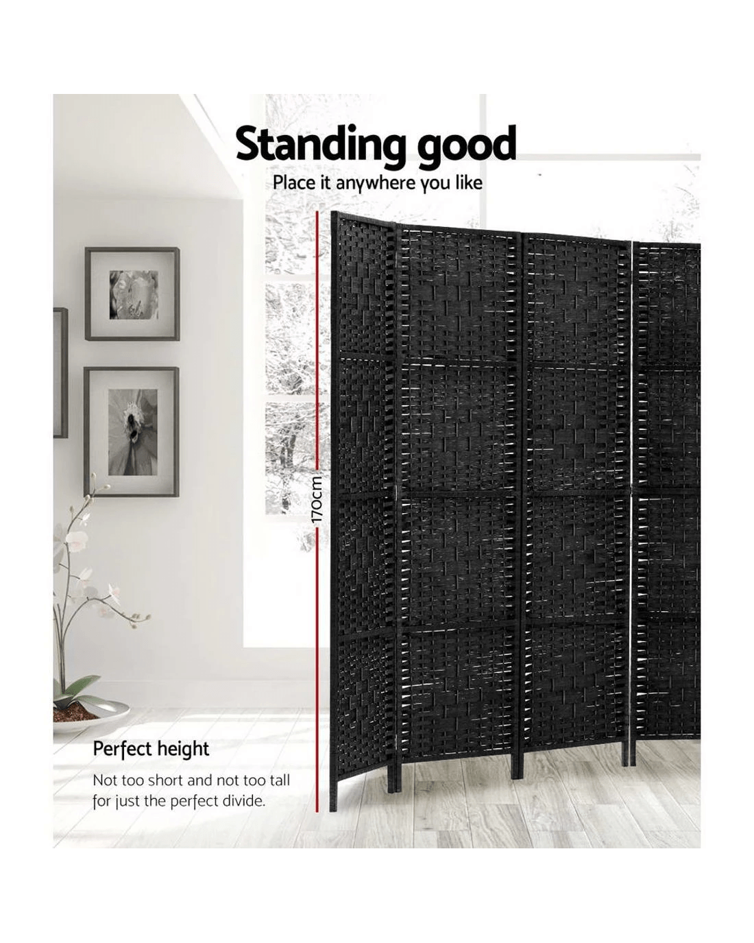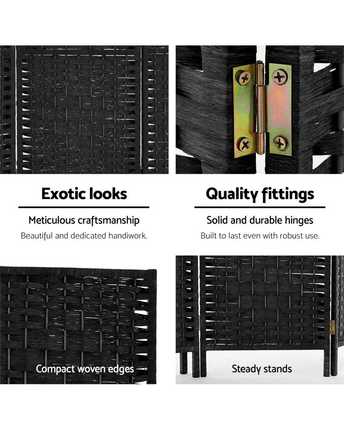 When you need instant private space, our 8-panel room divider helps create dedicated zones in the most hassle-free way. With its exotic and elegant design, our elegant panel divider certainly stands out from the looks of mundane dividers. Made from solid poplar wood, the divider is non-toxic, fade-resistant, waterproof and breathable. As for panels , they're beautifully crafted from rolled paper that mimics rattan look and feel. Lightweight and yet sturdy, our room divider utilises 2-way metal hinges to cope with robust use. Not least, the panels are also easily foldable for space saving storage.