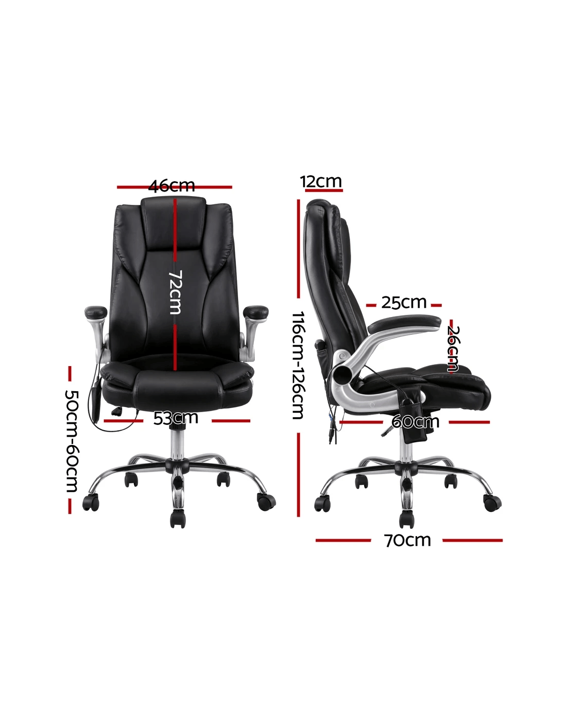 As you sit in the high-back premium faux leather seat, you have at your fingertips a wired remote control that brings on a soothing eight-point vibration massage aimed at four different parts of your body: upper and lower back, hips, and thighs. Choose from five vibration modes with four intensity levels and let the massage chair do its magic to relieve back tension, soothe aching muscles and provide all-round comfort. You can set it for 15, 30 or 60 minutes, perfect for that power nap or lunch break.