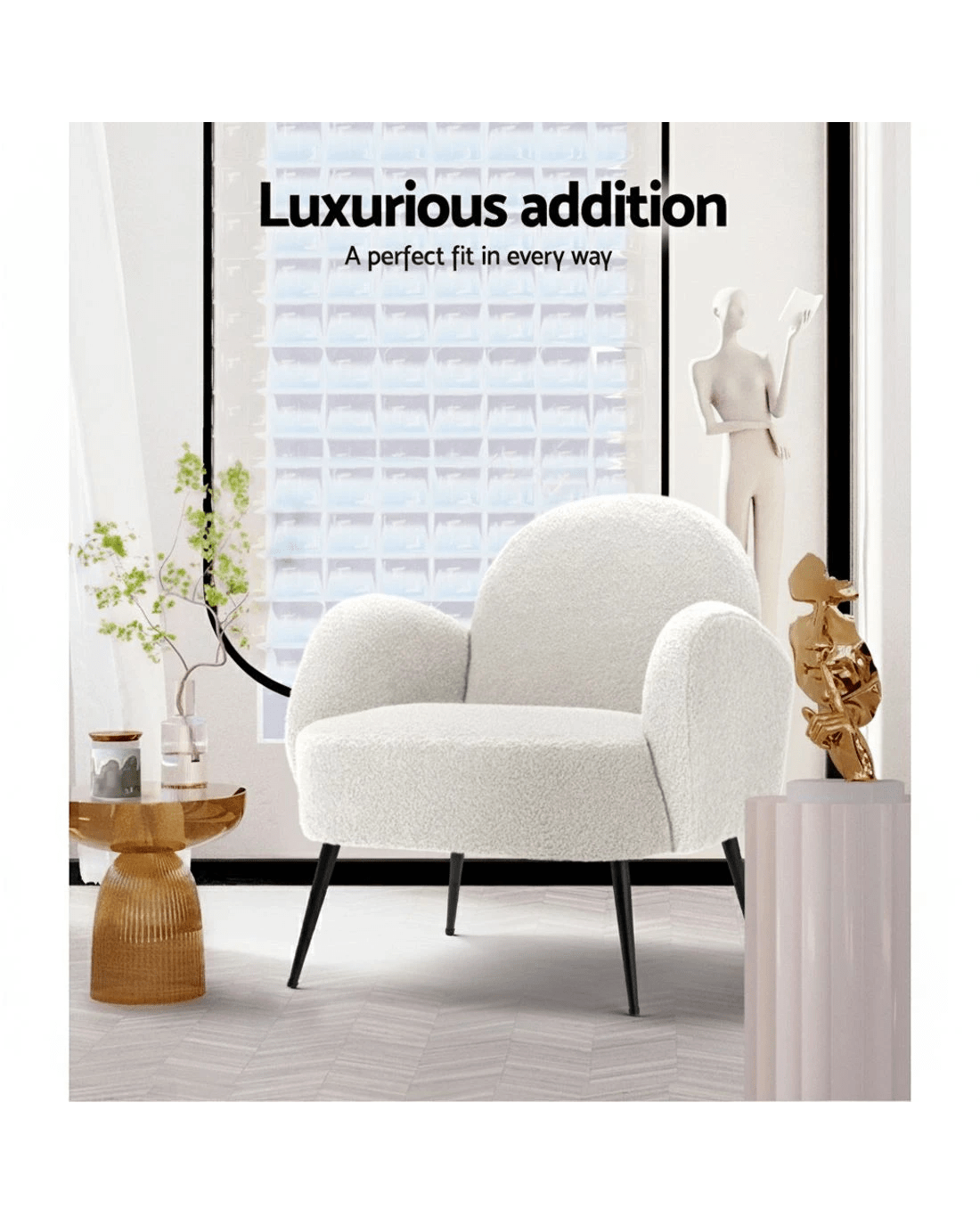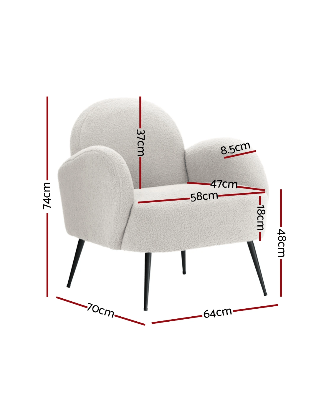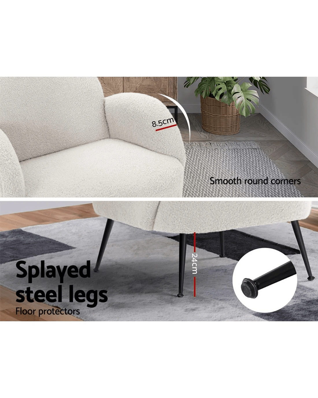 Snuggle up and fall in love with our most eye-catching Artiss Hanes Armchair. Not an ordinary one but stands out in every aspect, whether it's craftsmanship, style, upholstery, comfort, or quality that speaks for itself. It is something you would surely want to add to your space. It's perfect for your relaxation zone after a long, tiring day. Artiss Hanes armchair offers a wide and welcoming seat for you to relax and is ideal for every corner of your space where you want to add soft and comfy touches. Crafted with great attention to details, this armchair feature luxurious upholstery with high-resilience foam, extra thick padding, and solid structure. It is quite sturdy and will withstand the test of time. Our Hanes armchair is upholstered in soft sherpa fabric that epitomises luxury with its smooth appearance and adds a cosy and relaxing feel to your space. Its cosy backrest with armrests creates an enveloping feel that makes you feel snuggled. Plus, the sturdy black splayed steel legs with floor protectors will offer optimum stability and protection to your floors and add a luxurious charm to your space with its gorgeous presence. Our Hanes armchair is super comfortable to relax on and possess stylish, elegant, and contemporary good looks, making it a must-have piece of furniture for your home.