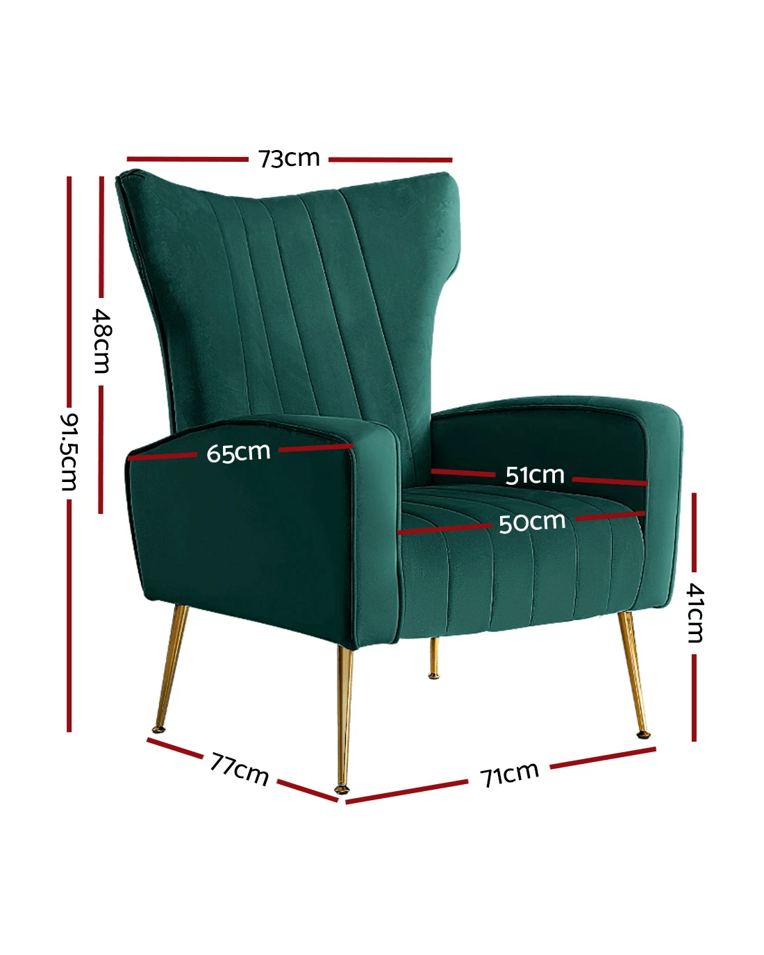 Artiss Kate armchair offers a wide, high-back, and welcoming seat with comfortable armrests for you to relax. It is ideal for every corner of your space where you want to add soft and comfy touches. Crafted with great attention to details, this armchair feature solid wood construction with high resilience foam. It is quite sturdy and will withstand the test of time. Our Kate armchair is upholstered in soft velvet fabric that epitomises luxury with its smooth and shiny appearance and adds a cosy and relaxing feel to your space. Plus, the splayed golden metal legs with floor protectors will offer optimum stability and protection to your floors and add a luxurious charm to your space with its gorgeous presence.