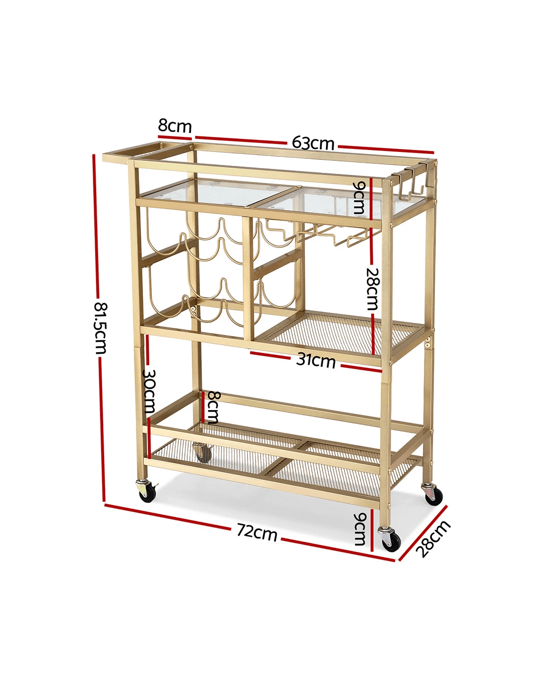 Transform your space with this versatile gold bar cart. Featuring mirrored tempered glass shelves, a durable gold metal frame, and a waterproof surface, this cart is both elegant and practical. The removable wine racks and glass holders make it perfect for entertaining, while the gallery rail ensures safety for your items. Bonus 3 hooks provide extra hanging options for towels or utensils. With 4 universal casters (2 lockable) and a convenient push bar that doubles as a towel rack, this cart is easy to move and secure. Whether used as a kitchen island, bar cart, or serving trolley, it's ideal for any occasion. Assembly is quick and straightforward with clear instructions included. Perfect for hosting and daily convenience!