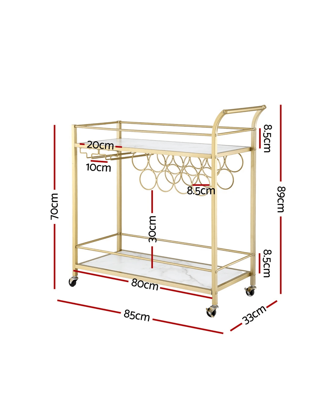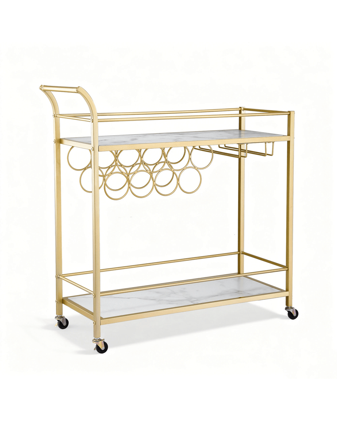 Add elegance and functionality to your space with our versatile marble bar cart. Make entertaining or daily meal prep easier with this stunning rolling kitchen island cart. Featuring marble-effect shelves and a durable gold frame, this cart combines style and practicality. Removable wine racks and glass holders ensure your beverages and glassware are always within reach. The ample storage includes a gallery rail for secure organisation. Four universal casters allow easy movement, with two lockable for stability. Its curved push bar doubles as a towel rack, adding convenience. The water-resistant surface ensures effortless cleaning, making it perfect for kitchens, dining rooms, or even as a bar cart for entertaining. Clear instructions make assembly a breeze. Elevate your space today with this elegant and functional cart!