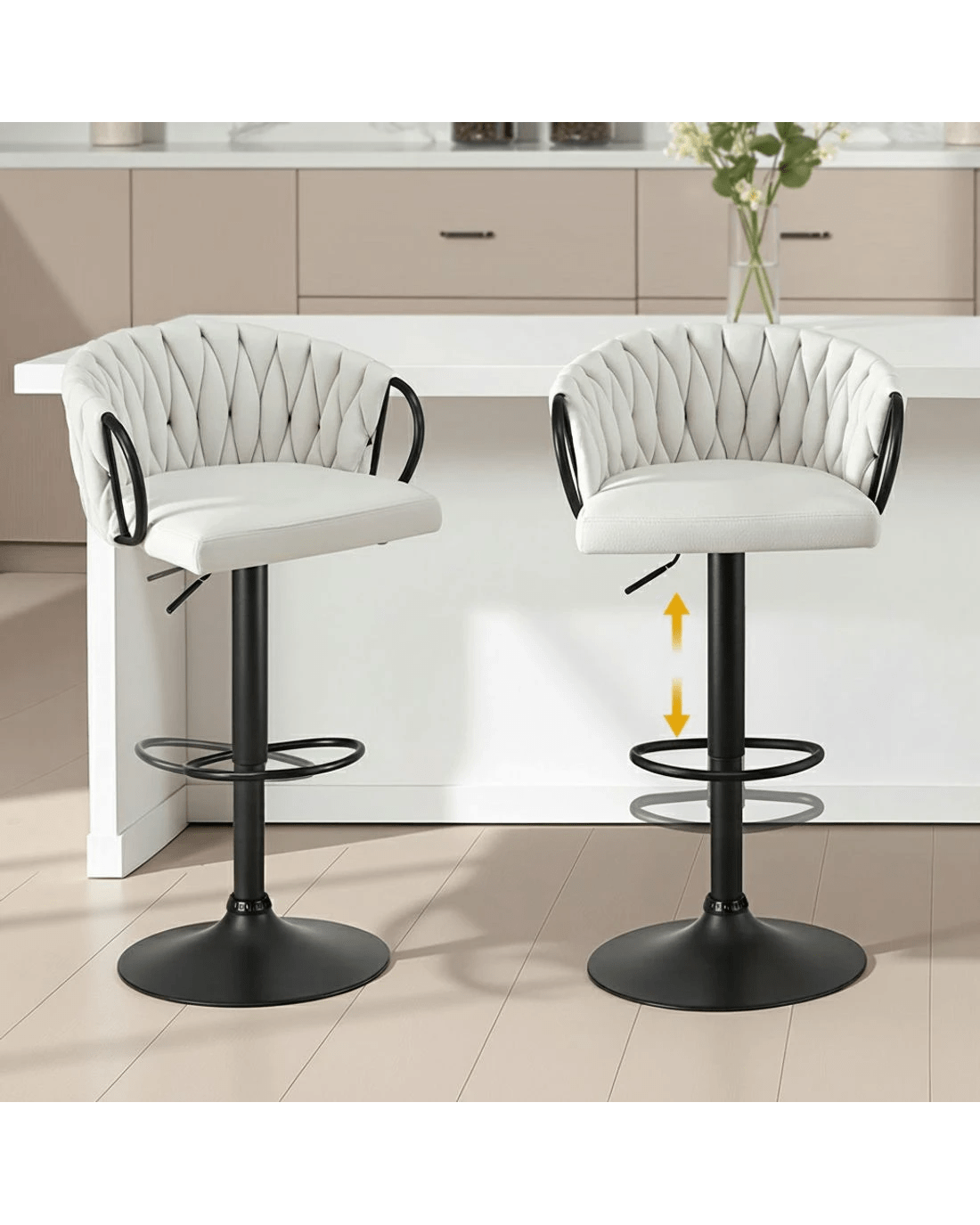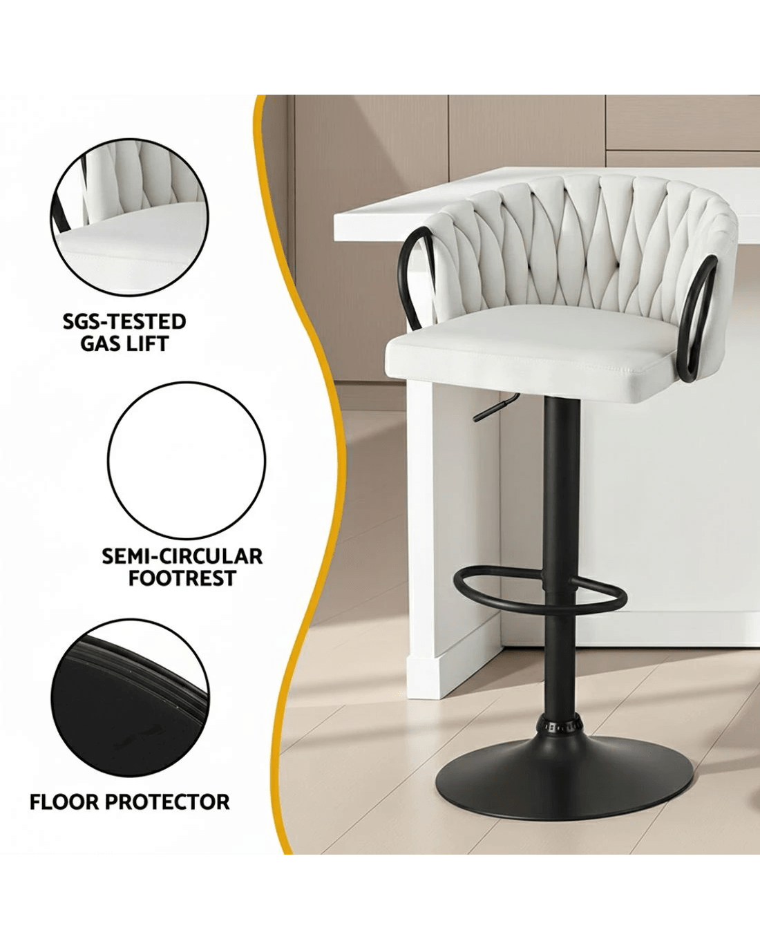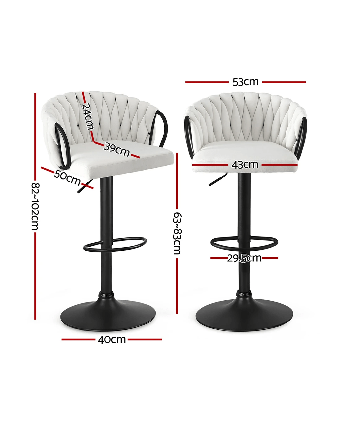 Redefine your seating experience with our set of 2 adjustable velvet bar stools. Featuring an ergonomic woven design and luxurious velvet seats, these stools combine comfort and elegance. The height adjusts effortlessly from 82-102cm, making them ideal for kitchen counters, bars, and islands. Sturdy metal construction and a reinforced gas lift cylinder ensure durability, supporting up to 120kg per stool. Designed with metal armrests and a semi-circular footrest, they offer superior comfort while protecting your floors with anti-slip protectors. Elevate your home with these stylish and functional bar stools today.