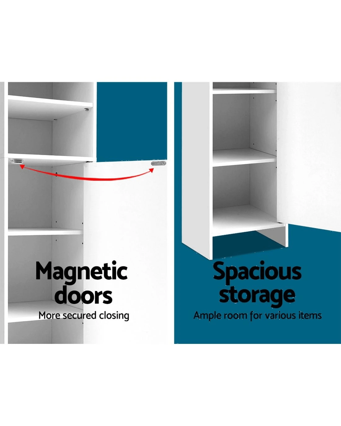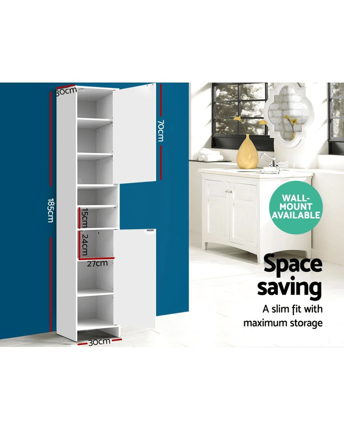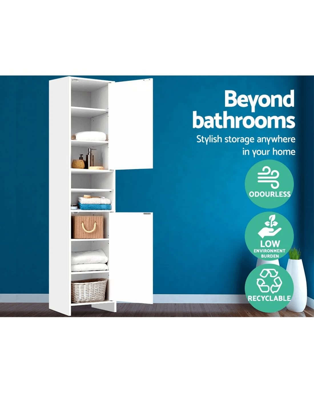 Need more storage but just do not have enough floor space in your home? Our Artiss Tall Cabinet may just be the solution for you. With other storage cabinets that are wider and shorter in shape, you use up more floor space and end up with a lot of wasted wall space that you cannot do much with except hanging family photos. Our tall cabinet has a space-saving design, meaning it only uses up a tiny bit of floor space and can get into all the tricky nooks and crannies. Made of eco-friendly engineered wood with melamine finish, the cabinet features sturdy construction and eight tiers of storage. With two open shelves and two large closed cabinets with magnetic door catches, the cabinet provides more than ample space for all your bathroom or living room essentials despite its small footprint.