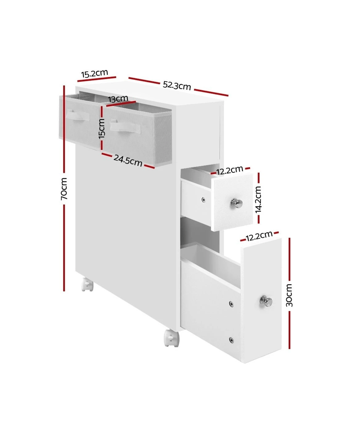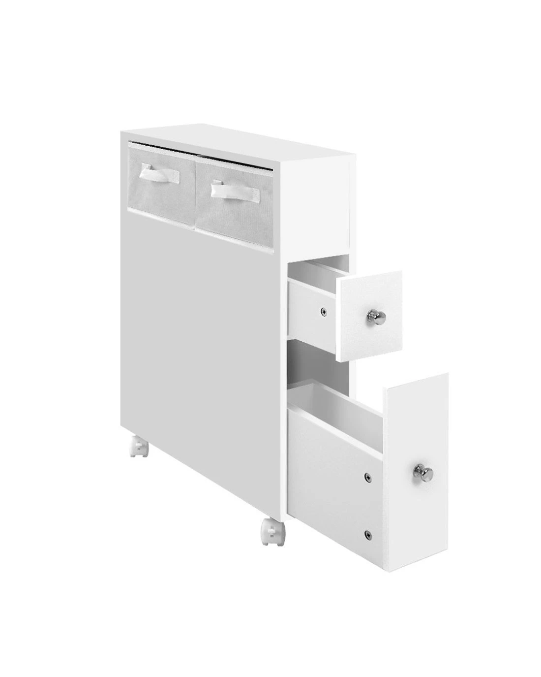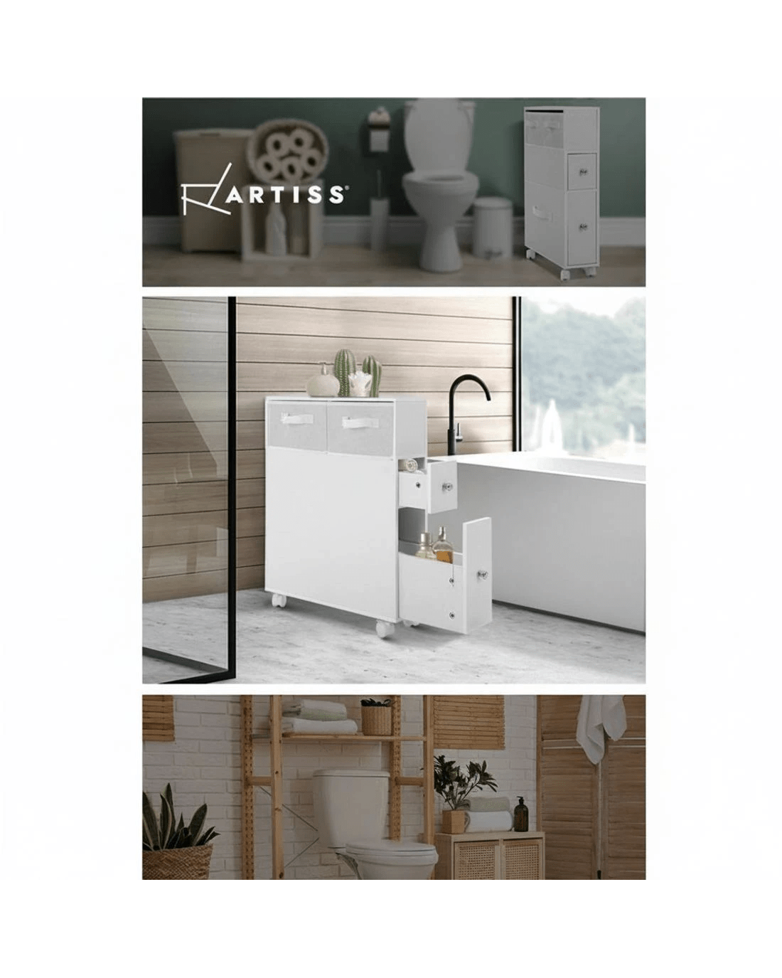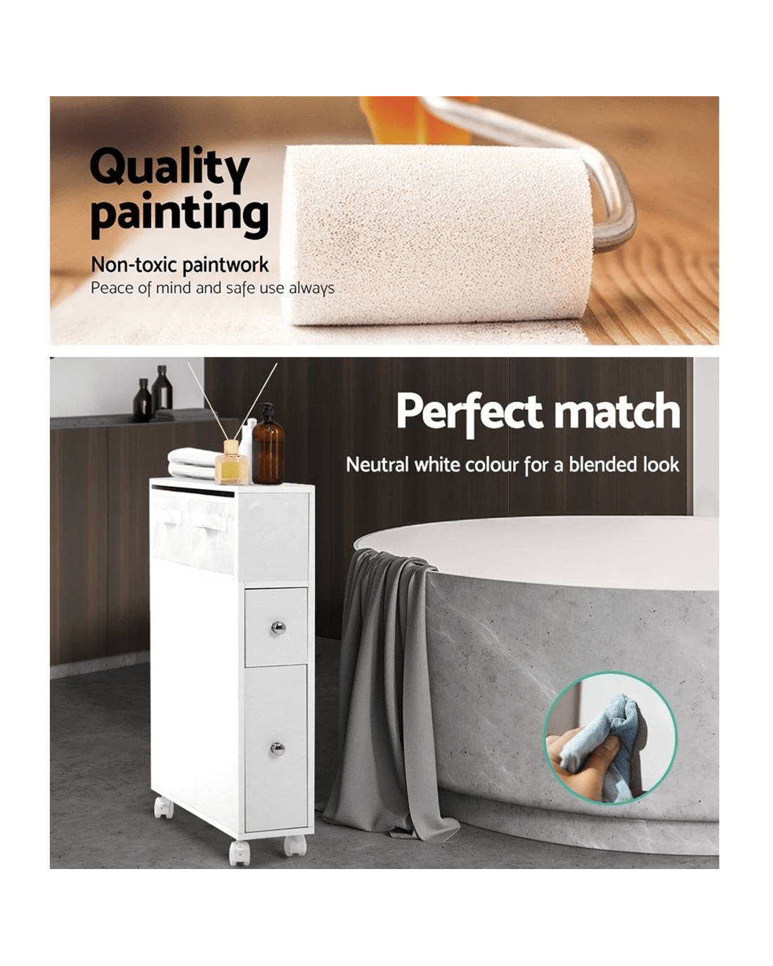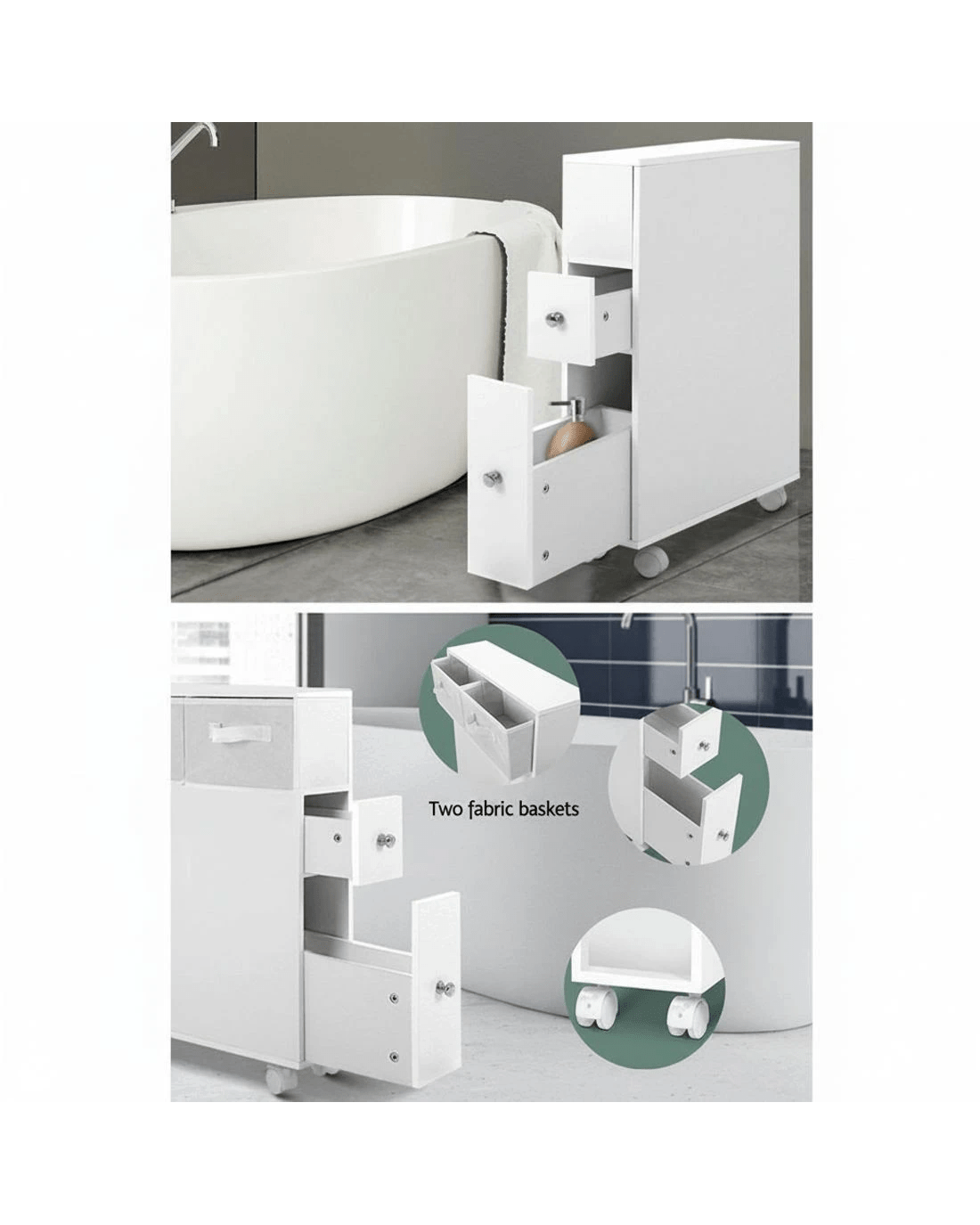 Update your bathroom to turn a chaotic routine into a calm one. With the Artiss Toilet Storage Caddy, you can store your daily bathroom items and access them easily knowing where they are. It creates space and order too, making your bathroom neat and tidy. The slim and compact caddy comprises an non-woven basket, storage drawers and cleaning brush holders too. Made of quality and eco-friendly MDF board, the caddy is more stable and stands up better in heat and humidity. It is also fitted with castor wheels for easy movement.