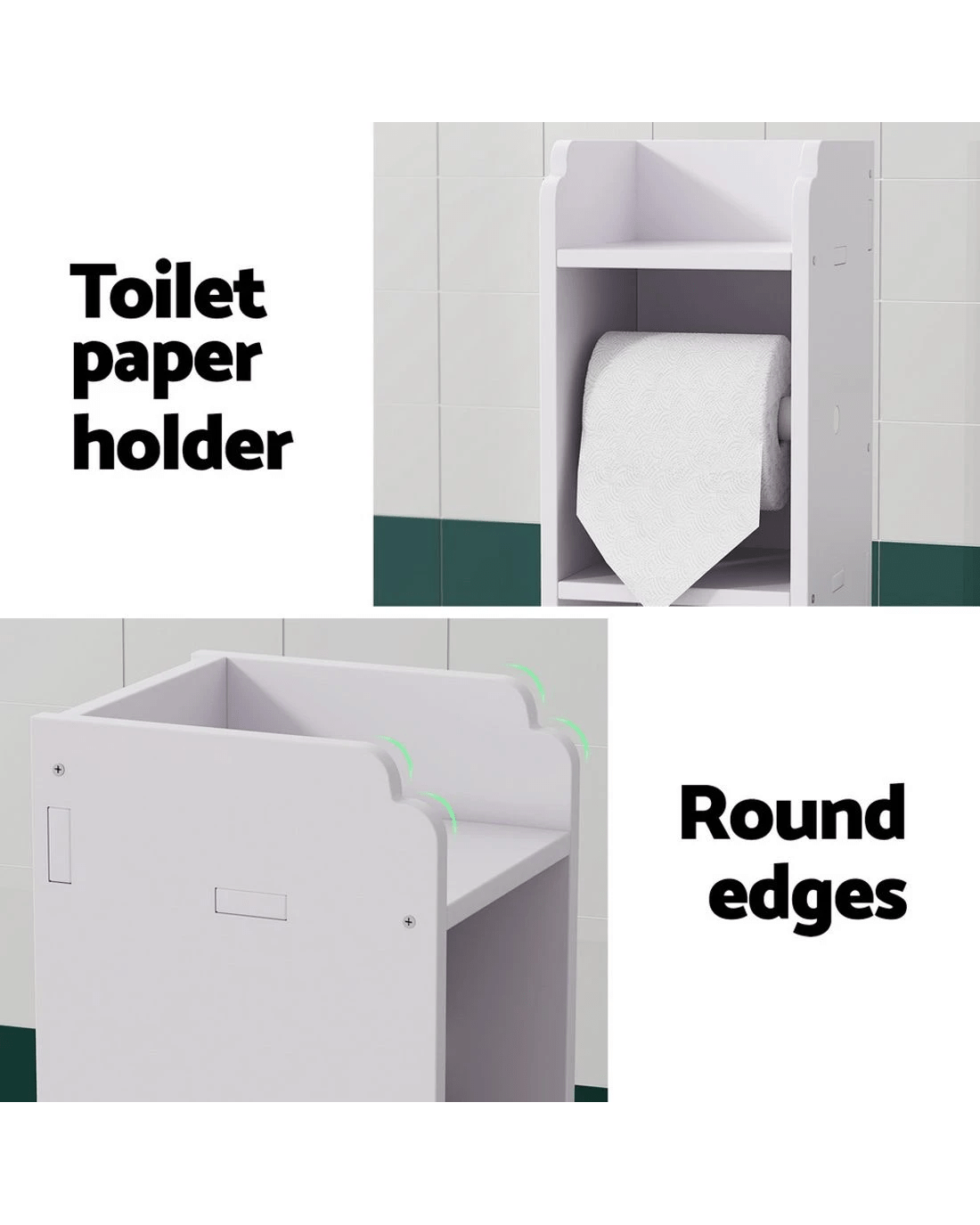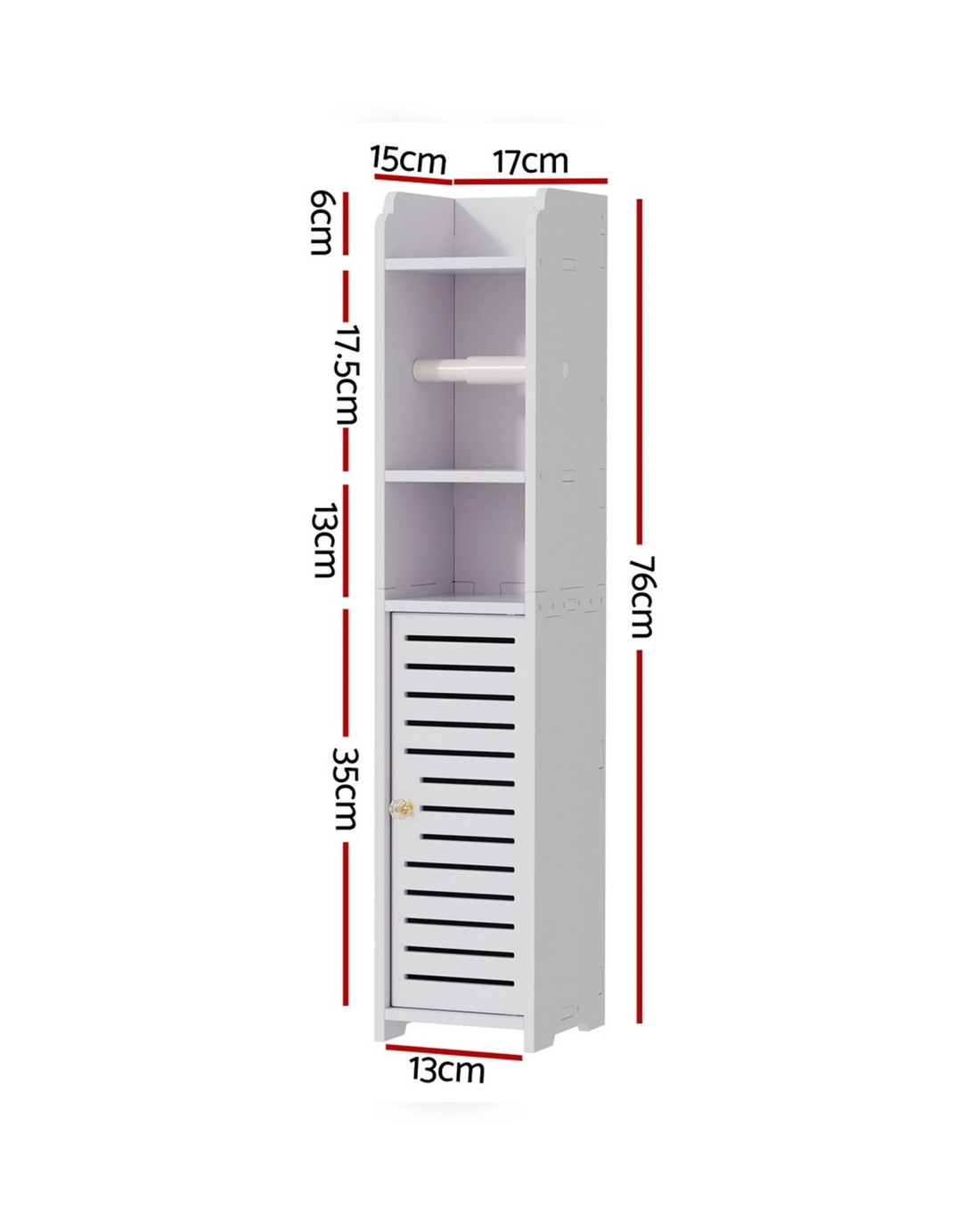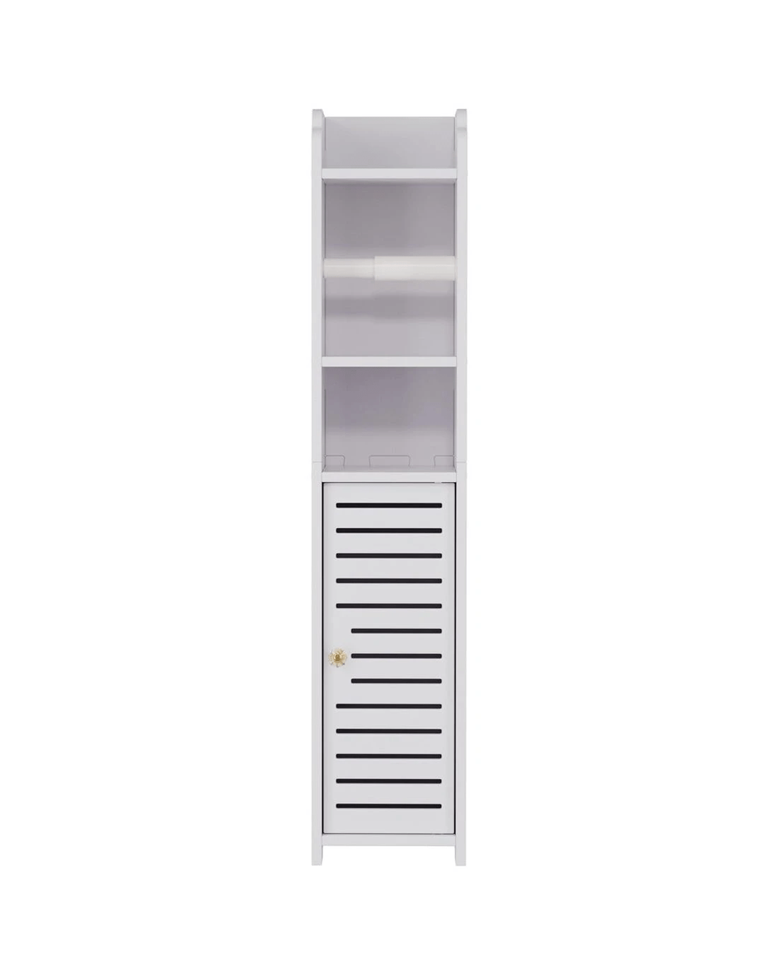 Discover our practical and functional bathroom storage cabinet. The slim cabinet has a space-saving design, meaning it only uses up a tiny bit of floor space and can get into nooks. Made from water-resistant PVC, it features a roll rod for easy access and a bottom cabinet for extra rolls of toilet paper. Simple to assemble and easy to clean, it's an ideal solution for optimizing your bathroom storage.