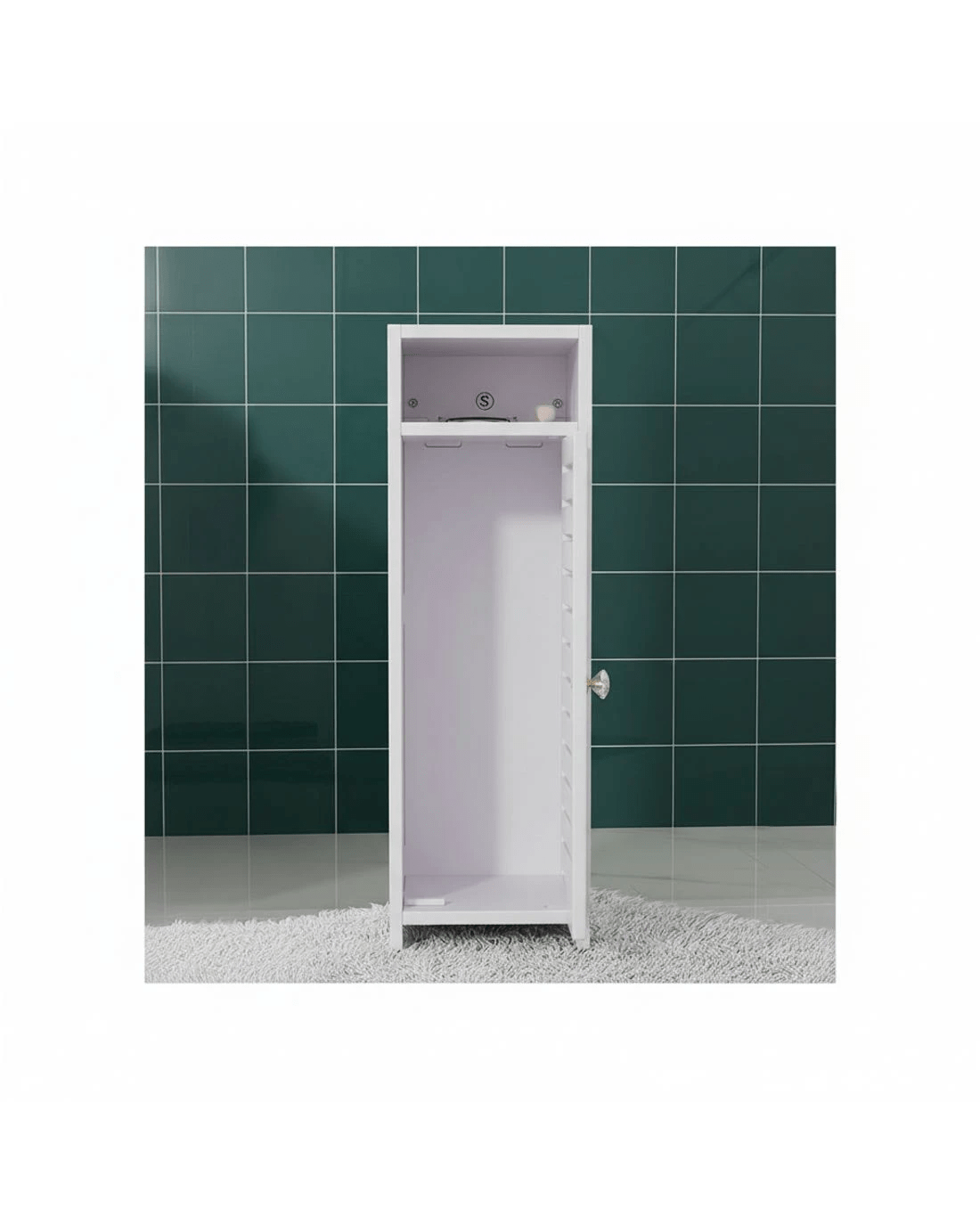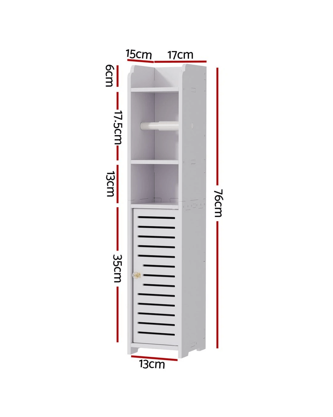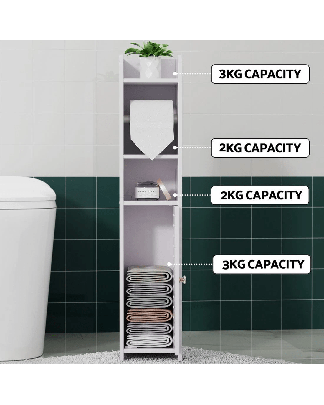 Discover our practical and functional bathroom storage cabinet. The slim cabinet has a space-saving design, meaning it only uses up a tiny bit of floor space and can get into nooks. Made from water-resistant PVC, it features a roll rod for easy access and a bottom cabinet for extra rolls of toilet paper. Simple to assemble and easy to clean, it's an ideal solution for optimizing your bathroom storage.