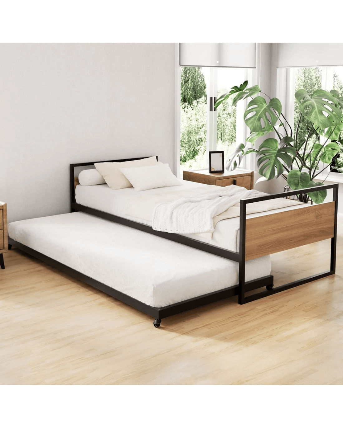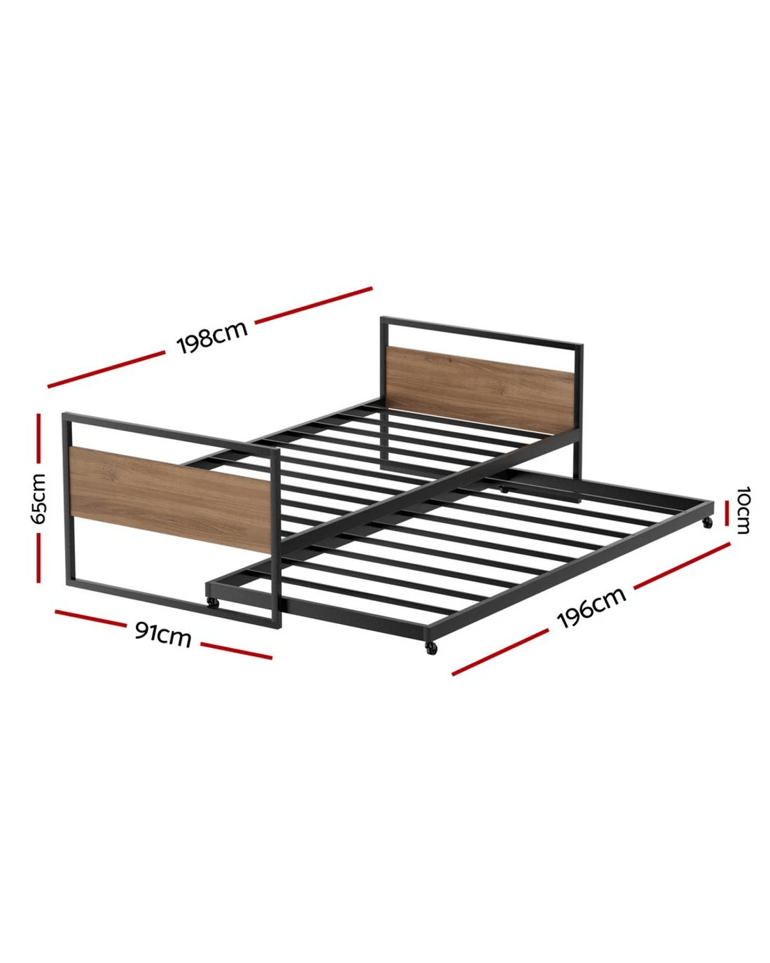 Looking for an affordable bed frame that doesn't compromise on quality or style? Look no further than the DEAN Bed Frame from Artiss. This industrial-style bed frame features an enhanced powder-coated and rust-resistant steel frame with strongly reinforced steel centre slats to keep your mattress securely in place. Topped with a dark wood MDF headboard and foot, this frame creates a clean, classic look that will transform your bedroom into a peaceful oasis of relaxation. The frame features plenty of room underneath for the included trundle bed, which can be placed to the left or right of the bed for a versatile layout. Perfectly fitted slots make the frame easy to assemble while rubber foot caps keep your floors protected from scratches. The simple, industrial-style design ensures that it will complement any bedding or decor you choose to pair it with. Suits Australian standard single-sized mattresses. Practical, functional and stylish, the DEAN Bed Frame from Artiss is an easy purchase.