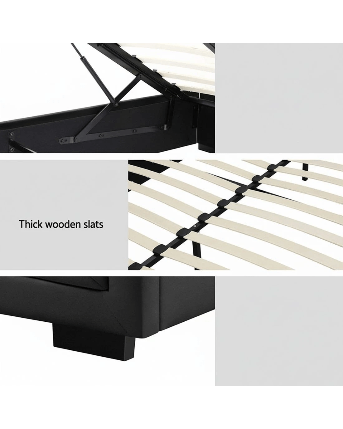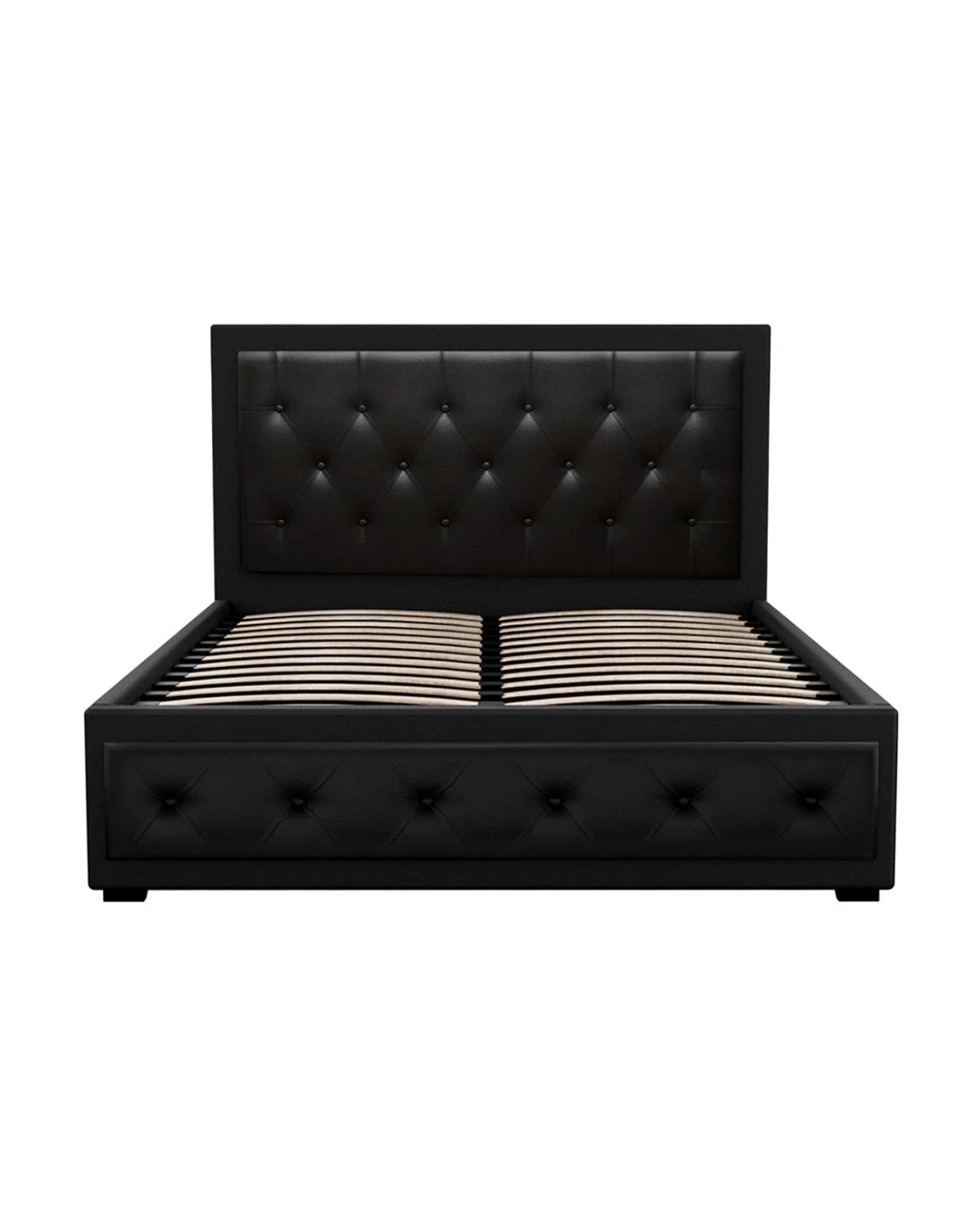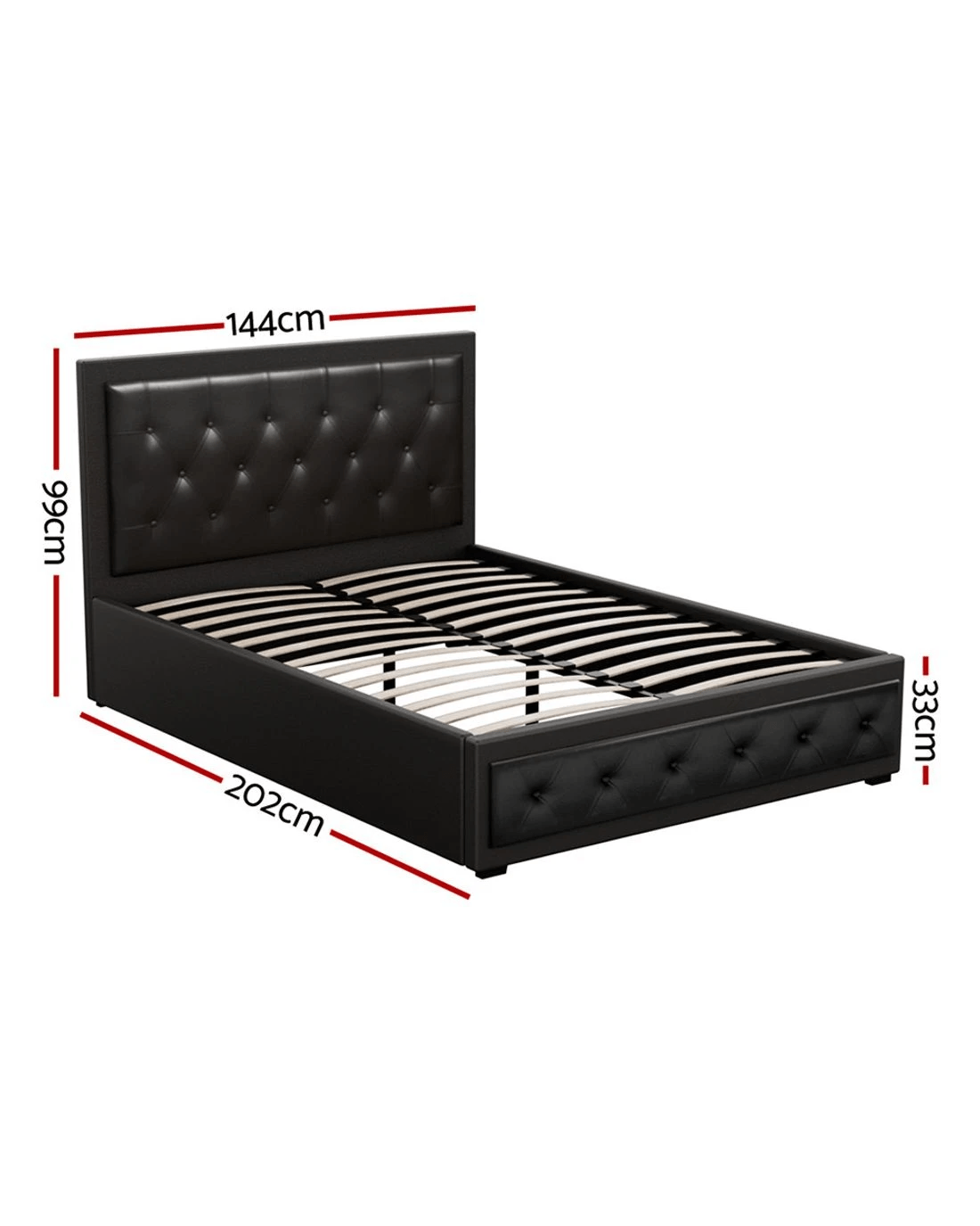 From the outside, our contemporary Artiss Tiyo Gas Lift Bed Frame looks absolutely plush. The premium PVC leather tufted headboard and sides all exudes fine craftsmanship. But there is more to this luxurious bed frame than meets the eye. Lift up the frame and you will find acres of storage space under the wooden arched slat base. The gas lift system and hand strap enable you to effortlessly lift the bed to store all your seasonal beddings and linen such as extra quilts, pillows and comforters and more. The wooden arched slat base is also designed to flex appropriately so that it can better distribute the weight exerted on it. Overall, the bed frame is well-built with reinforced steel bars within its sturdy steel frame. Heavy-duty metal connectors keep the frame sturdy with additional central support from an adjustable centre support beam. Enjoy your wonderful sleep in more ways than one with our innovative Tiyo Gas Lift Bed Frame.