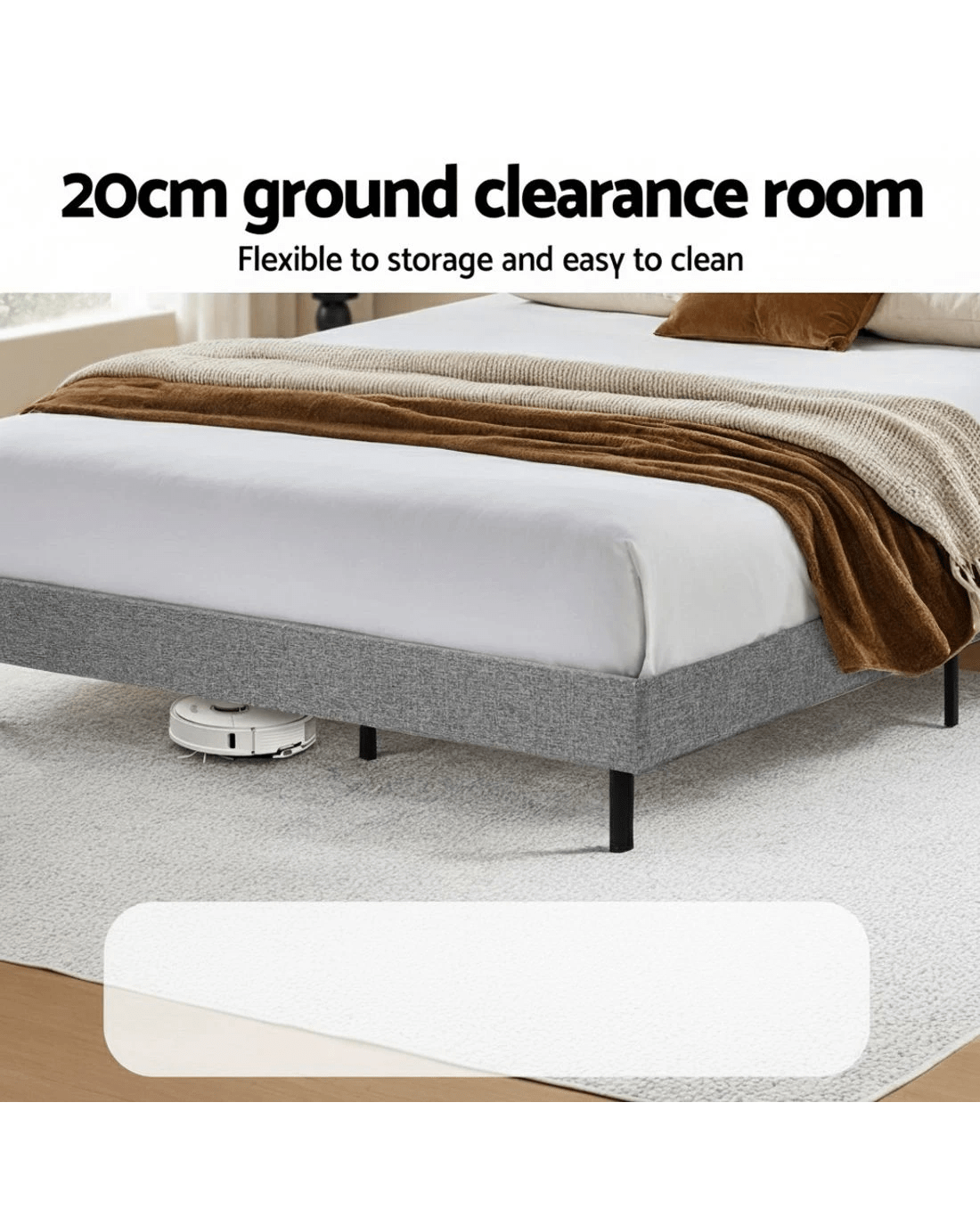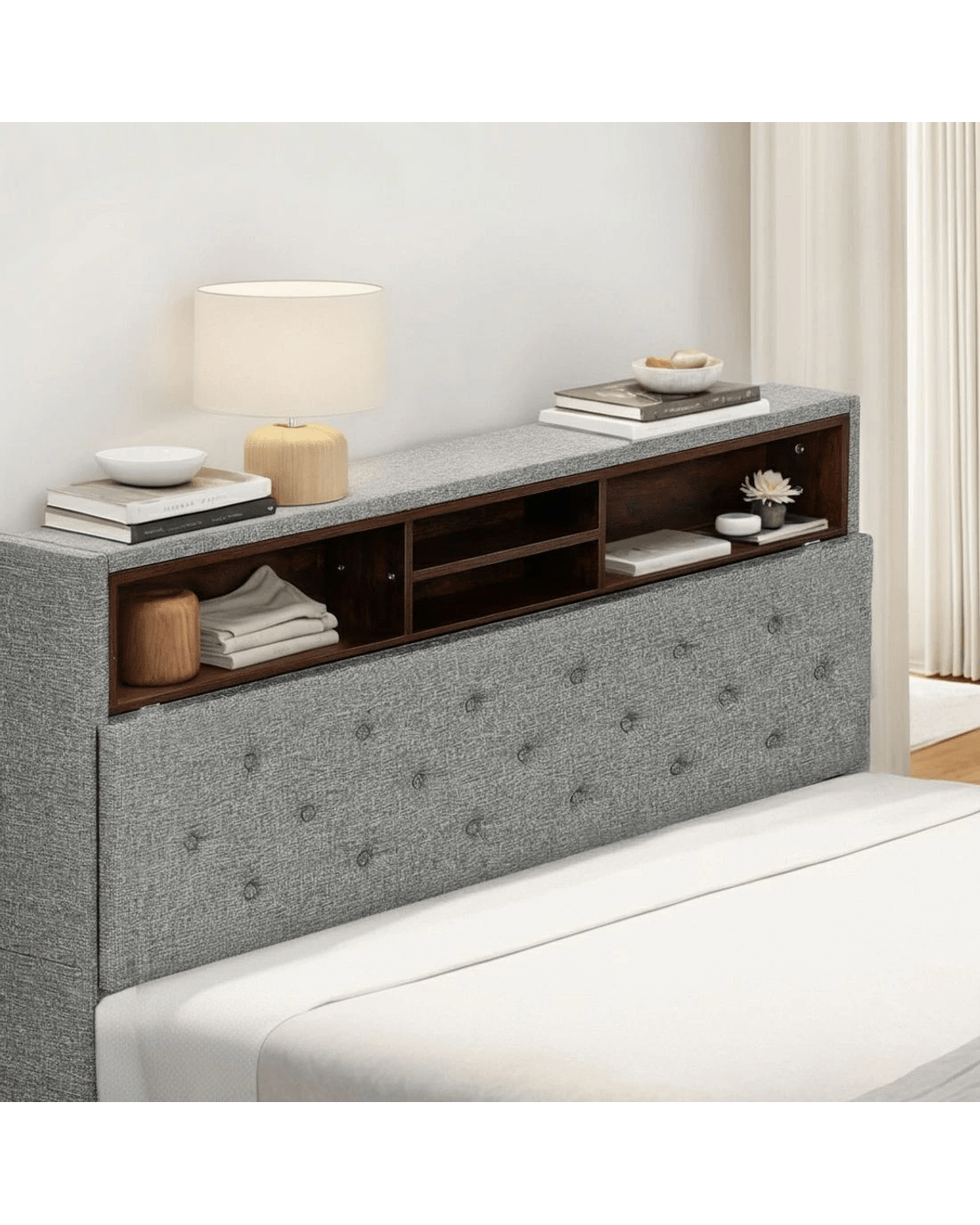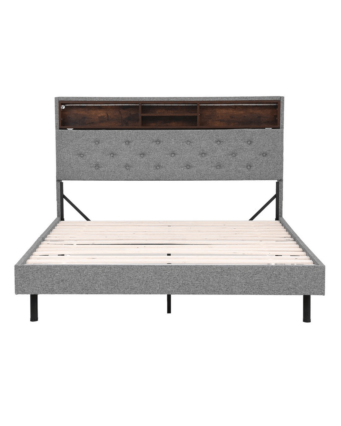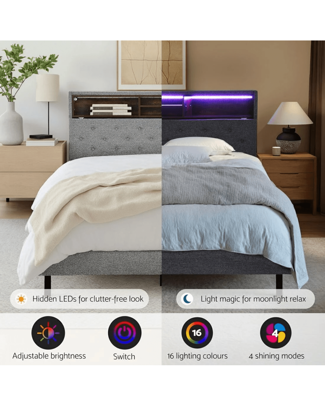 Elevate your bedroom with the Artiss Double Storage Bed Frame. Features smart RGB LED lights offering flexible ambiance settings. The practical headboard provides multi-layer shelving, while discreet under-bed space offers ample storage. Relax against the comfortable padded and tufted headboard. Built with a durable timber and steel frame and supportive LVL slats, this reliable platform bed frame supports double mattresses. The modern grey faux linen finish complements contemporary decor. Assembly is straightforward.