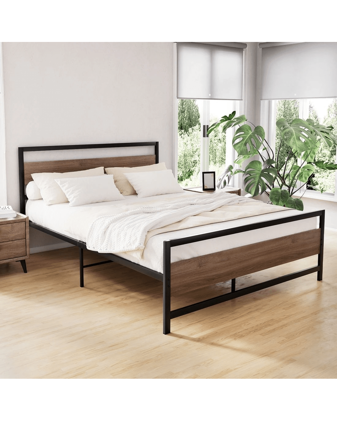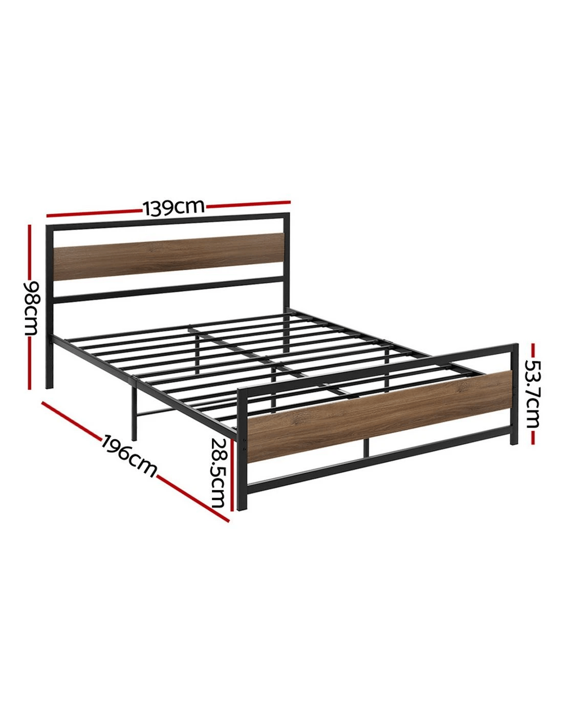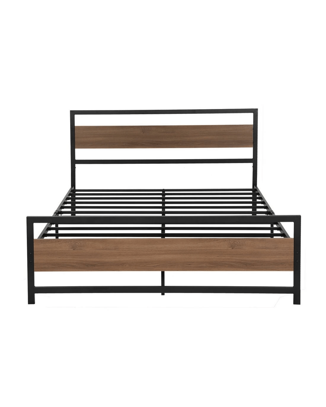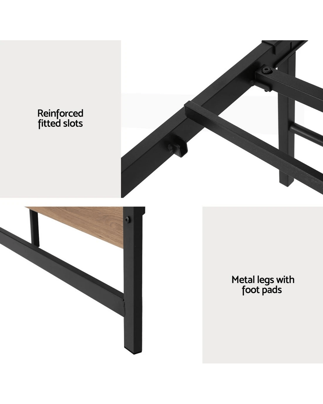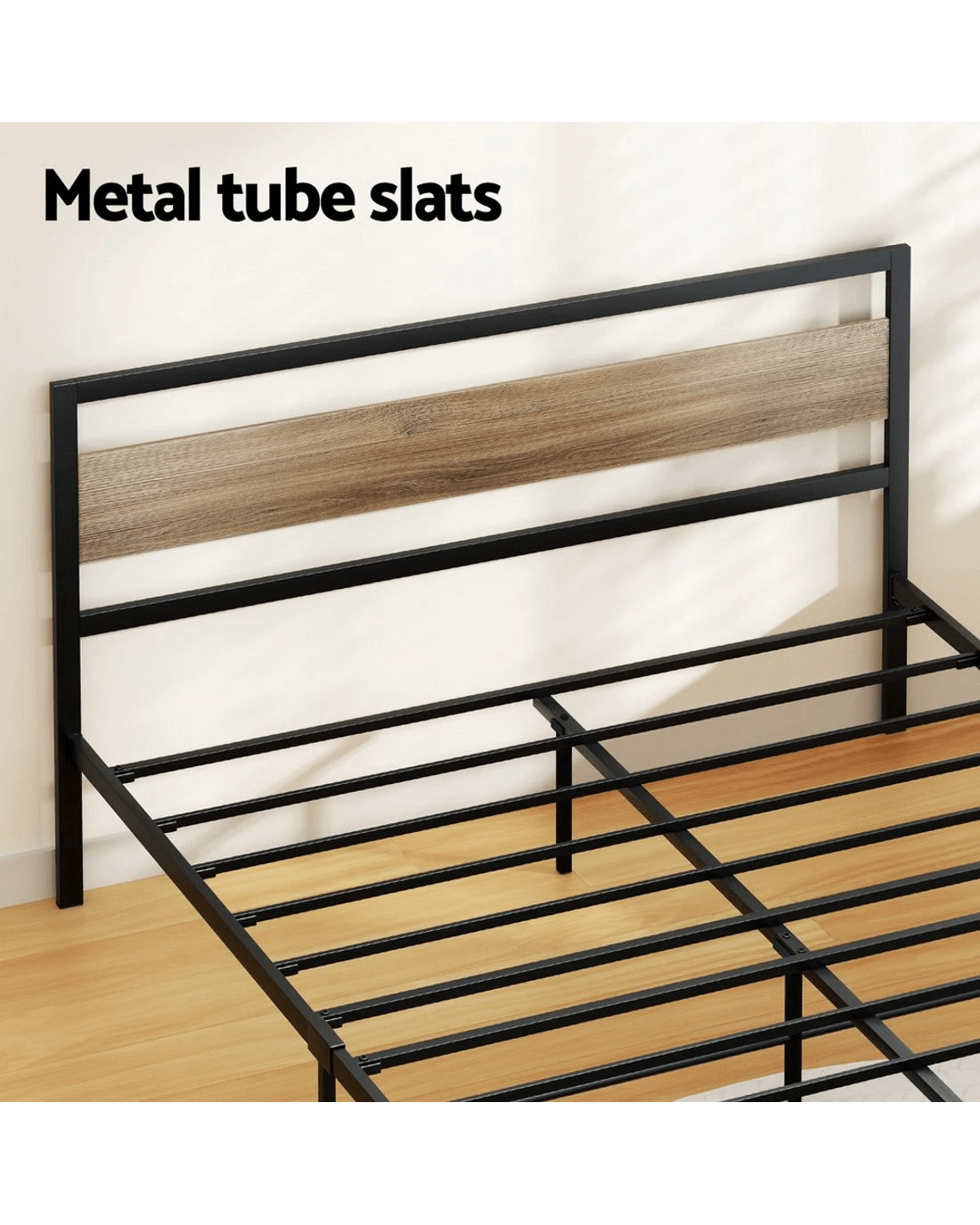 Looking for an affordable bed frame that doesn't compromise on quality or style? Look no further than the DREW Bed Frame from Artiss. This industrial-style bed frame features an enhanced powder-coated and rust-resistant steel frame with strongly reinforced steel centre slats to keep your mattress securely in place. Topped with a pale wood MDF headboard and foot, this frame creates a clean, classic look that will transform your bedroom into a peaceful oasis of relaxation. It features ample space underneath to fit trundle drawers or other storage solutions, perfect for keeping your bedroom tidy. Perfectly fitted slots make the frame easy to assemble while rubber foot caps keep your floors protected from scratches. The simple, industrial-style design ensures that it will complement any bedding or decor you choose to pair it with. Practical, functional and stylish, the DREW Bed Frame from Artiss is an easy purchase.