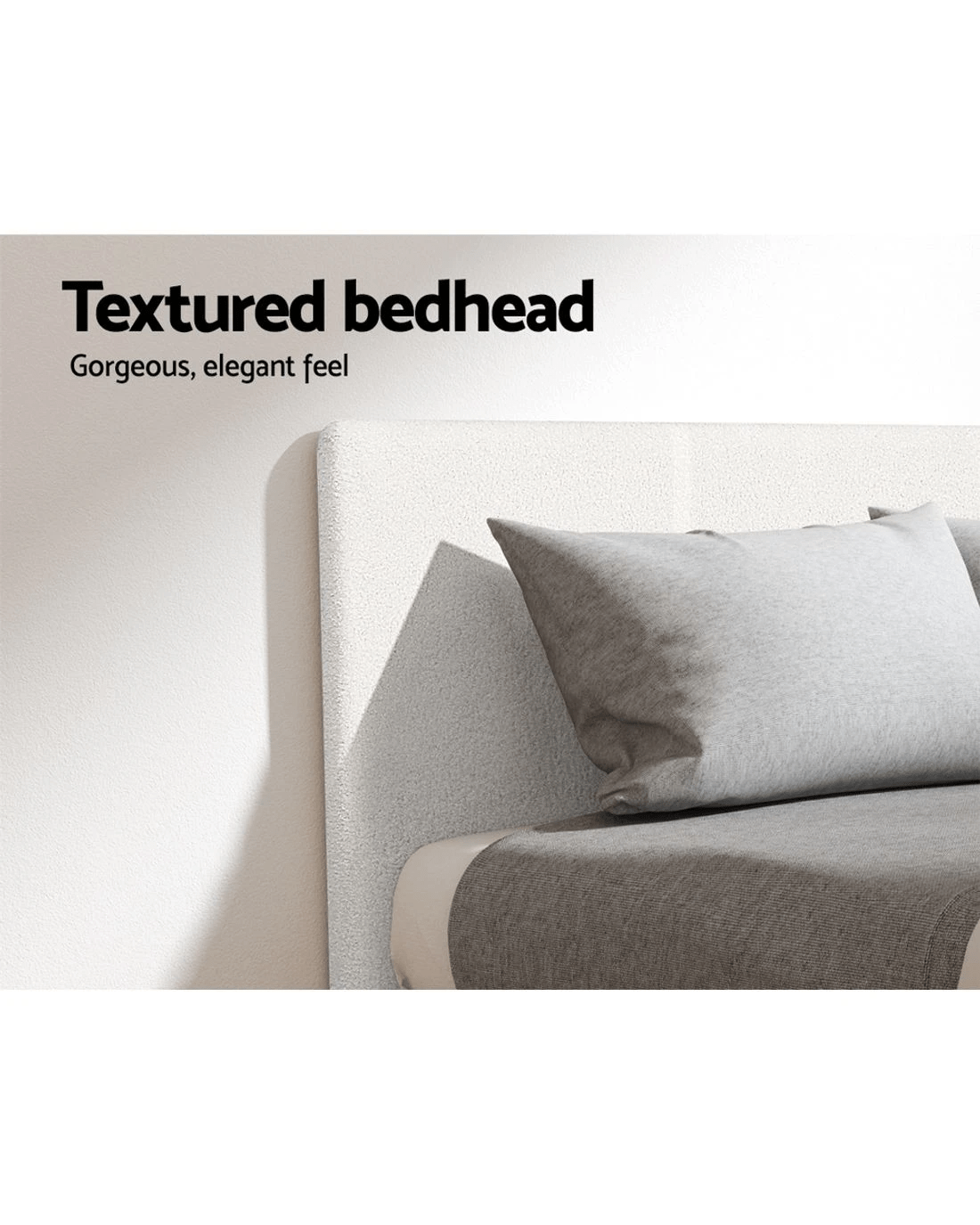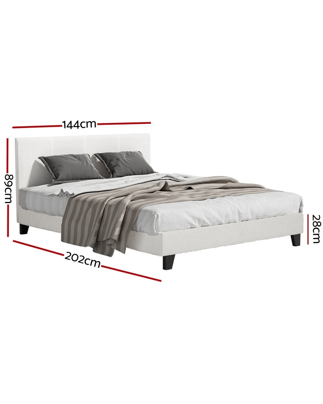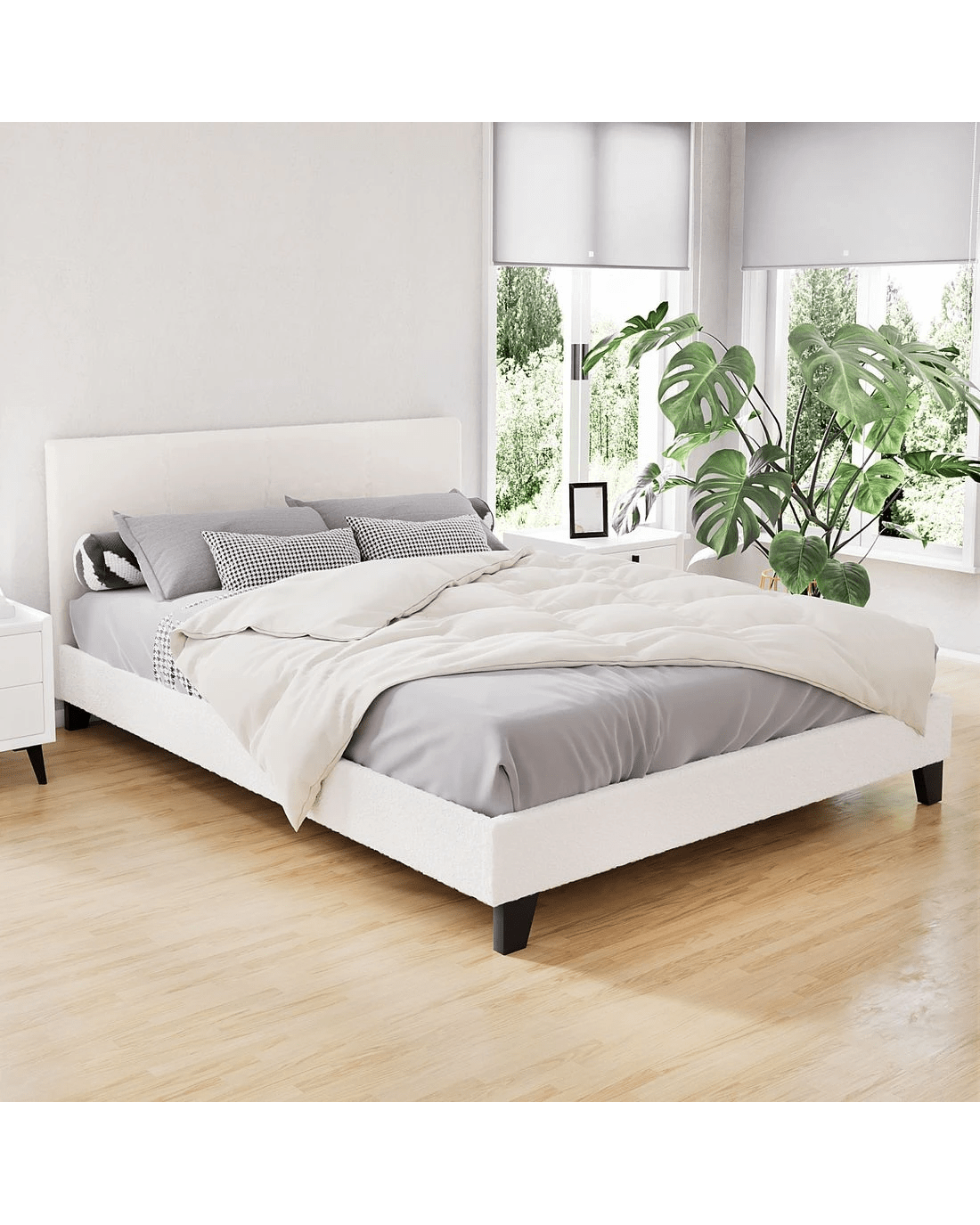 Add a touch of cosiness to your bedroom with our Artiss Neo bed frame. Wrapped in premium boucle fabric, the bed frame is aesthetically pleasing and extremely pleasant and smooth to touch. It will make you feel comfortable. The bed frame comes attached with a textured bed head. It has high-density foam padding, which makes it a cosy spot to sit back and relax, watch a movie, or read a book. Furthermore, the wooden arched slatted base allows the bed flex properly. It prevents partner disturbance. The slats are quite thick and will provide good support to your mattress. This bed frame has premium heavy-duty metal fixings and solid legs. So you don not have to worry about stability. It will keep the bed stable and prevent shaking. Additionally, this bedframe is available in single, king single, double, and queen and fits Australian standard size mattresses. And the gorgeous cream shade enables you to style it in any bedroom style. It will seamlessly blend in your home decoration.