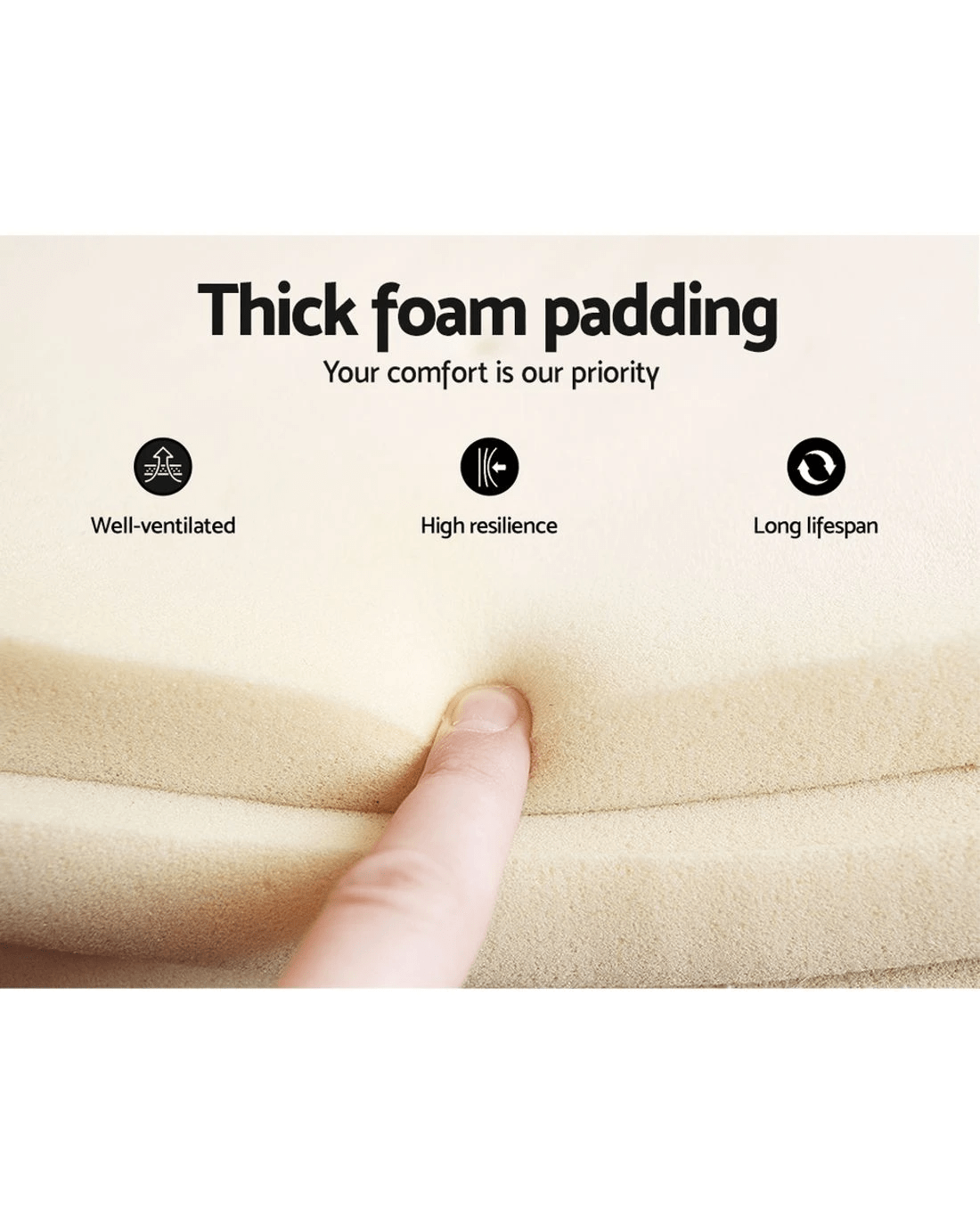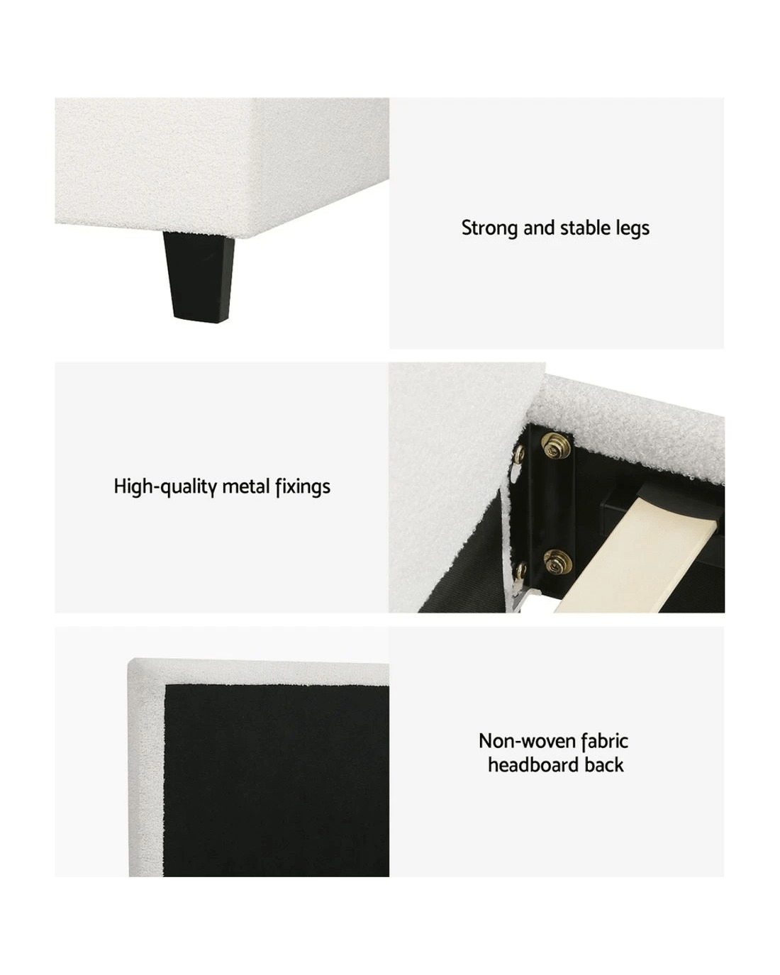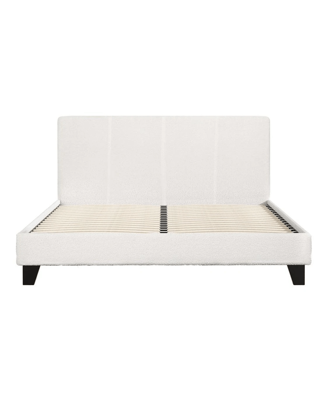 Add a touch of cosiness to your bedroom with our Artiss Neo bed frame. Wrapped in premium boucle fabric, the bed frame is aesthetically pleasing and extremely pleasant and smooth to touch. It will make you feel comfortable. The bed frame comes attached with a textured bed head. It has high-density foam padding, which makes it a cosy spot to sit back and relax, watch a movie, or read a book. Furthermore, the wooden arched slatted base allows the bed flex properly. It prevents partner disturbance. The slats are quite thick and will provide good support to your mattress. This bed frame has premium heavy-duty metal fixings and solid legs. So you don not have to worry about stability. It will keep the bed stable and prevent shaking. Additionally, this bedframe is available in single, king single, double, and queen and fits Australian standard size mattresses. And the gorgeous cream shade enables you to style it in any bedroom style. It will seamlessly blend in your home decoration.
