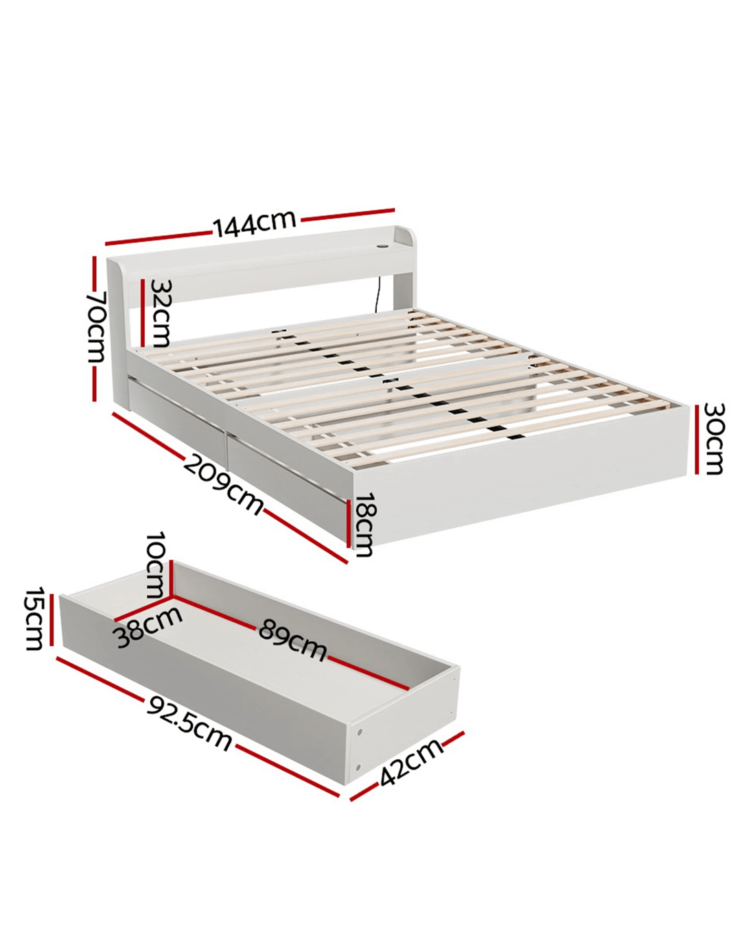 It's easy to sleep well on the Artiss Aura Bed Frame. Made from thick 15mm and 18mm particleboard with 12mm plywood slats and a white paper finish, the bed frame is designed for long-lasting use and longer-lasting sleep. The thick plywood slats and centre beams provide total support, and noise-free use, and improve the life of your mattress. It features a multifunctional design that allows you to use the bed for storage and to charge your phone overnight. Two drawers with smooth castor wheels can be installed on the left or the right for convenient storage. The headboard has smooth edges and plenty of room for your bedroom essentials. It also features two USB charging ports connected to a 200cm cable for convenience. While you power down for the night, you can power up with the Aura Bed Frame from Artiss.