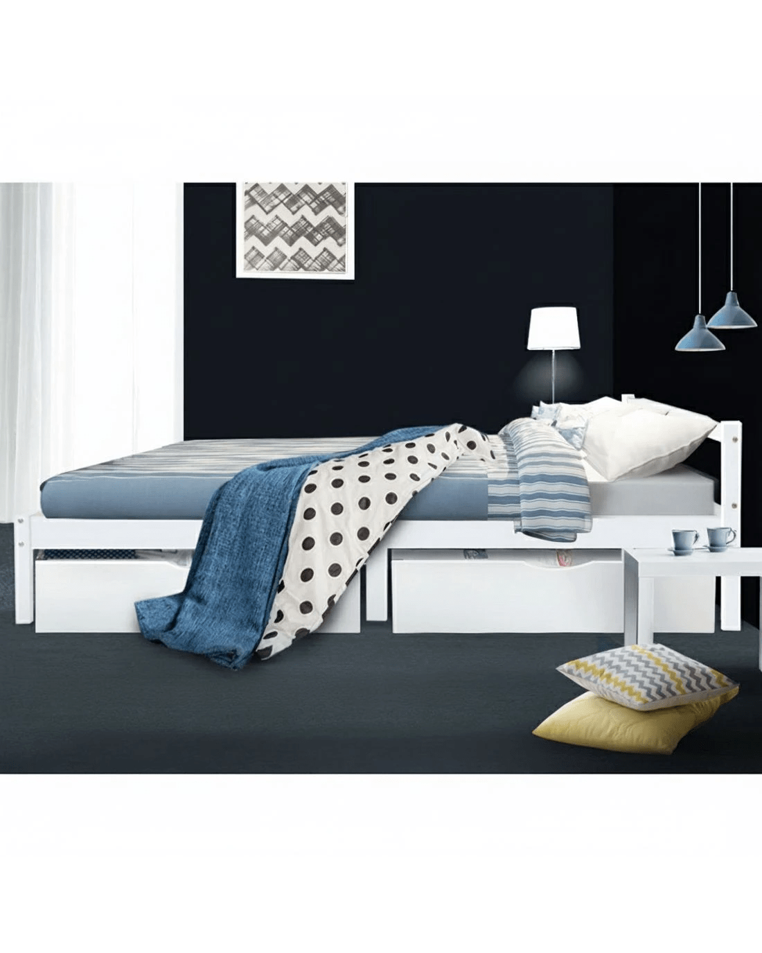 Strong and sturdy, the Bed Frame comes with a durable plywood slated base, reinforced angled brackets for long term support, stylish headboard, heavy-duty steel fixings and smooth edges all round. Finished in a non-toxic, eco-friendly white paint, the neutral-coloured Bed Frame makes for easy décor coordination with any bedroom. Better still, the Bed Frame also has ample space below to fit in a pair of optional trundle drawers for extra storage of bedding essentials.