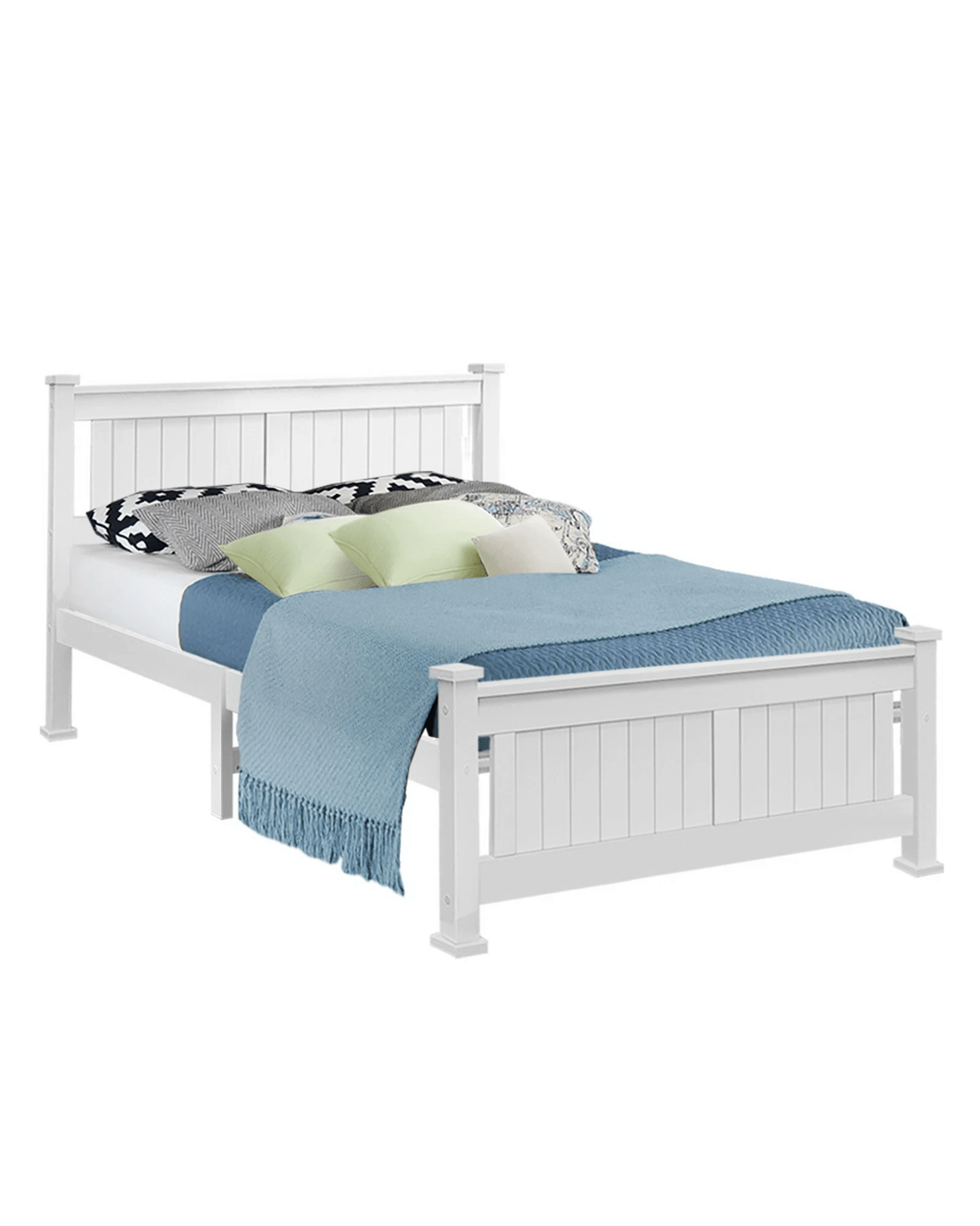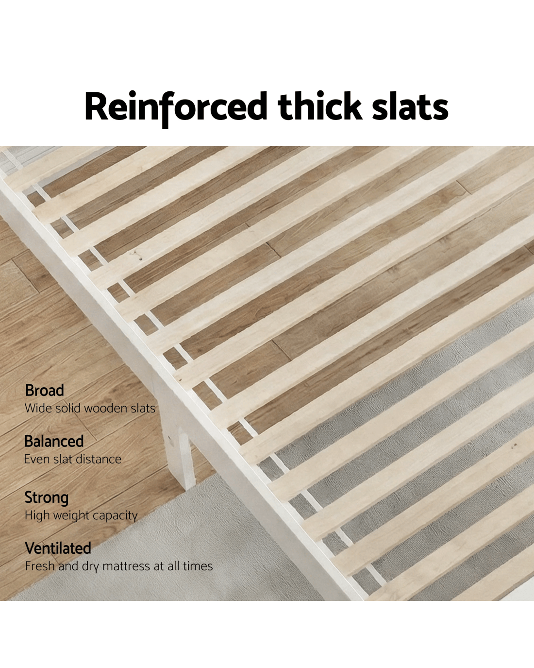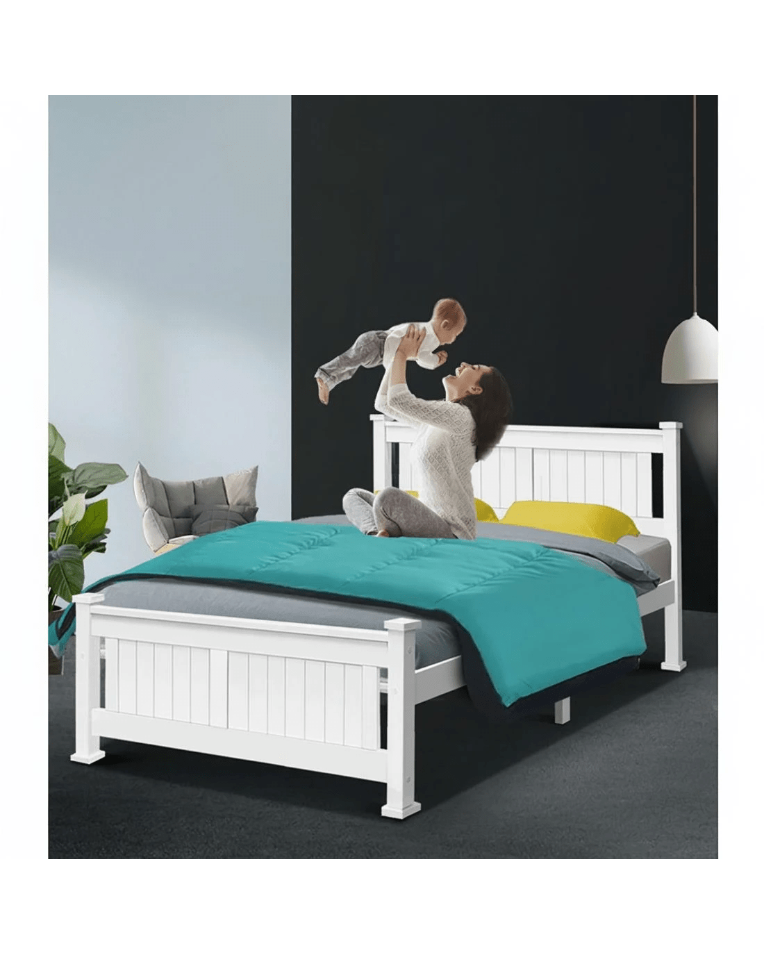Made of natural pine wood, the Rio bed frame is ideal for your kids as it for any adult. Strong and sturdy, the bed frame comes with a solid timber slated base, stylish headboard, heavy duty steel fixings and smooth edges all round. Finished in a non-toxic, eco-friendly white paint, the neutral coloured bed frame makes for easy décor coordination with any bedroom. So, the next time you need a durable and contemporary bed frame that has quality written all over it, make it a Rio bed frame from ozplaza.living. We make living great.