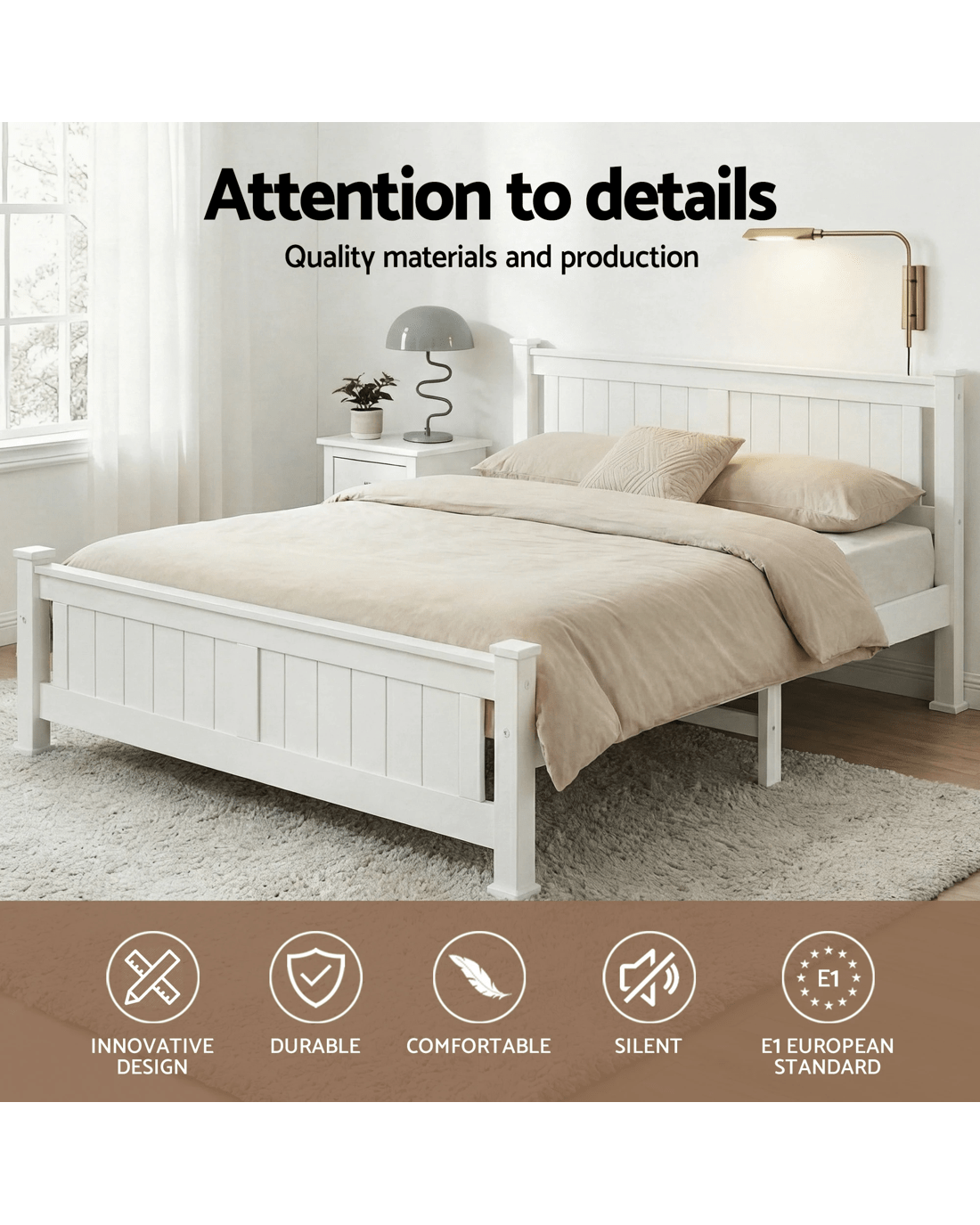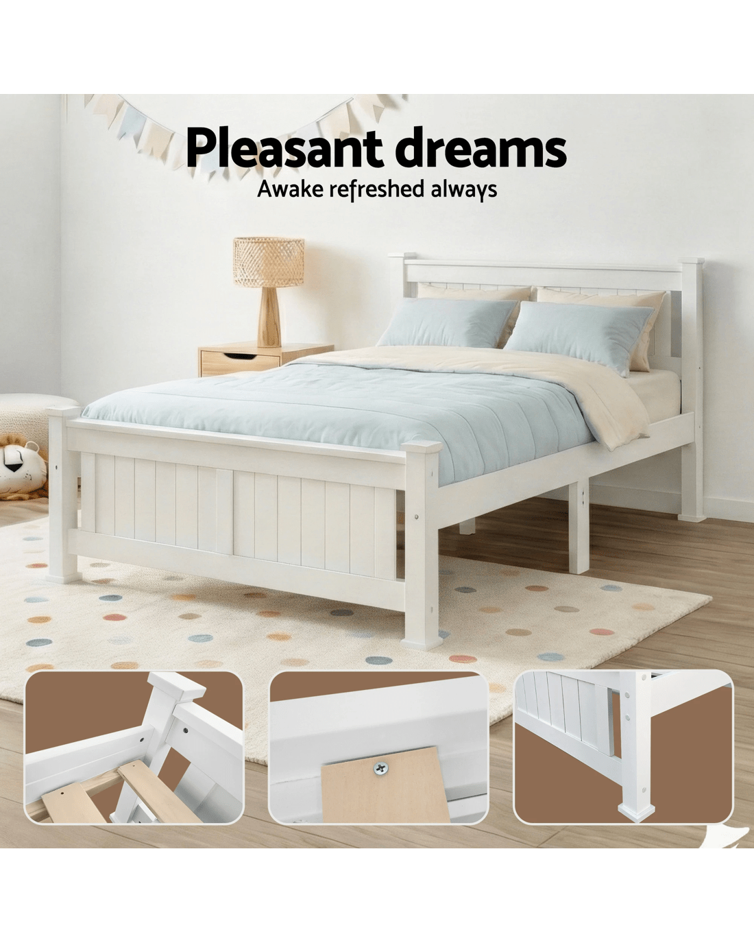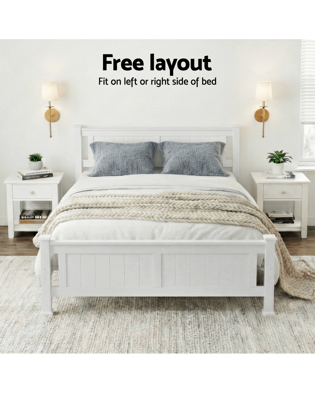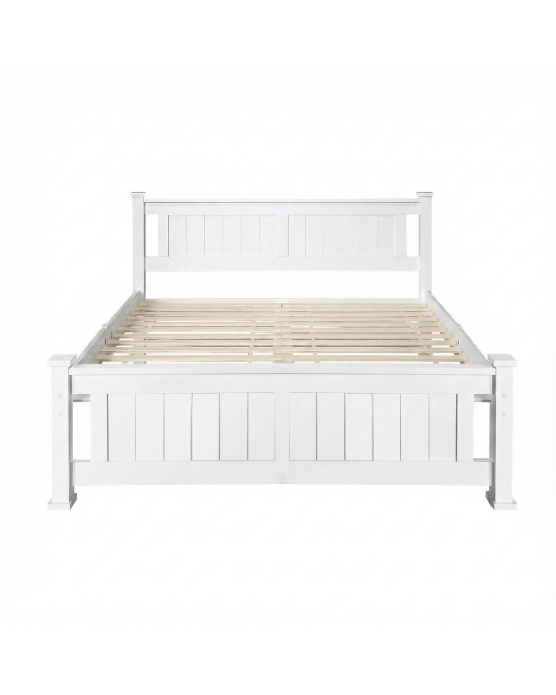Made of natural pine wood, the Rio bed frame is ideal for your kids as it for any adult. Strong and sturdy, the bed frame comes with a solid timber slated base, stylish headboard, heavy duty steel fixings and smooth edges all round. Finished in a non-toxic, eco-friendly white paint, the neutral coloured bed frame makes for easy décor coordination with any bedroom. So, the next time you need a durable and contemporary bed frame that has quality written all over it, make it a Rio bed frame from ozplaza.living. We make living great.