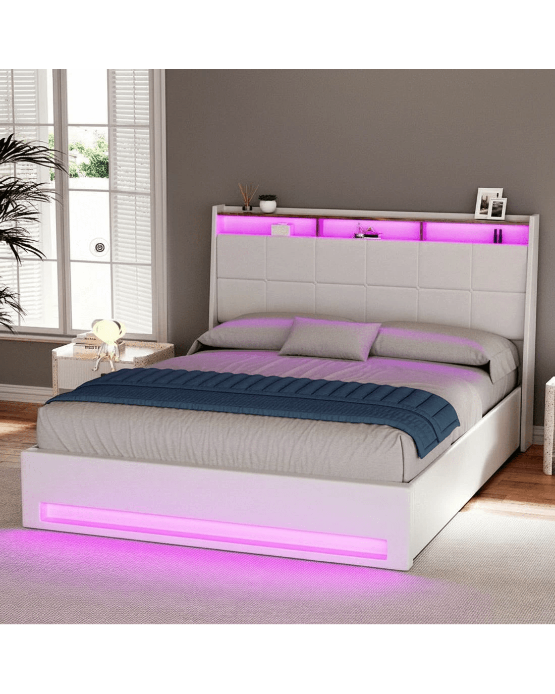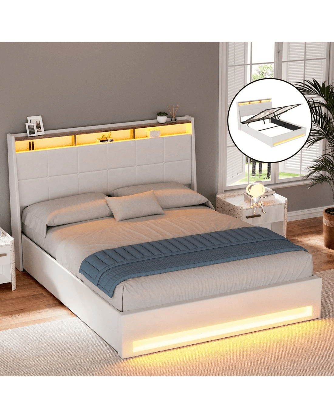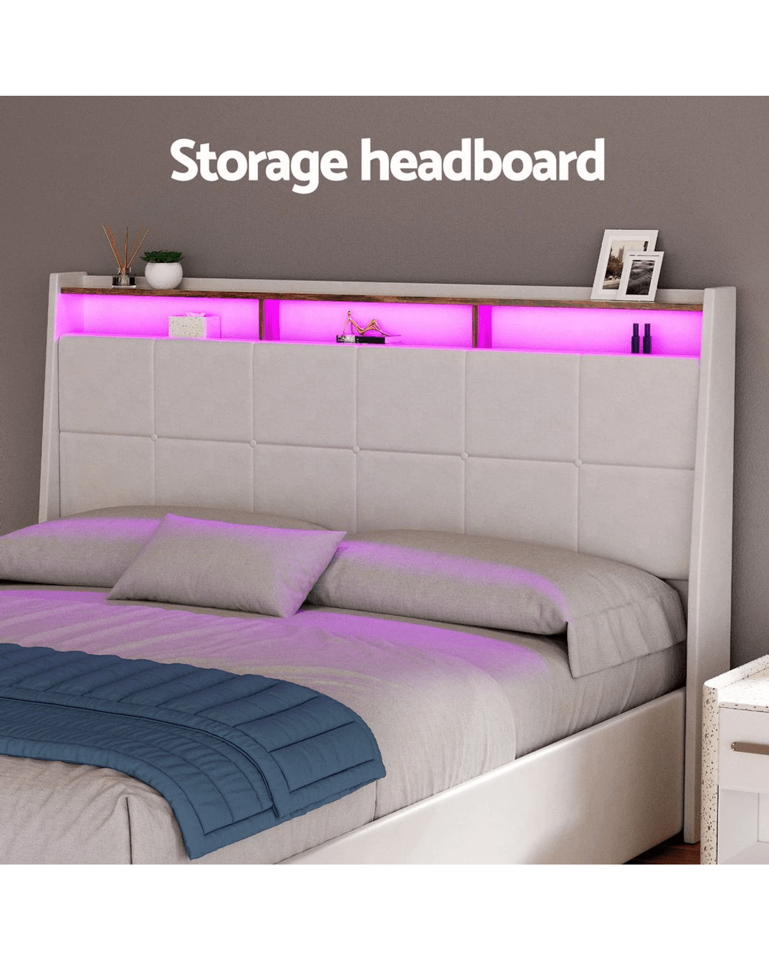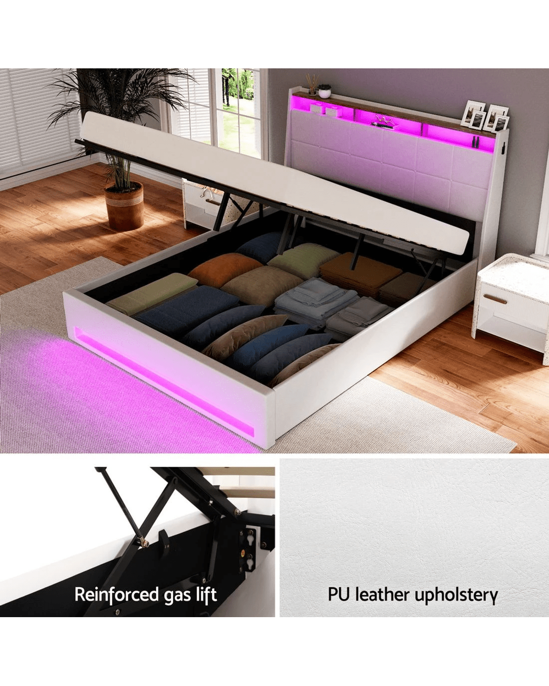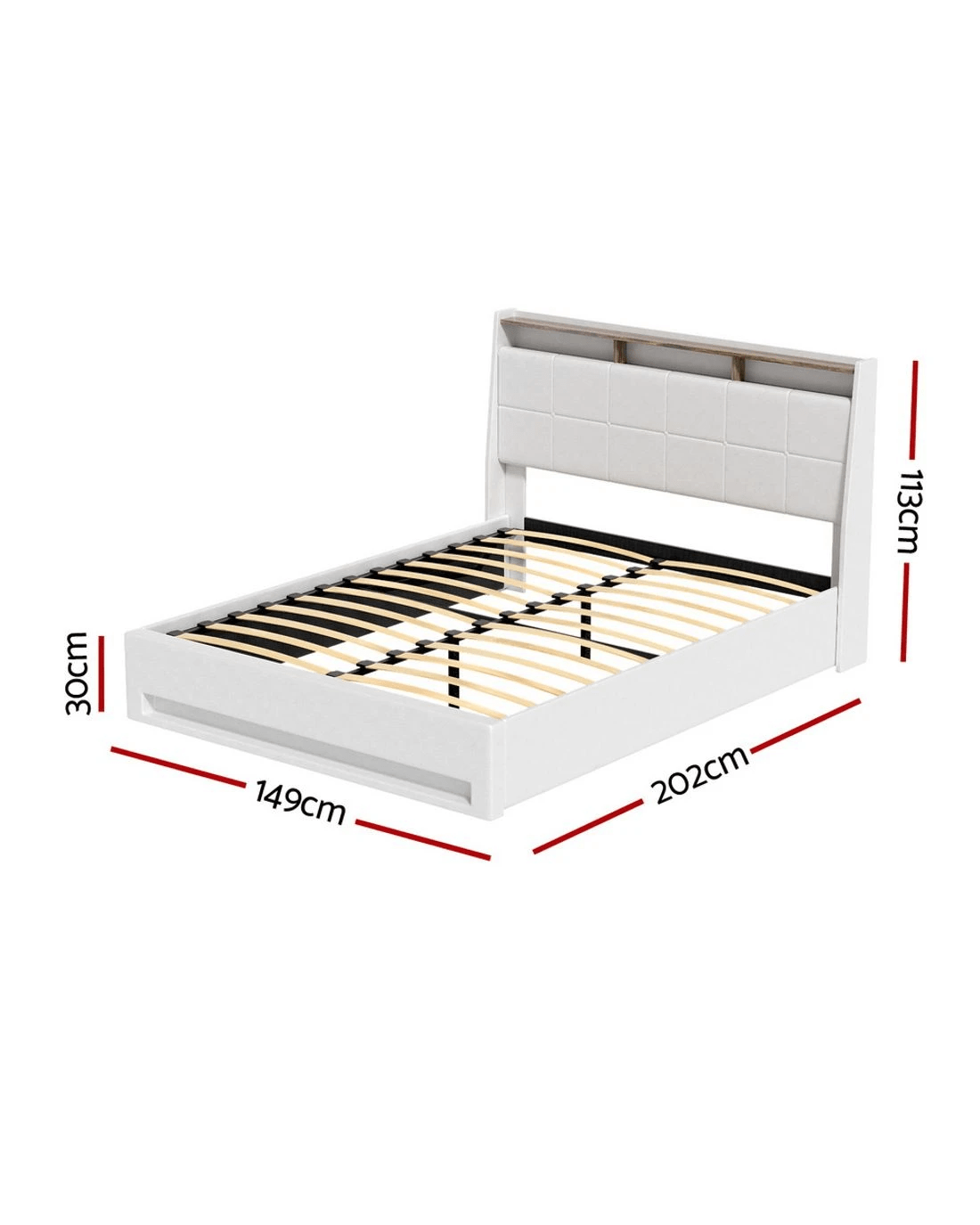 Sold by Aisle SixArtiss Bed Frame Gas Lift LED Beds Base Platform PVC Leather Storage Headboard - White