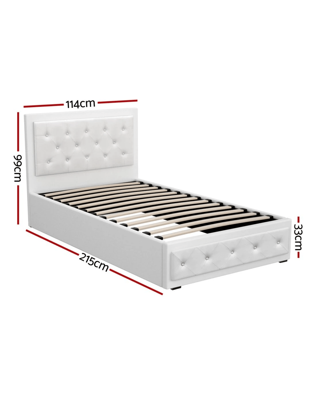 From the outside, our contemporary Artiss Tiyo Gas Lift Bed Frame looks absolutely plush. The premium PVC leather tufted headboard and sides all exudes fine craftsmanship. But there is more to this luxurious bed frame than meets the eye. Lift up the frame and you will find acres of storage space under the wooden arched slat base. The gas lift system and hand strap enable you to effortlessly lift the bed to store all your seasonal beddings and linen such as extra quilts, pillows and comforters and more. The wooden arched slat base is also designed to flex appropriately so that it can better distribute the weight exerted on it. Overall, the bed frame is well-built with reinforced steel bars within its sturdy steel frame. Heavy-duty metal connectors keep the frame sturdy. Enjoy your wonderful sleep in more ways than one with our innovative Tiyo Gas Lift Bed Frame.