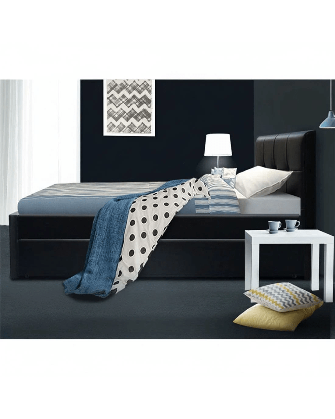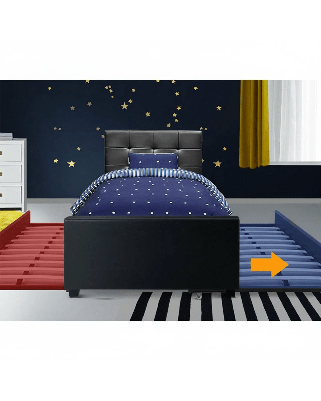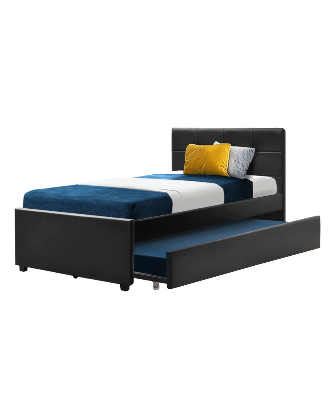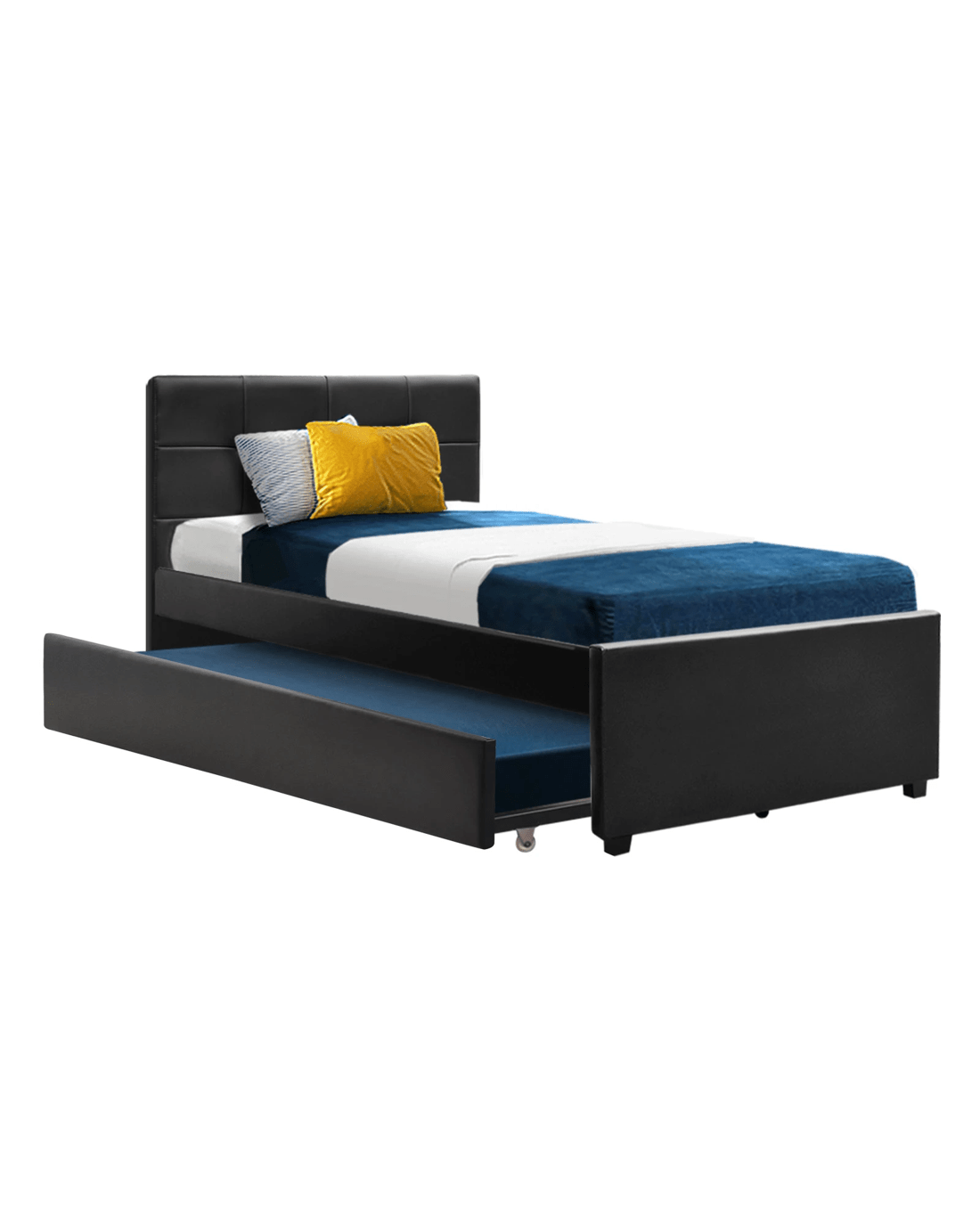 Well, not if you have our Artiss Fripp Trundle Bed Frame. When not in use, the spare bed is stored under the normal bed. Come the time to use it, just slide it out from either side and the extra bed is ready to welcome your weary guest. Both bed frames are made of wood with quality arched plywood slats and heavy-duty metal connectors. Plus, the integrated assembly is beautifully crafted with smooth edges and upholstered in premium black PVC leather to easily match any home décor. The bedhead also features a tufted design for timeless appeal.
