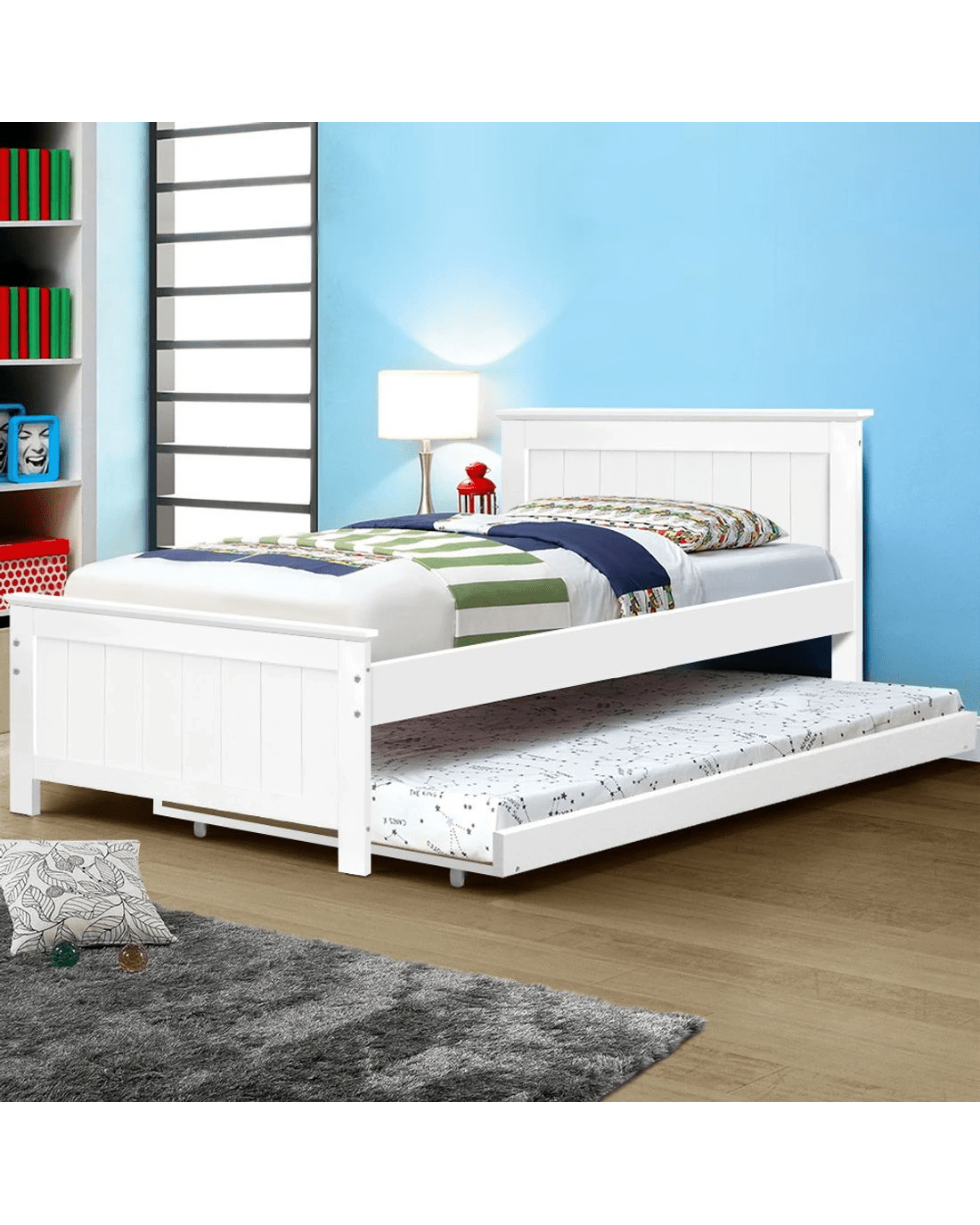 Sometimes finding the space to store a spare bed can be a hassle if your home is already a 'full house'. And when friends and relatives drop by to spend a night or two, it can be a real dilemma getting them an extra bed. Well, not if you have our Artiss Elvis Trundle Bed. When not in use, the spare bed is stored under the normal bed. Comes the time to use it, just slide it out on either side and the extra bed is ready to welcome your weary guest. Both bed frames are made of solid pine wood with quality timber slats to spread the weight evenly. Not least, the bed frames are designed to fit Australian king single-sized mattresses with minimum hassle.